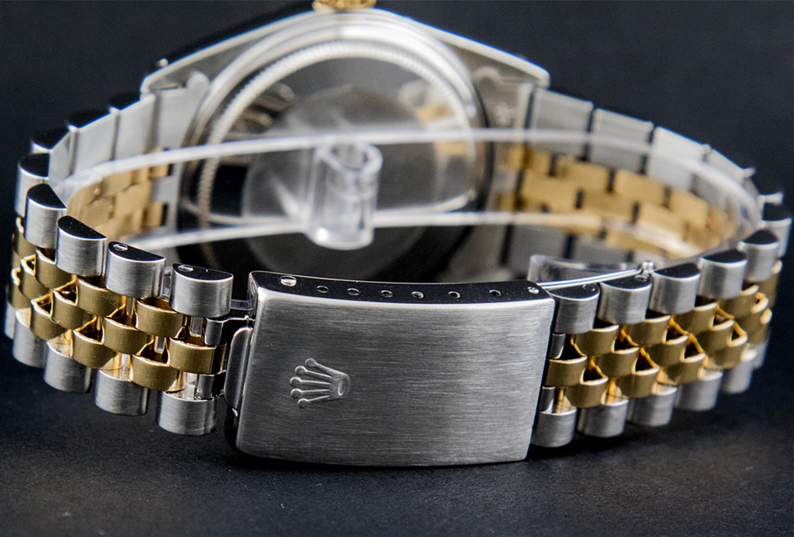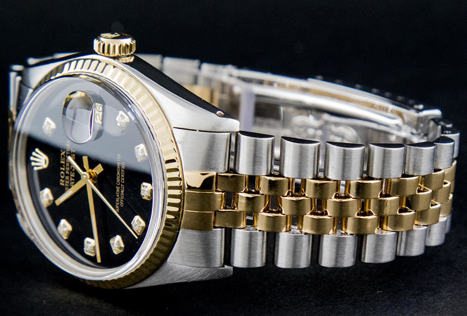One Mens Pre Owned Yellow Gold Two Tone Rolex Datejust Polished, Serviced & Electronically Tested, Rolex Yellow Gold & Stainless Steel Case: 36mm, Rolex Yellow Gold Crown, Rolex Bezel: Yellow Gold Fluted Bezel. Custom Crystal: New Acrylic Cyclops Lens. Custom Hands: New Luminecent Hands. Rolex Movement: Automatic Winding Movement. Custom Dial: Refinished To Black With Added Diamond Hour Markers, Diamond Count: 10 Diamonds In Dial, Color: G to H, Clarity: SI-VS. Date Window: 3 O'Clock Position Date Display, Quickset, Model: Condition: G-6 Extra Fine. Rolex Bracelet: Two Tone Yellow Gold & Stainless Steel Jubilee Band. Bright Polish. 7.0 Inch Length, Adjustable. Standard Clasp, With Rolex Logo. This Watch Has Been Serviced Time Tested And Is In Excellent Condition It Is Free Of All Scratches And Dents.