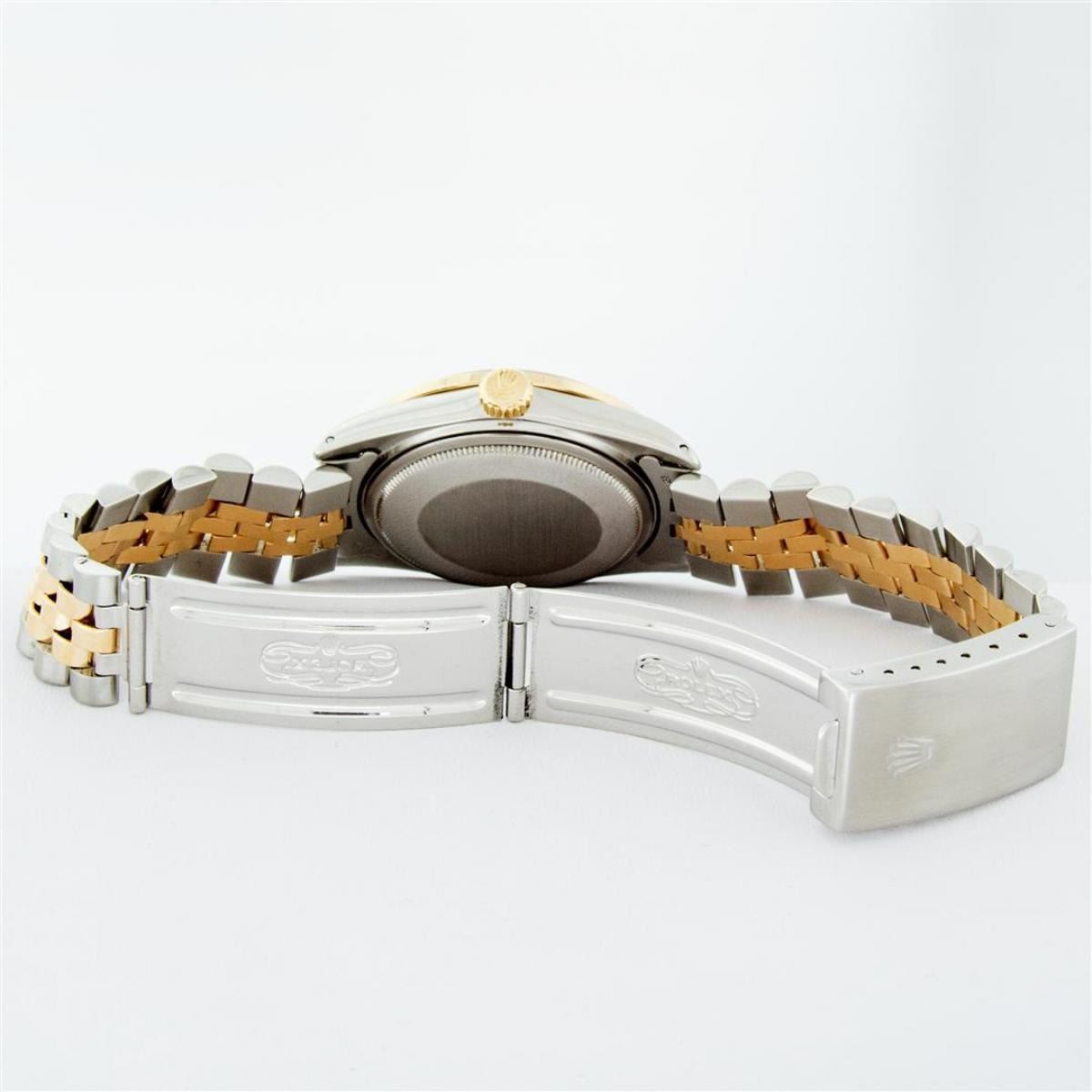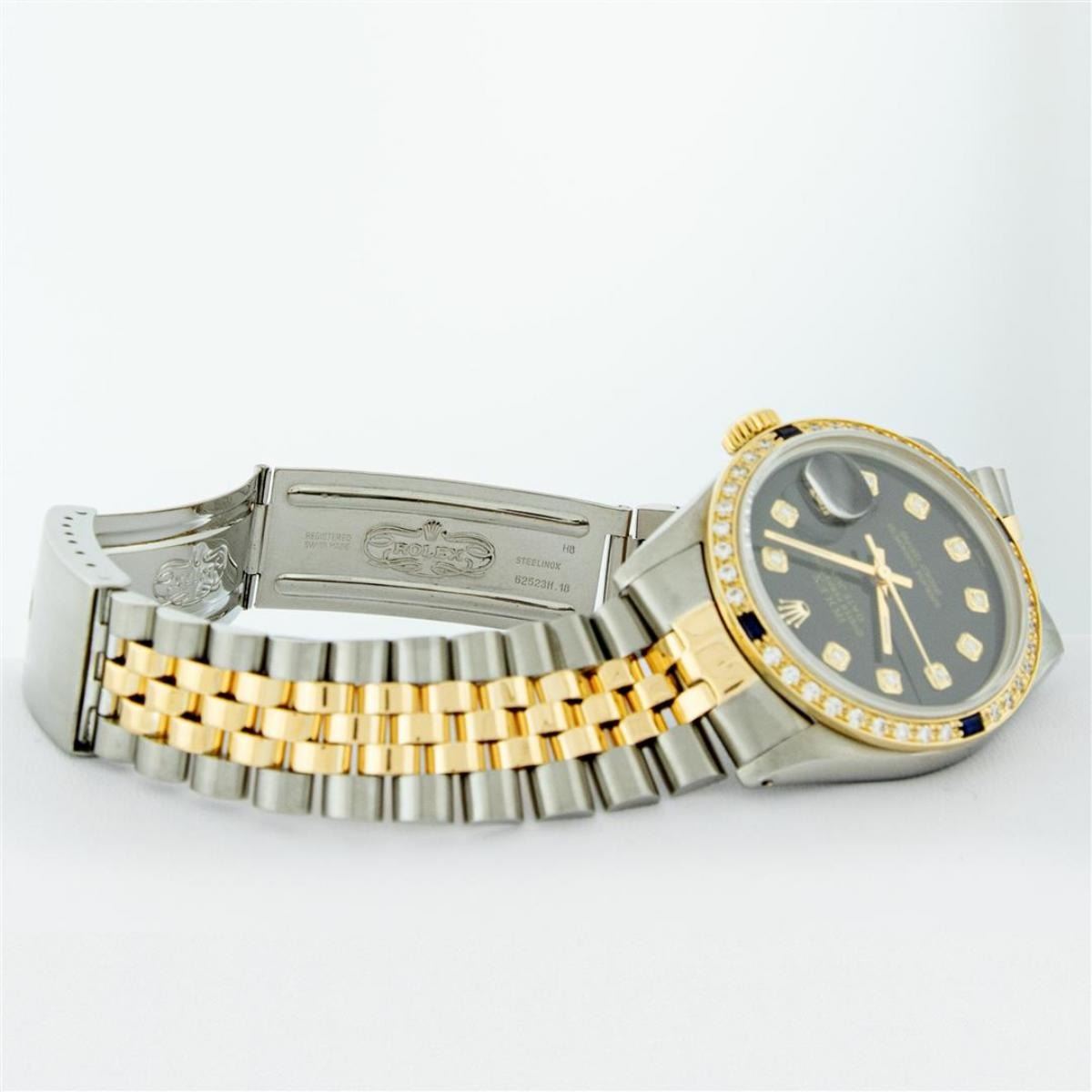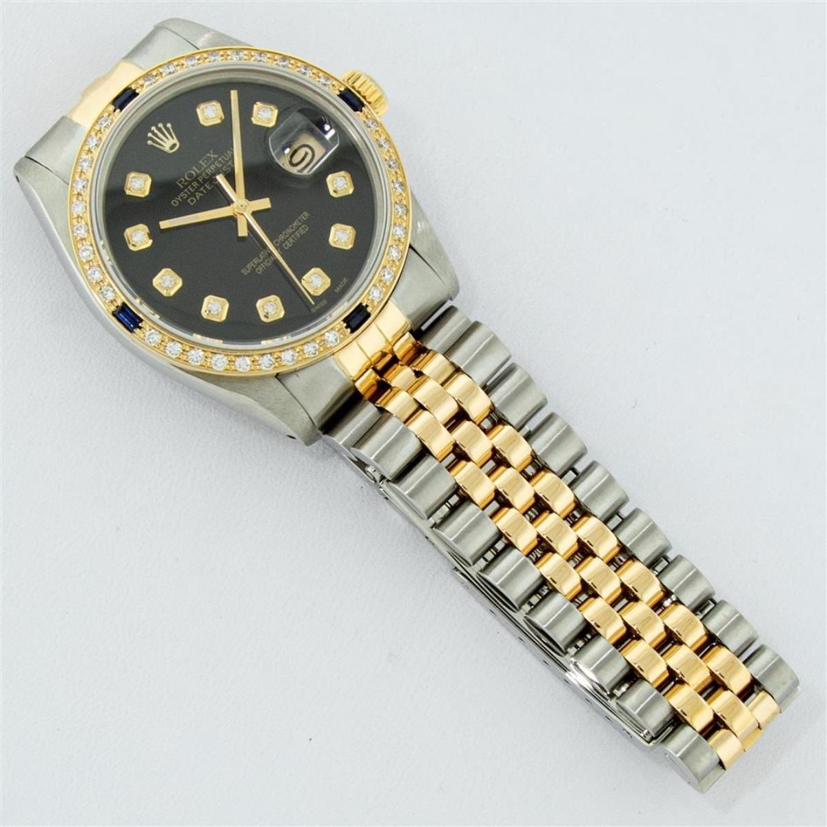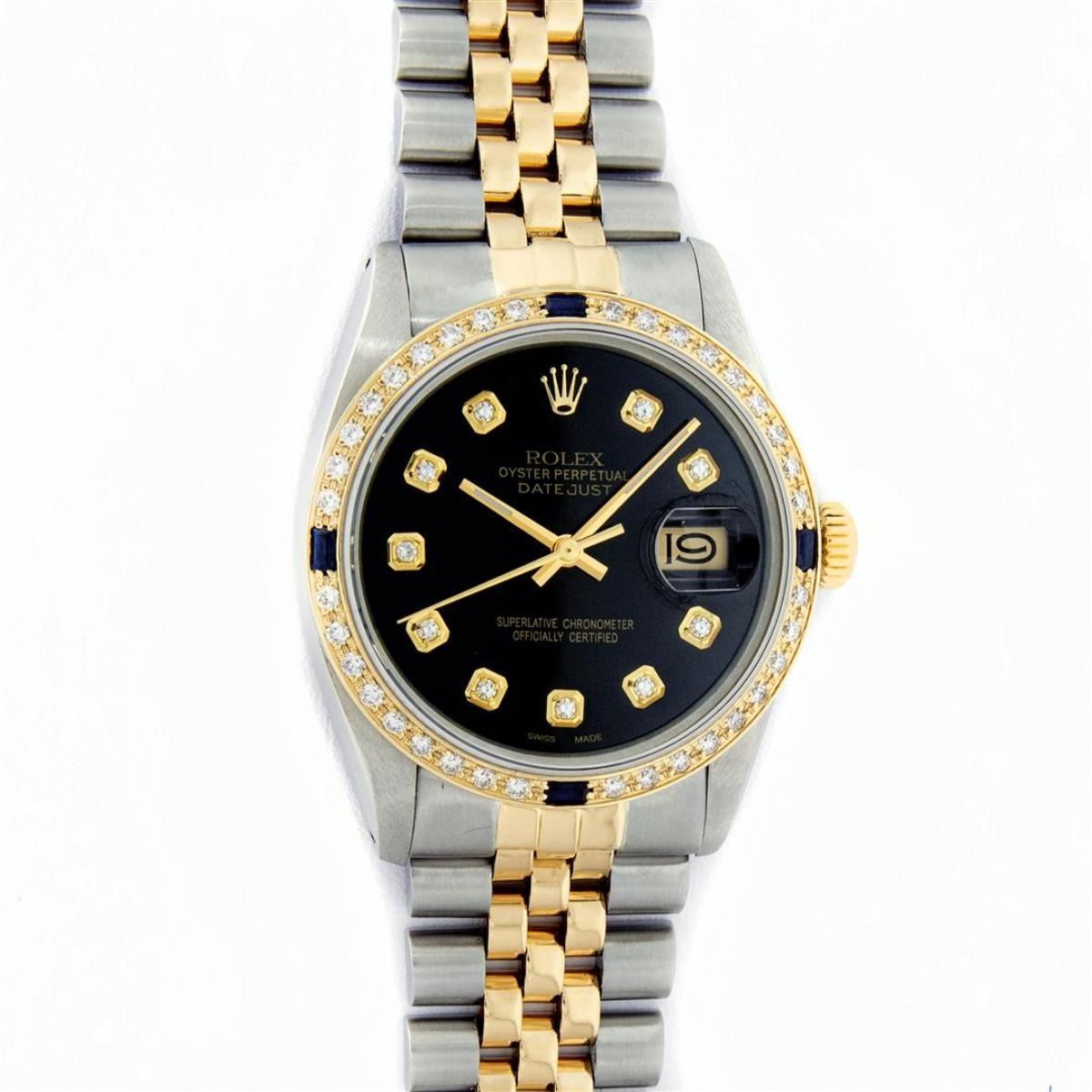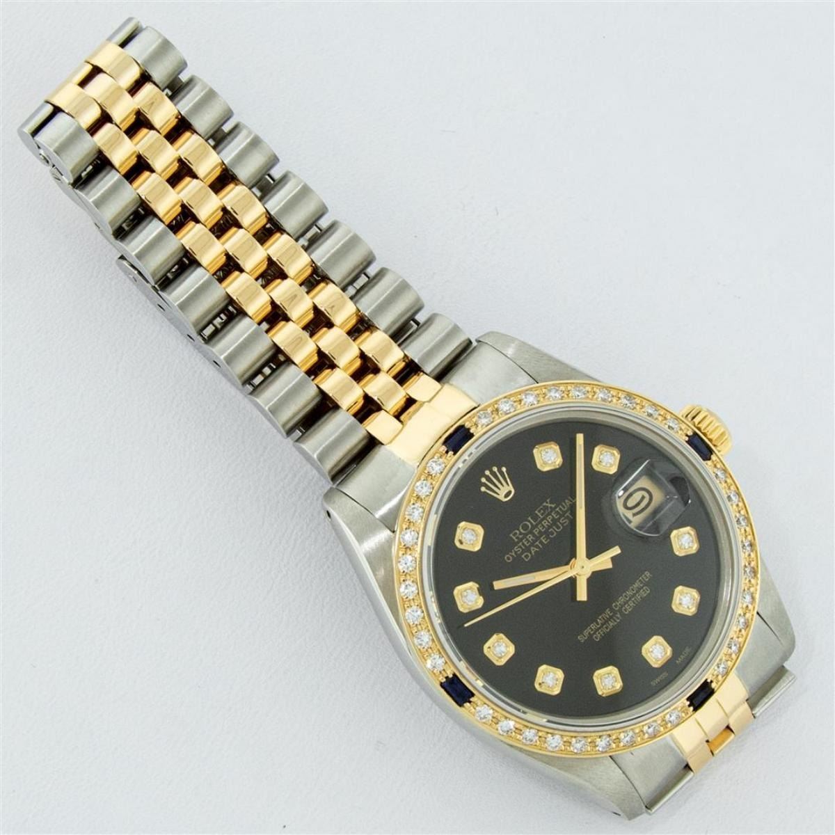 One Mens Yellow Gold Two Tone Rolex Datejust Polished, Serviced & Electronically Tested, Yellow Gold & Stainless Steel Case: 36mm, Yellow Gold Crown, Custom Bezel: New 18K Yellow Gold Beadset + Sapphire Diamond Bezel, Stone Count: 36 Diamonds + 4 Sapphires On The Bezel, Total Weight 1.00 Carat, Clarity: SI-VS, Color: G to H. Custom Crystal: New Scratch Resistant Synthetic Sapphire Cyclops Lens. Custom Hands: New Luminecent Hands. Movement: Automatic Winding Movement. Custom Dial: Black With Single Cut Diamond Hour Markers. Diamond Count: 10 Diamonds In Dial, Clarity: VS, Color: Color G to H Date Window: 3 O'Clock Position Date Display, Quickset, Model: Datejust. Condition: G-6 Extra Fine. Bracelet: Two Tone Yellow Gold & Stainless Steel Jubilee Band. Bright Polish. 7.0 Inch Length, Adjustable. Standard Clasp, With Rolex Logo. This Watch Has Been Serviced Time Tested And Is In Excellent Condition It Is Free Of All Scratches And Dents.