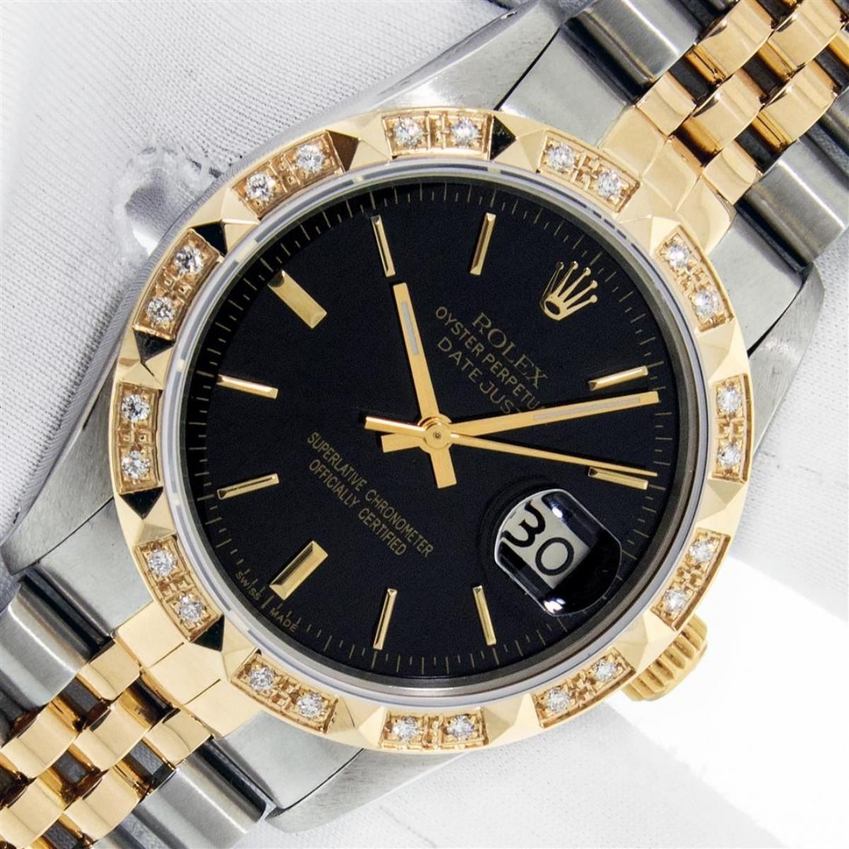 One Mens Yellow Gold Rolex Datejust Polished Bright with Satin Finish, Serviced & Electronically Tested, Stainless Steel Case: 36mm, Yellow Gold Crown, Custom Bezel: New 18K Yellow Gold Pyramid Diamond Bezel, Diamond Count: 24 Diamonds, Total Weight .75 Carat, Clarity: SI-VS, Color: G to H. Custom Crystal: New Scratch Resistant Synthetic Sapphire Cyclops Lens. Custom Hands: New Luminecent Hands. Movement: Automatic Winding Movement. Custom Dial: Black Index Dial With Dash Track & Lumi Dots. Date Window: 3 O'Clock Position Date Display, Quickset, Model: Datejust. Condition: G-6 Extra Fine. Bracelet: Yellow Gold And Stainless Steel Jubilee Band. Bright Polish & Satin Finish. 7.0 Inch Length, Adjustable. Standard Clasp, With Rolex Logo. This Watch Has Been Serviced And Polished It Is Free Of All Scratches And Dents. This Watch Comes With A Rolex Box.