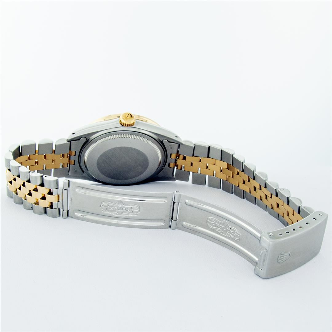 One Mens Yellow Gold Rolex Datejust Polished Bright with Satin Finish, Serviced & Electronically Tested, Stainless Steel Case: 36mm, Yellow Gold Crown, Custom Bezel: New 18K Yellow Gold Pyramid Diamond Bezel, Diamond Count: 24 Diamonds, Total Weight .75 Carat, Clarity: SI-VS, Color: G to H. Custom Crystal: New Scratch Resistant Synthetic Sapphire Cyclops Lens. Custom Hands: New Luminecent Hands. Movement: Automatic Winding Movement. Custom Dial: Black Index Dial With Dash Track & Lumi Dots. Date Window: 3 O'Clock Position Date Display, Quickset, Model: Datejust. Condition: G-6 Extra Fine. Bracelet: Yellow Gold And Stainless Steel Jubilee Band. Bright Polish & Satin Finish. 7.0 Inch Length, Adjustable. Standard Clasp, With Rolex Logo. This Watch Has Been Serviced And Polished It Is Free Of All Scratches And Dents.