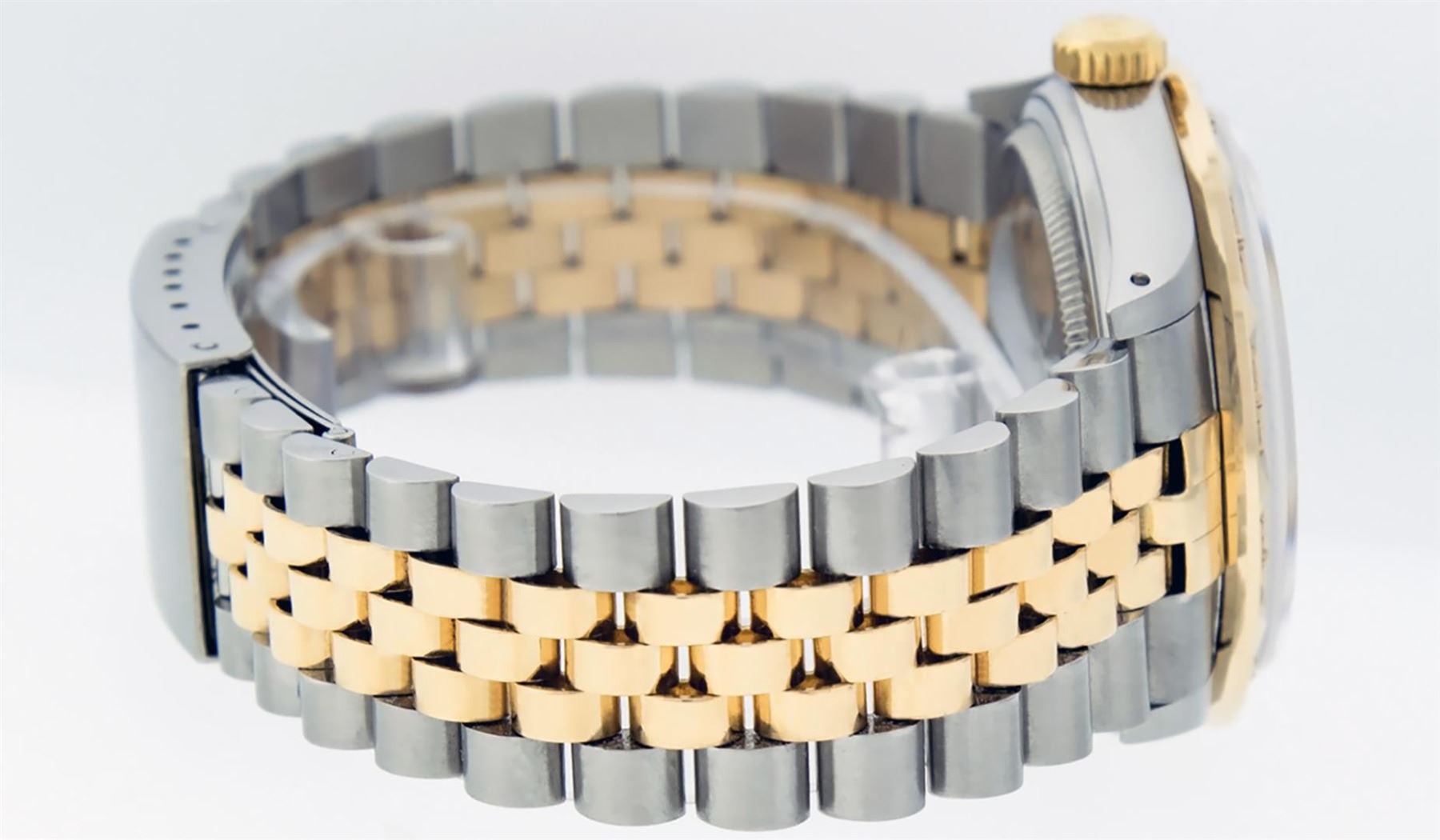 One Mens Yellow Gold Rolex Datejust Polished Bright with Satin Finish, Serviced & Electronically Tested, Stainless Steel Case: 36mm, Yellow Gold Crown, Custom Bezel: New 18K Yellow Gold Pyramid Diamond Bezel, Diamond Count: 24 Diamonds, Total Weight .75 Carat, Clarity: SI-VS, Color: G to H. Custom Crystal: New Scratch Resistant Synthetic Sapphire Cyclops Lens. Custom Hands: New Luminecent Hands. Movement: Automatic Winding Movement. Custom Dial: Black Diamond Dial With Roman Track, Diamond Count: 10 Diamonds In Dial, Color: G to H, Clarity: VS. Date Window: 3 O'Clock Position Date Display, Quickset, Model: Datejust. Condition: G-6 Extra Fine. Bracelet: Yellow Gold And Stainless Steel Jubilee Band. Bright Polish & Satin Finish. 7.0 Inch Length, Adjustable. Standard Clasp, With Rolex Logo. This Watch Has Been Serviced And Polished It Is Free Of All Scratches And Dents.