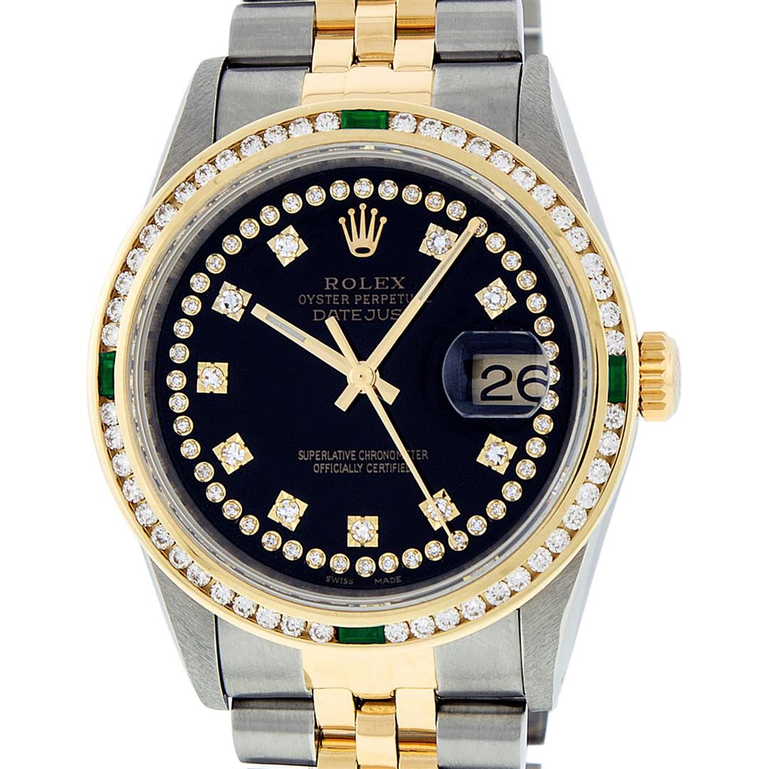 One Mens Pre Owned Yellow Gold Two Tone Rolex Datejust Polished, Serviced & Electronically Tested, Yellow Gold & Stainless Steel Case: 36mm, Yellow Gold Crown, Custom Bezel: New 18K Yellow Gold Emerald Channel Set Diamond Bezel, Diamond Count: 52 Diamonds + 4 Emeralds, Clarity: SI-VS, Color: G to H. Custom Crystal: New Sapphire With Date Window. Custom Hands: New Luminescent Hands. Rolex Movement: Automatic Winding Movement. Custom Dial: Refinished To Black With Custom Added Diamonds, Diamond Count: 58 Diamonds in Dial. Date Window: 3 O'clock Position Date Display, Quickset, Model: Datejust. Condition: G-6 Extra Fine. Rolex Bracelet: Two Tone Yellow Gold & Stainless Steel Jubilee Band. Bright Polish. 7.0 Inch Length, Adjustable. Standard Clasp, With Rolex Logo. This Watch Has Been Serviced Time Tested And Is In Excellent Condition It Is Free Of All Scratches And Dents.