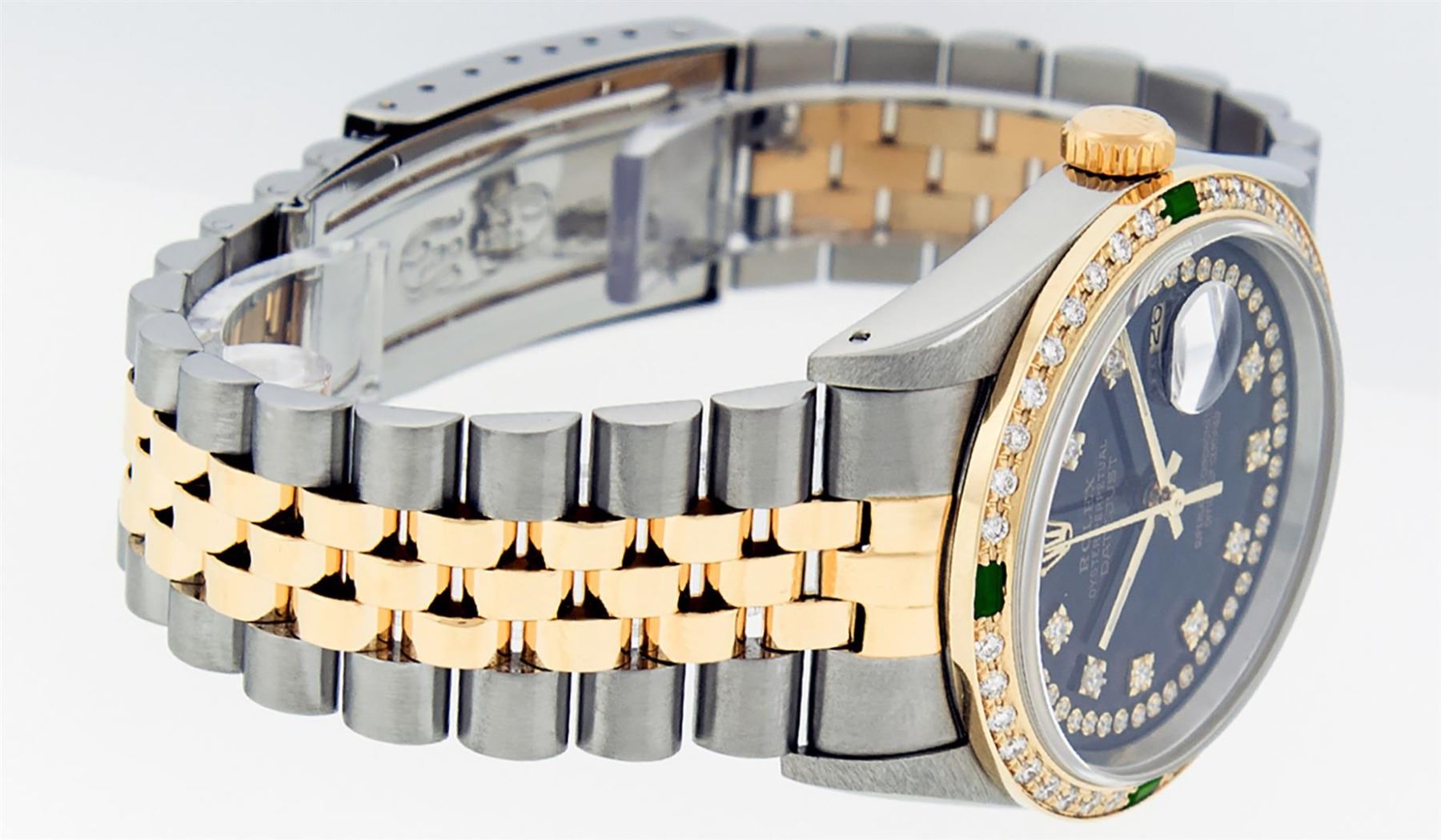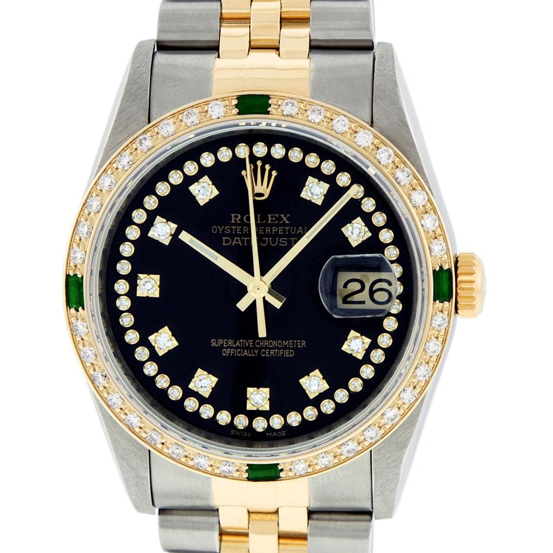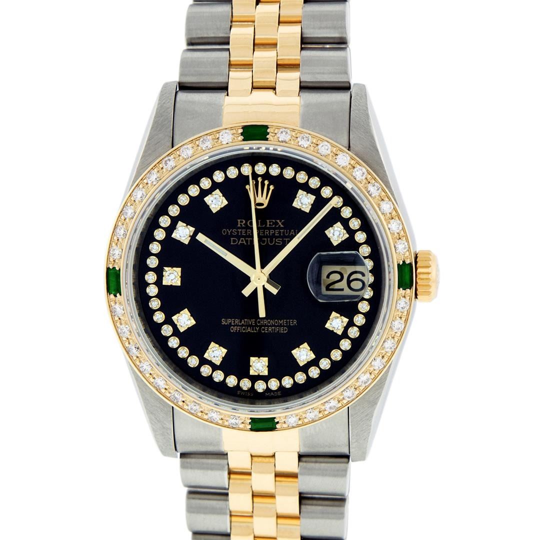 One Mens Pre Owned Yellow Gold Two Tone Rolex Datejust Polished, Serviced & Electronically Tested, Yellow Gold & Stainless Steel Case: 36mm, Yellow Gold Crown, Custom Bezel: 18K Yellow Gold Emerald Bead set Diamond Bezel, Diamond Count: 36 Diamonds + 4 Em