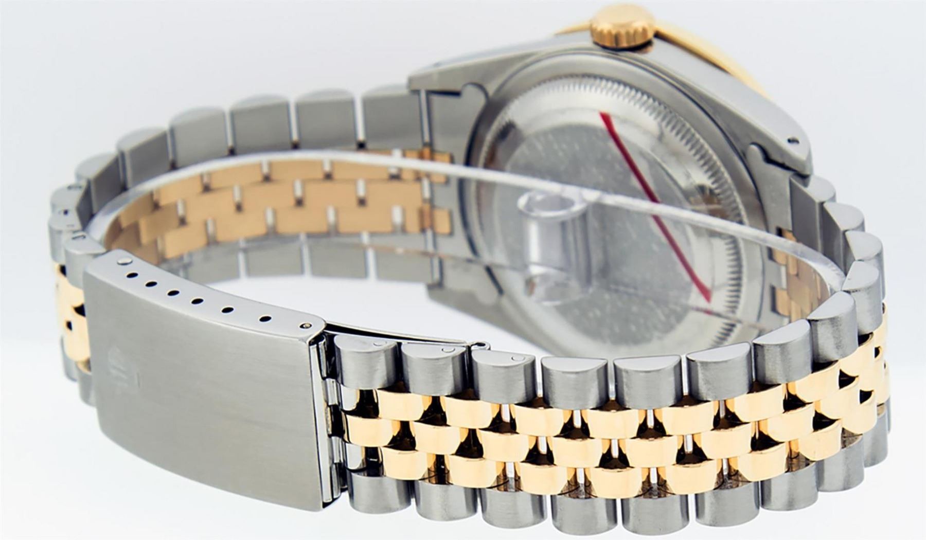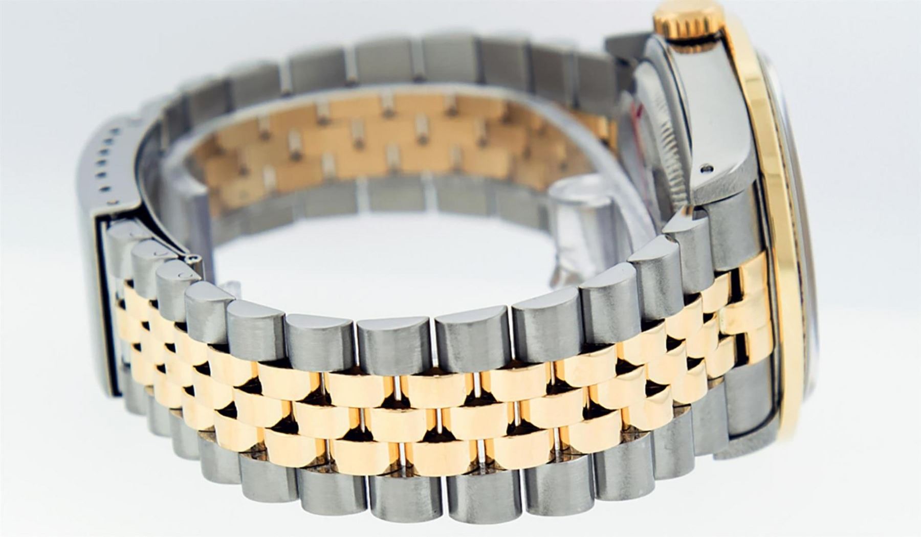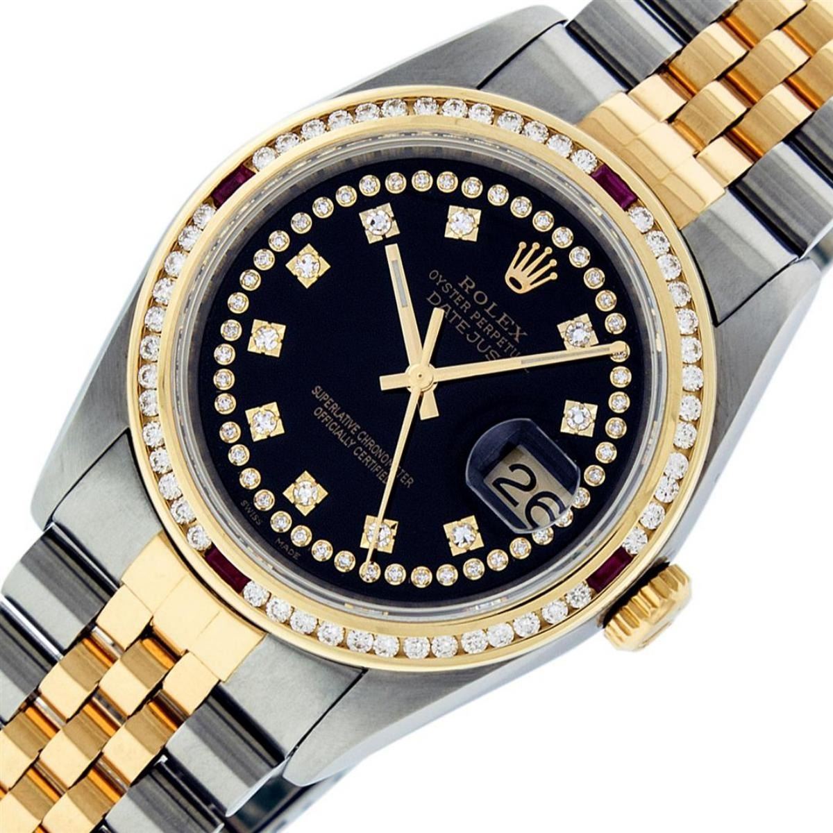 One Mens Yellow Gold Two Tone Rolex Datejust Polished, Serviced & Electronically Tested, Yellow Gold & Stainless Steel Case: 36mm, Yellow Gold Crown, Custom Bezel: 18K Yellow Gold Ruby Channel Set Diamond Bezel, Diamond Count: 52 Diamonds + 4 Rubies, Total Weight 1.30 Carat, Clarity: SI-VS, Color: G to H. Custom Crystal: New Scratch Resistant Synthetic Sapphire Cyclops Lens. Custom Hands: New Luminecent Hands. Movement: Automatic Winding Movement. Custom Dial: Black String Diamond Dial With Single Cut Diamonds, Diamond Count: 58 Diamonds in Dial. Date Window: 3 O'Clock Position Date Display, Quickset, Model: Datejust. Condition: G-6 Extra Fine. Bracelet: Two Tone Yellow Gold & Stainless Steel Jubilee Band. Bright Polish. 7.0 Inch Length, Adjustable. Standard Clasp, With Rolex Logo. This Watch Has Been Serviced Time Tested And Is In Excellent Condition It Is Free Of All Scratches And Dents.