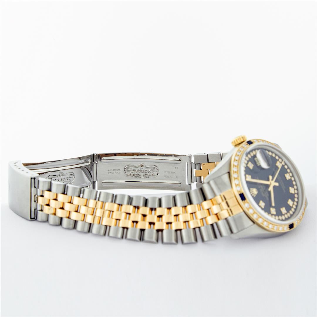 One Mens Pre Owned Yellow Gold Two Tone Rolex Datejust Polished, Serviced & Electronically Tested, Yellow Gold & Stainless Steel Case: 36mm, Yellow Gold Crown, Custom Bezel: New 18K Yellow Gold Sapphire Beadset Diamond Bezel, Diamond Count: 36 Diamonds + 4 Sapphires In Bezel, Clarity: SI-VS, Color: G to H. Custom Crystal: New Sapphire With Date Window. Custom Hands: New Luminescent Hands. Rolex Movement: Automatic Winding Movement. Custom Dial: Refinished To Black With Custom Added Diamonds, Diamond Count: 58 Diamonds In Dial, Color: G to H, Clarity: VS2 Date Window: 3 O'Clock Position Date Display, Quickset, Model: Datejust, Condition: G-6 Extra Fine. Rolex Bracelet: Two Tone Yellow Gold & Stainless Steel Jubilee Band. Bright Polish. 7.0 Inch Length, Adjustable. Standard Clasp, With Rolex Logo. This Watch Has Been Serviced Time Tested And Is In Excellent Condition It Is Free Of All Scratches And Dents.