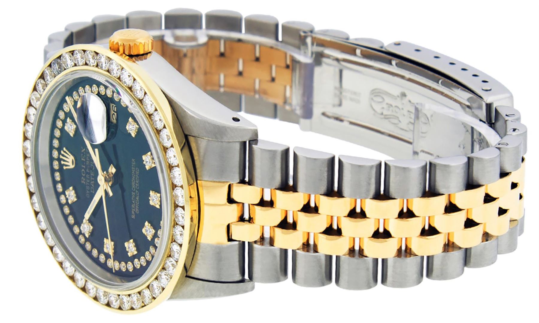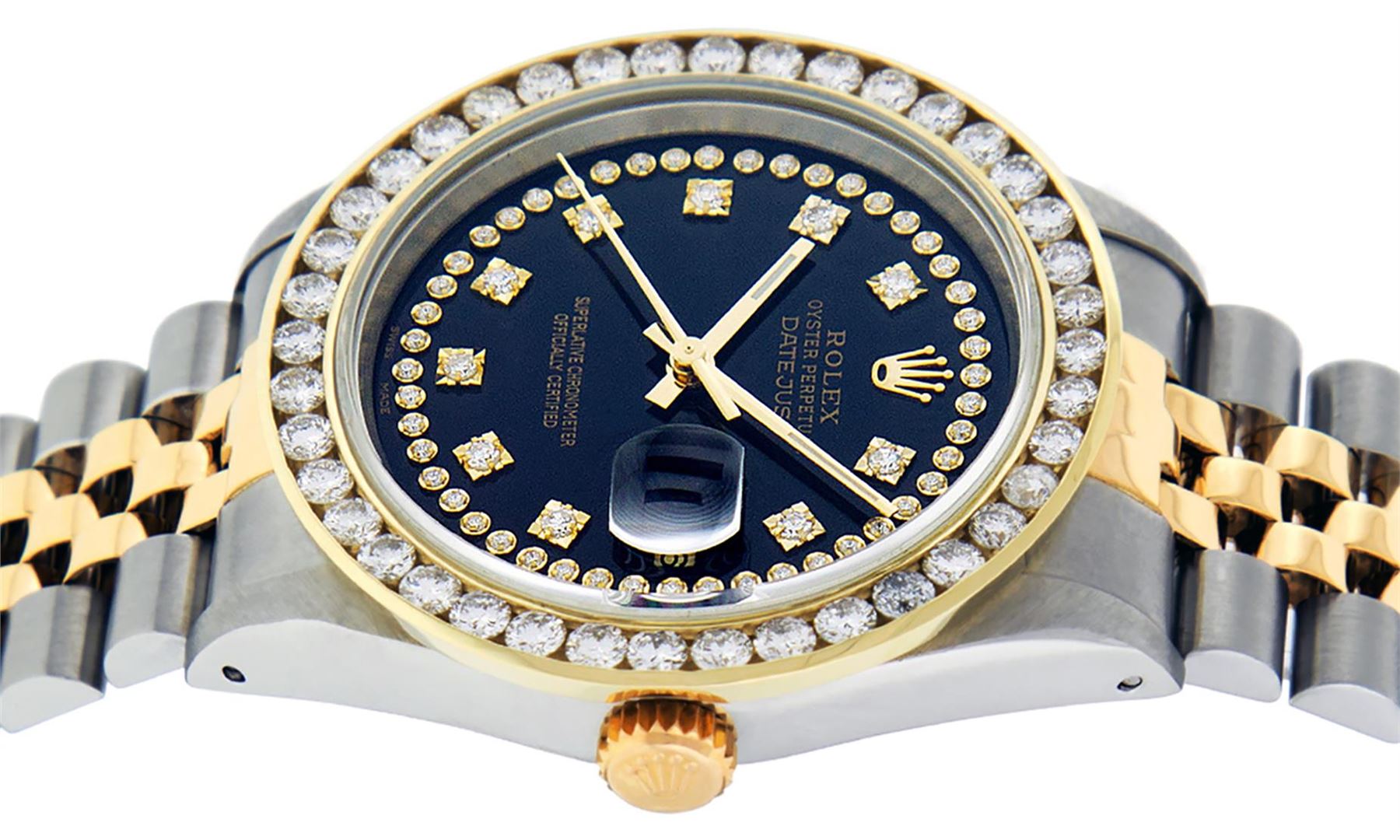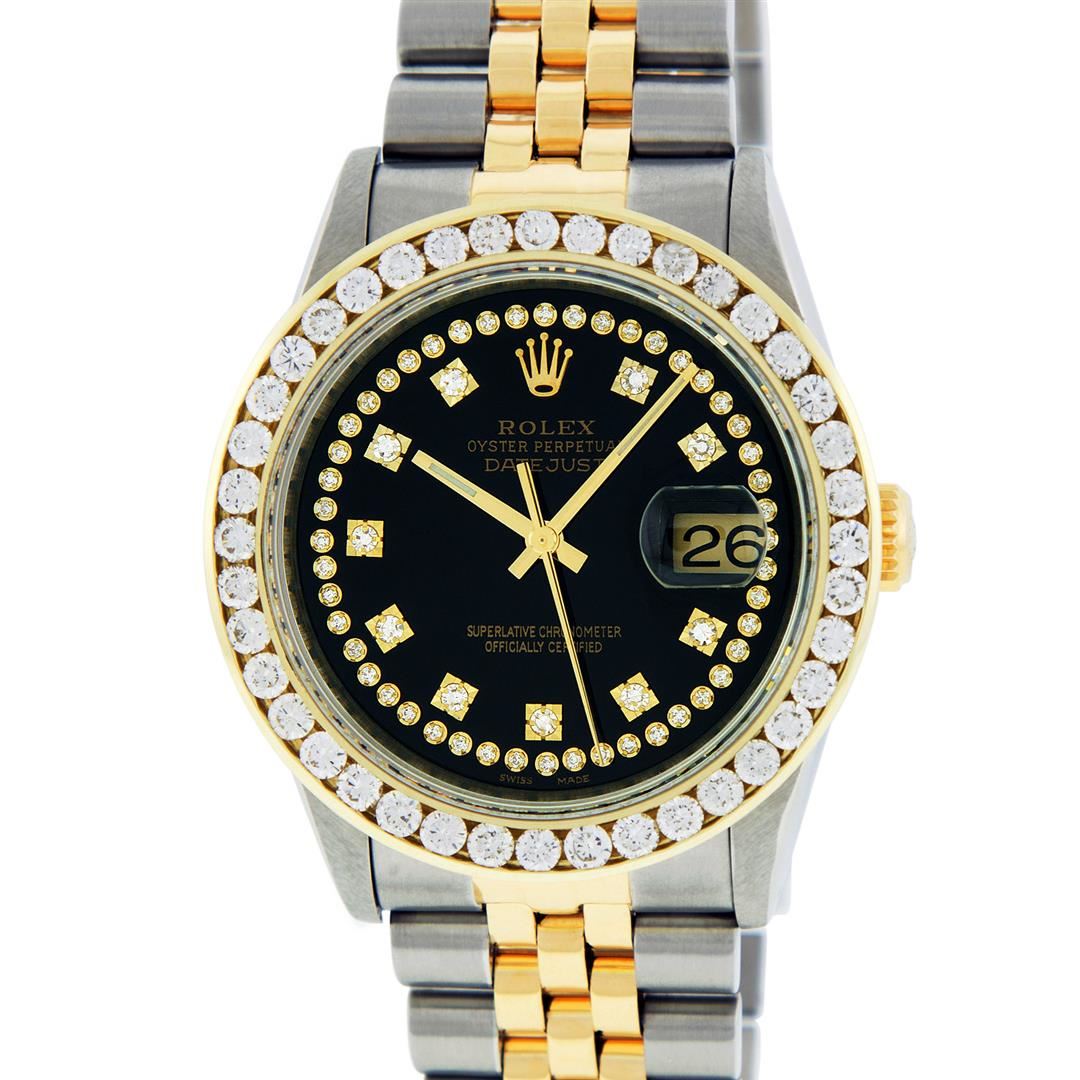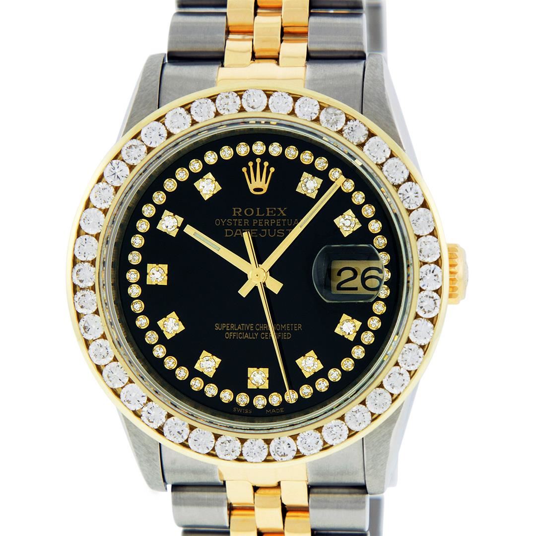One Mens Pre Owned Yellow Gold Rolex Datejust Polished Bright with Satin Finish, Serviced & Electronically Tested, Rolex Stainless Steel Case: 36mm, Yellow Gold Crown, Custom Bezel: New 18K Yellow Gold 3ct Channel Set Diamond Bezel, Diamond Count: 40 Diamonds, Total Weight 3.00 Carat, Clarity: SI-VS, Color: G to H. Custom Crystal: New Sapphire Magnified Lens. Custom Hands: New Luminescent Hands. Rolex Movement: Automatic Winding Movement. Custom Dial: Refinished Black With Custom Added Diamonds, Diamond Count: 58 Diamonds In Dial, Color: G to H, Clarity: VS. Date Window: 3 O'Clock Position Date Display, Quickset, Model: Datejust. Condition: G-6 Extra Fine. Rolex Bracelet: Yellow Gold And Stainless Steel Jubilee Band. Bright Polish & Satin Finish. 7.0 Inch Length, Adjustable. Standard Clasp, With Rolex Logo. This Watch Has Been Serviced And Polished It Is Free Of All Scratches And Dents.