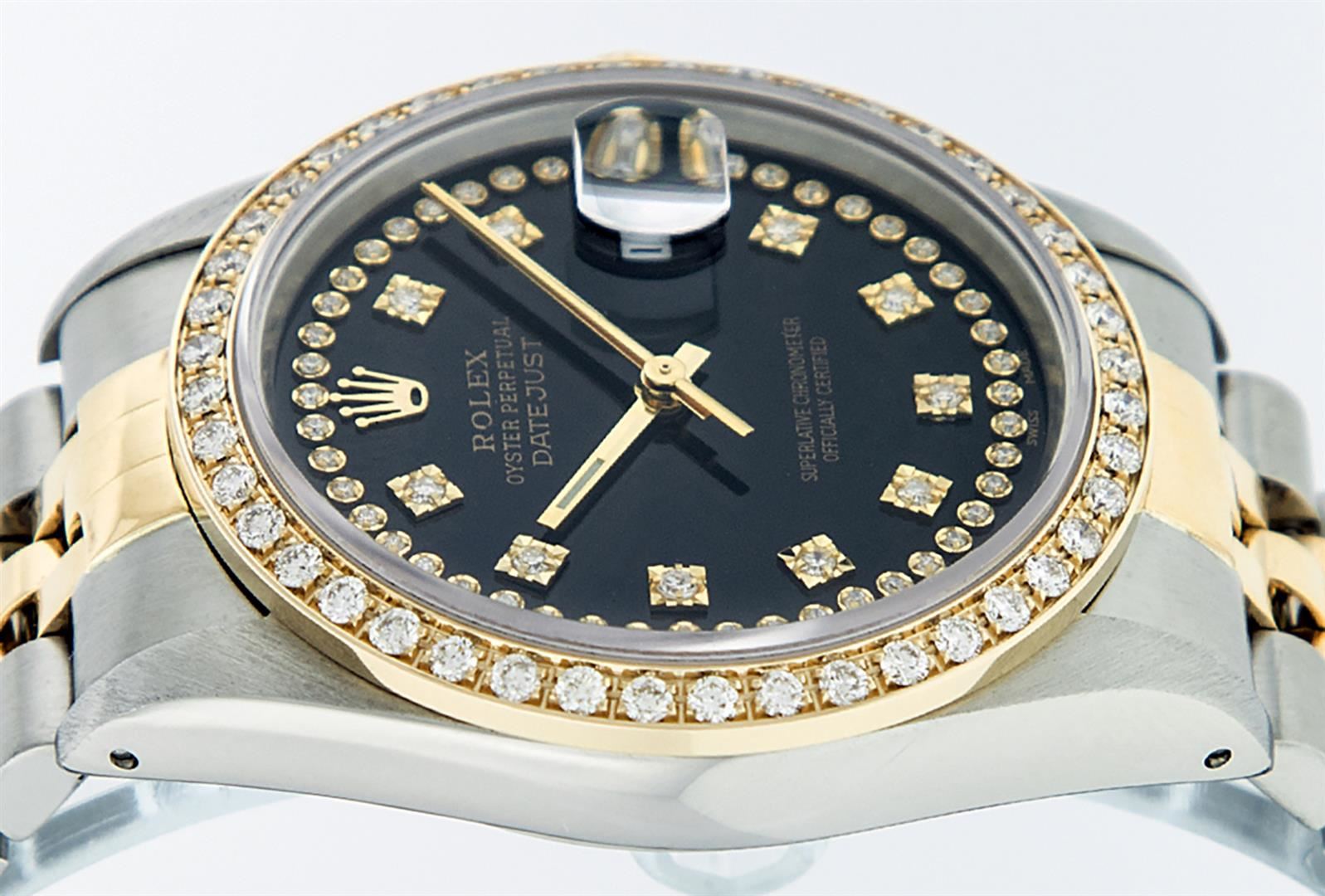 One Mens Pre Owned Yellow Gold Two Tone Rolex Datejust Polished, Serviced & Electronically Tested, Rolex Yellow Gold & Stainless Steel Case: 36mm, Rolex Yellow Gold Crown, Custom Bezel: New 18K Yellow Gold Bead set Diamond Bezel, Diamond Count: 44 Diamond