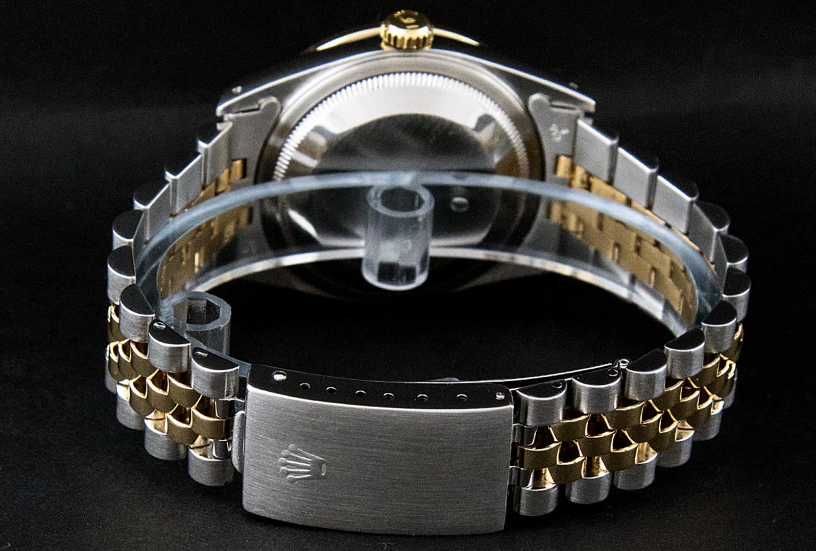 One Mens Yellow Gold Two Tone Rolex Datejust Polished, Serviced & Electronically Tested, Yellow Gold & Stainless Steel Case: 36mm, Yellow Gold Crown, Custom Bezel: 18K Yellow Gold Beadset Diamond Bezel, Diamond Count: 44 Diamonds On Bezel, Total Weight 1.00 Carat, Clarity: SI-VS, Color: G to H. New Custom Crystal: Scratch Resistant Synthetic Sapphire Cyclops Lens. Custom Hands: New Luminecent Hands. Movement: Automatic Winding Movement. Custom Dial: Black VS Single Cut String Diamond Dial, Diamond Count: 58 Diamonds in Dial G To H In Color, VS In Clarity. Date Window: 3 O'Clock Position Date Display, Quickset, Model: Datejust. Condition: G-6 Extra Fine. Bracelet: Two Tone Yellow Gold & Stainless Steel Jubilee. Bright Polish. 7.0 Inch Length, Adjustable. Standard Clasp, With Rolex Logo. This Watch Has Been Serviced Time Tested And Is In Excellent Condition It Is Free Of All Scratches And Dents.