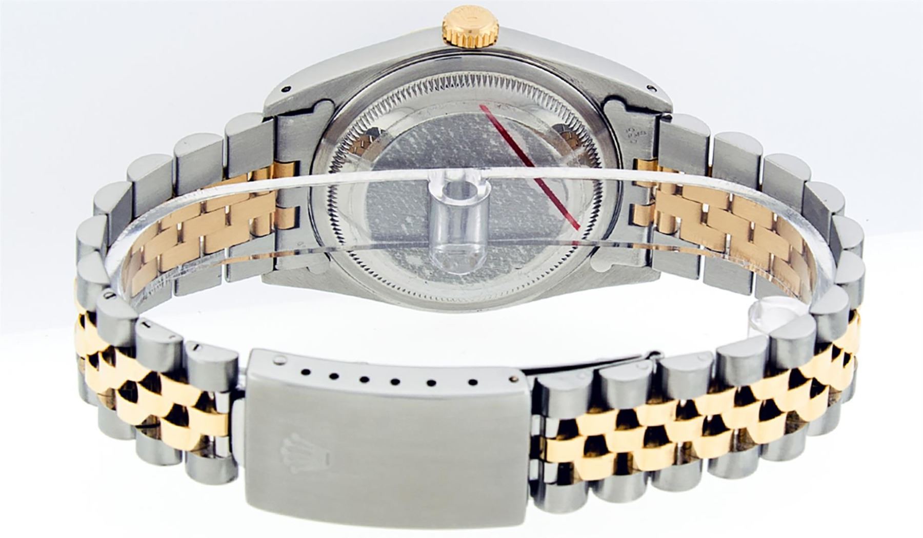 One Mens Pre Owned Yellow Gold Two Tone Rolex Datejust Polished, Serviced & Electronically Tested, Rolex Yellow Gold & Stainless Steel Case: 36mm, Rolex Yellow Gold Crown, Rolex Bezel: Yellow Gold Fluted Bezel. Custom Crystal: New Acrylic Cyclops Lens. Custom Hands: New Luminescent Hands. Rolex Movement: Automatic Winding Movement. Custom Dial: Refinished To Black With Single Cut String Dial Set With VS Added Diamond Hour Markers, Diamond Count: 58 Diamonds in Dial, G To H In Color, SI-VS Clarity. Date Window: 3 O'Clock Position Date Display, Quickset, Model: Datejust, Condition: G-6 Extra Fine. Rolex Bracelet: Two Tone Yellow Gold & Stainless Steel Jubilee Band. Bright Polish. 7.0 Inch Length, Adjustable. Standard Clasp, With Rolex Logo. This Watch Has Been Serviced And Polished It Is Free Of All Scratches And Dents.