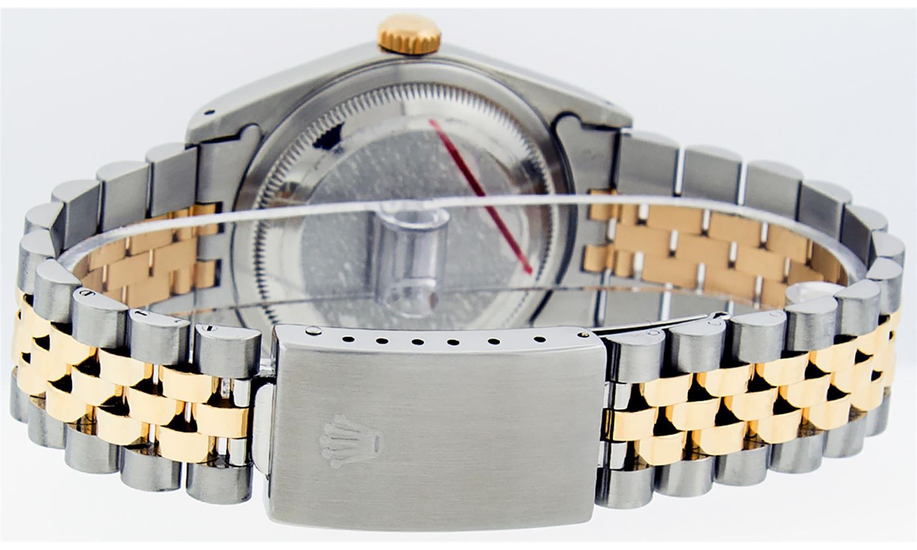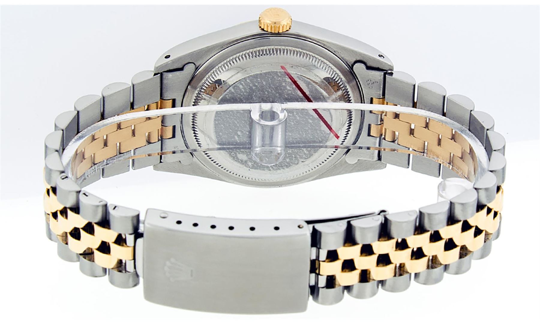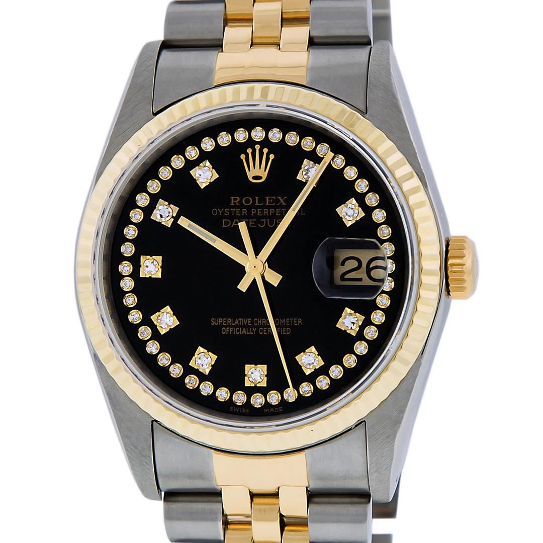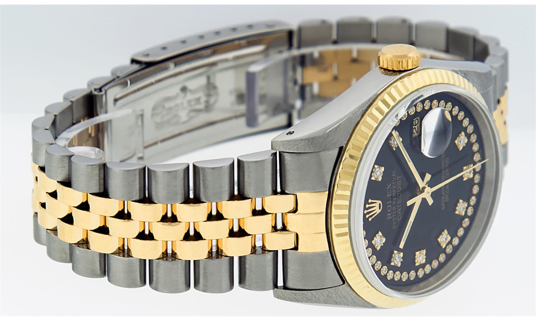 One Mens Pre Owned Yellow Gold Two Tone Rolex Datejust Polished, Serviced & Electronically Tested, Rolex Yellow Gold & Stainless Steel Case: 36mm, Rolex Yellow Gold Crown, Rolex Bezel: Yellow Gold Fluted Bezel. Custom Crystal: New Acrylic Cyclops Lens. Custom Hands: New Luminescent Hands. Rolex Movement: Automatic Winding Movement. Custom Dial: Refinished To Black With Single Cut String Dial Set With VS Added Diamond Hour Markers, Diamond Count: 58 Diamonds in Dial, G To H In Color, SI-VS Clarity. Date Window: 3 O'Clock Position Date Display, Quickset, Model: Datejust, Condition: G-6 Extra Fine. Rolex Bracelet: Two Tone Yellow Gold & Stainless Steel Jubilee Band. Bright Polish. 7.0 Inch Length, Adjustable. Standard Clasp, With Rolex Logo. This Watch Has Been Serviced And Polished It Is Free Of All Scratches And Dents.