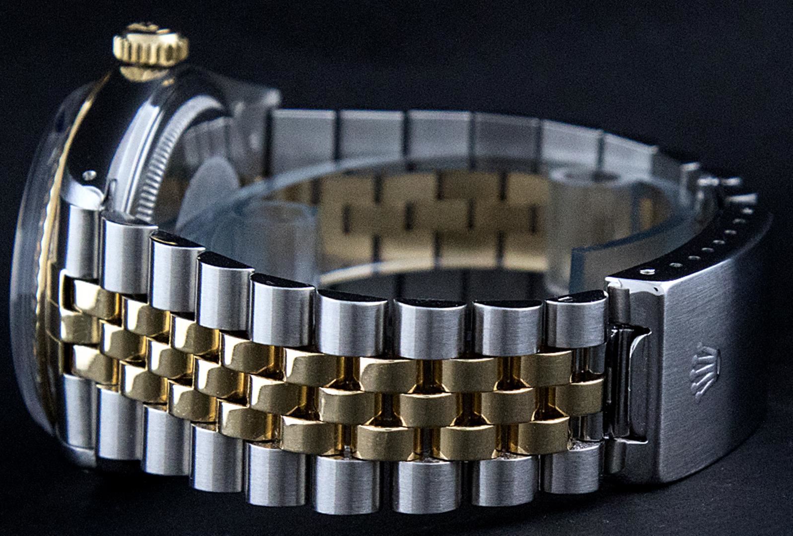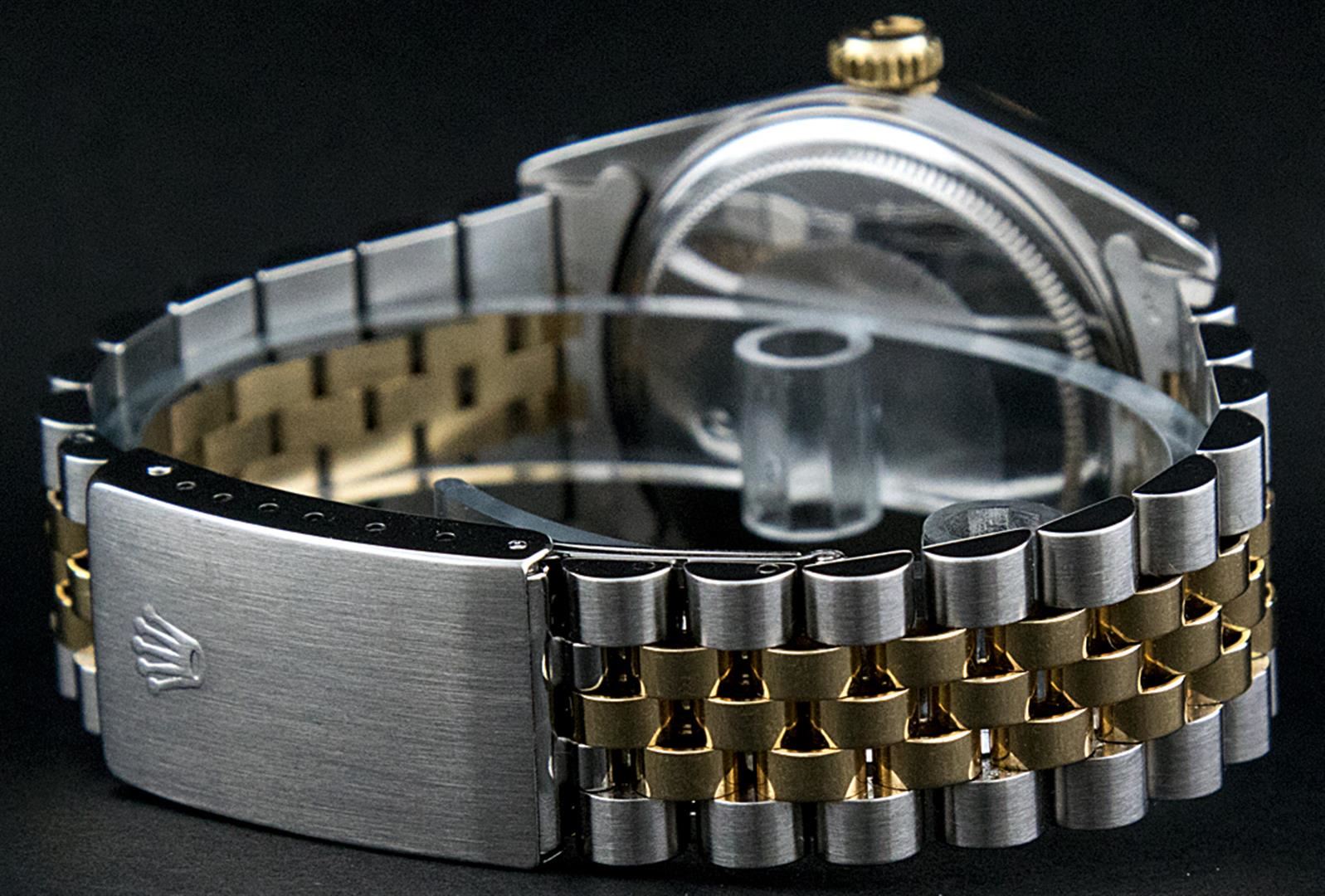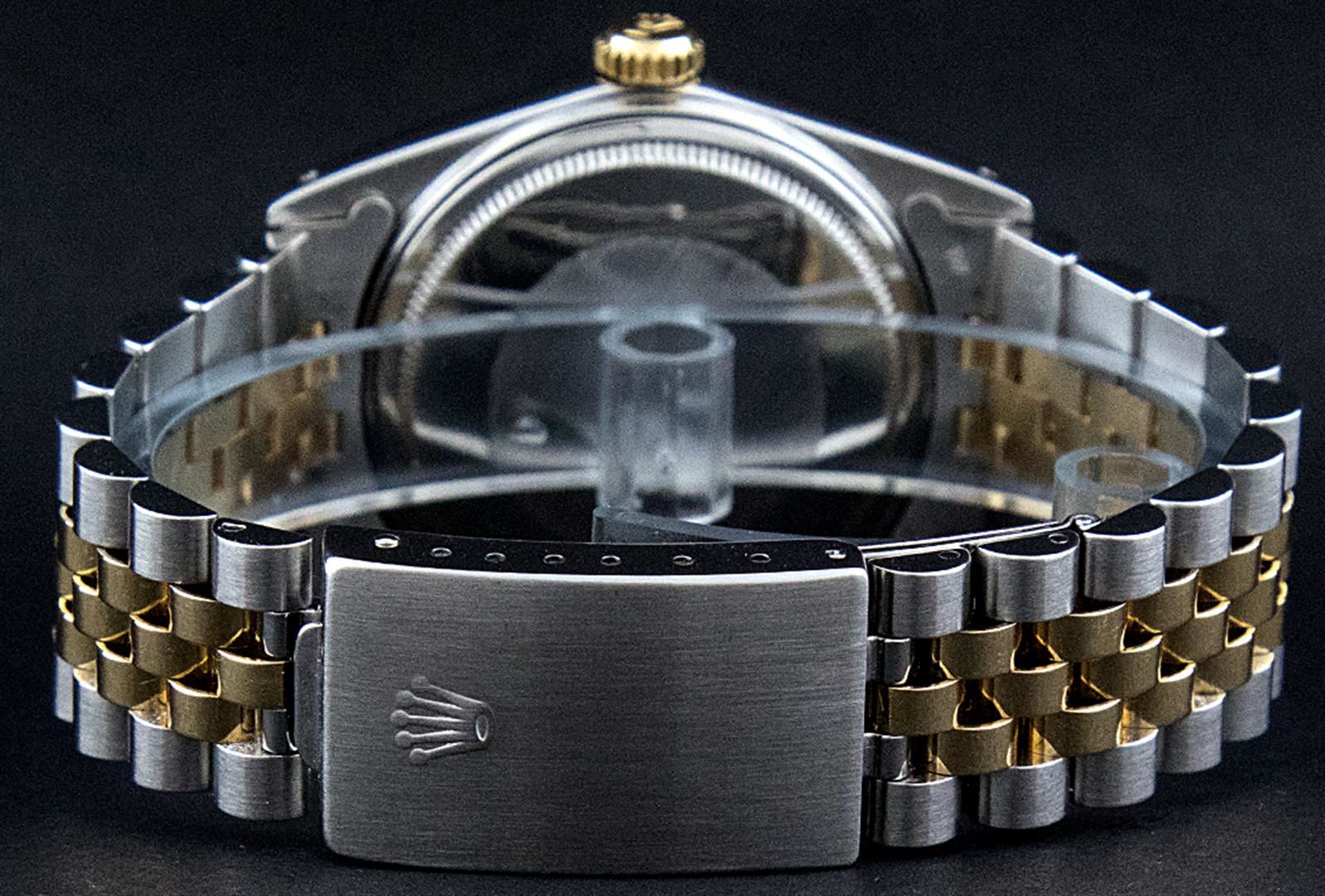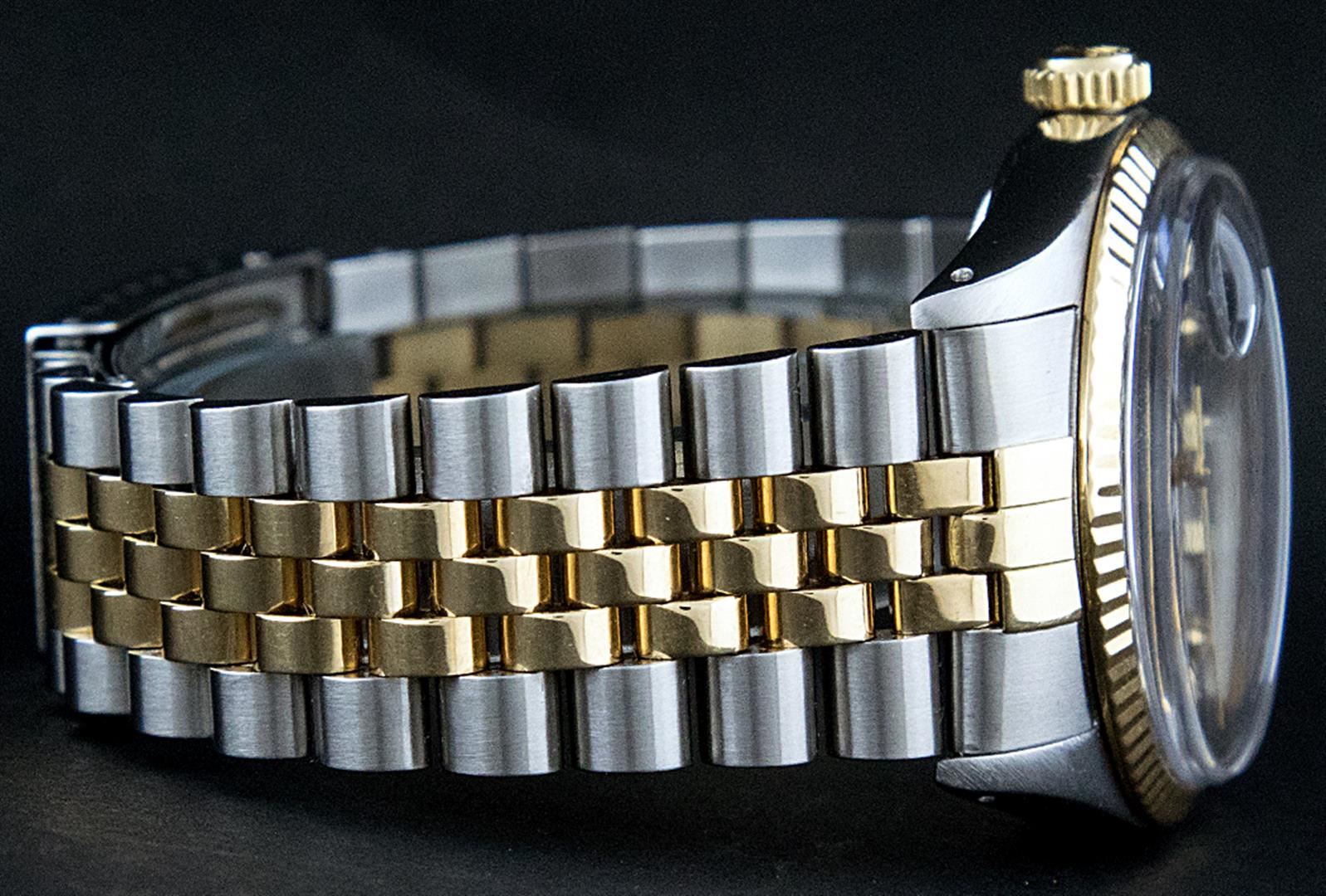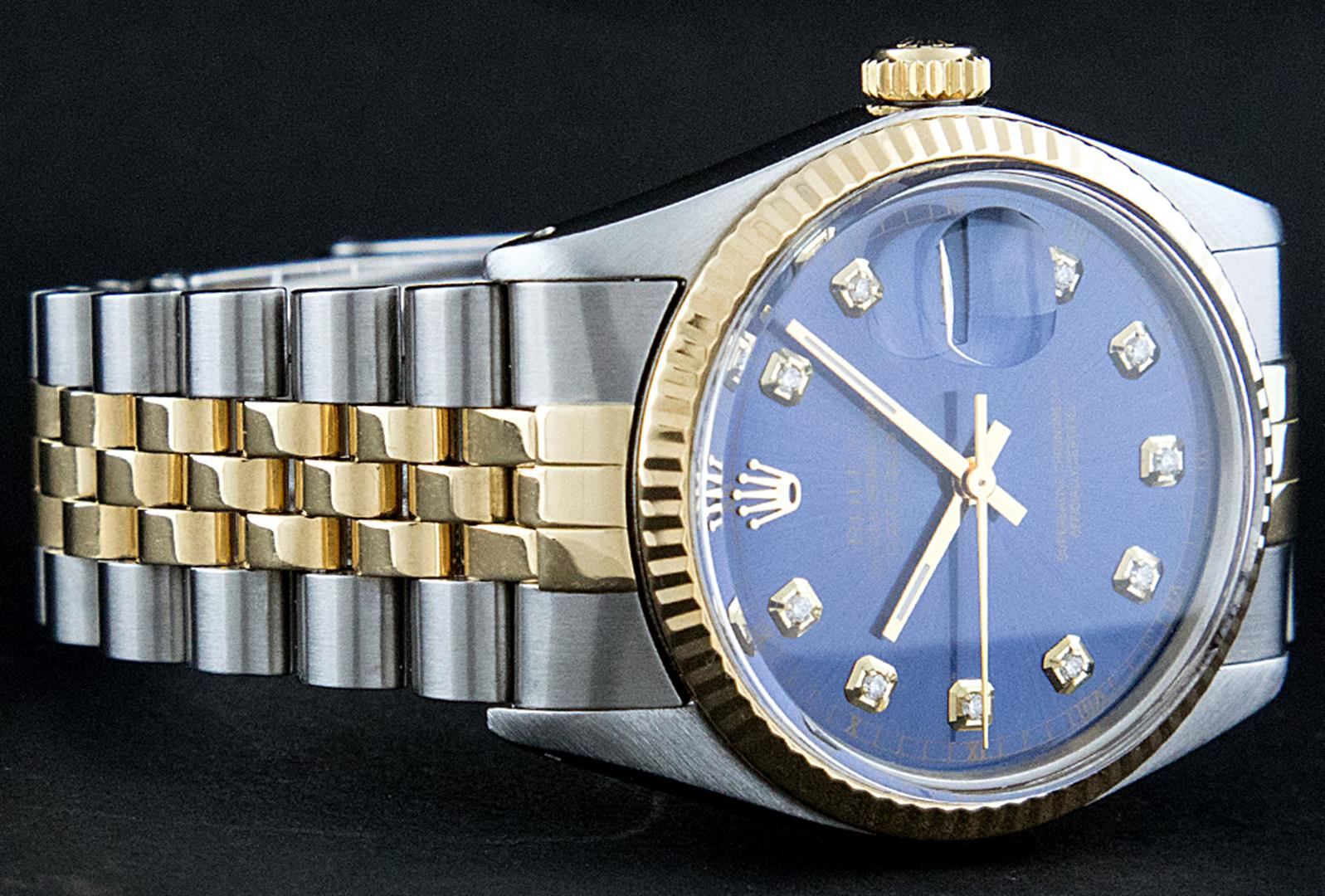One Mens Pre Owned Yellow Gold Two Tone Rolex Datejust Polished, Serviced & Electronically Tested, Rolex Yellow Gold & Stainless Steel Case: 36mm, Rolex Yellow Gold Crown, Rolex Bezel: Yellow Gold Fluted Bezel. Custom Crystal: New Acrylic Cyclops Lens. Custom Hands: New Luminecent Hands. Rolex Movement: Automatic Winding Movement. Custom Dial: Blue With Diamond Hour Markers And Square Roman Track, Diamond Count: 10 Diamonds in Dial, G To H In Color, SI-VS Clarity. Date Window: 3 O'Clock Position Date Display, Quickset, Model: Datejust, Condition: G-6 Extra Fine. Rolex Bracelet: Two Tone Yellow Gold & Stainless Steel Jubilee. Bright Polish. 7.0 Inch Length, Adjustable. Standard Clasp, With Rolex Logo. This Watch Has Been Serviced And Polished It Is Free Of All Scratches And Dents.