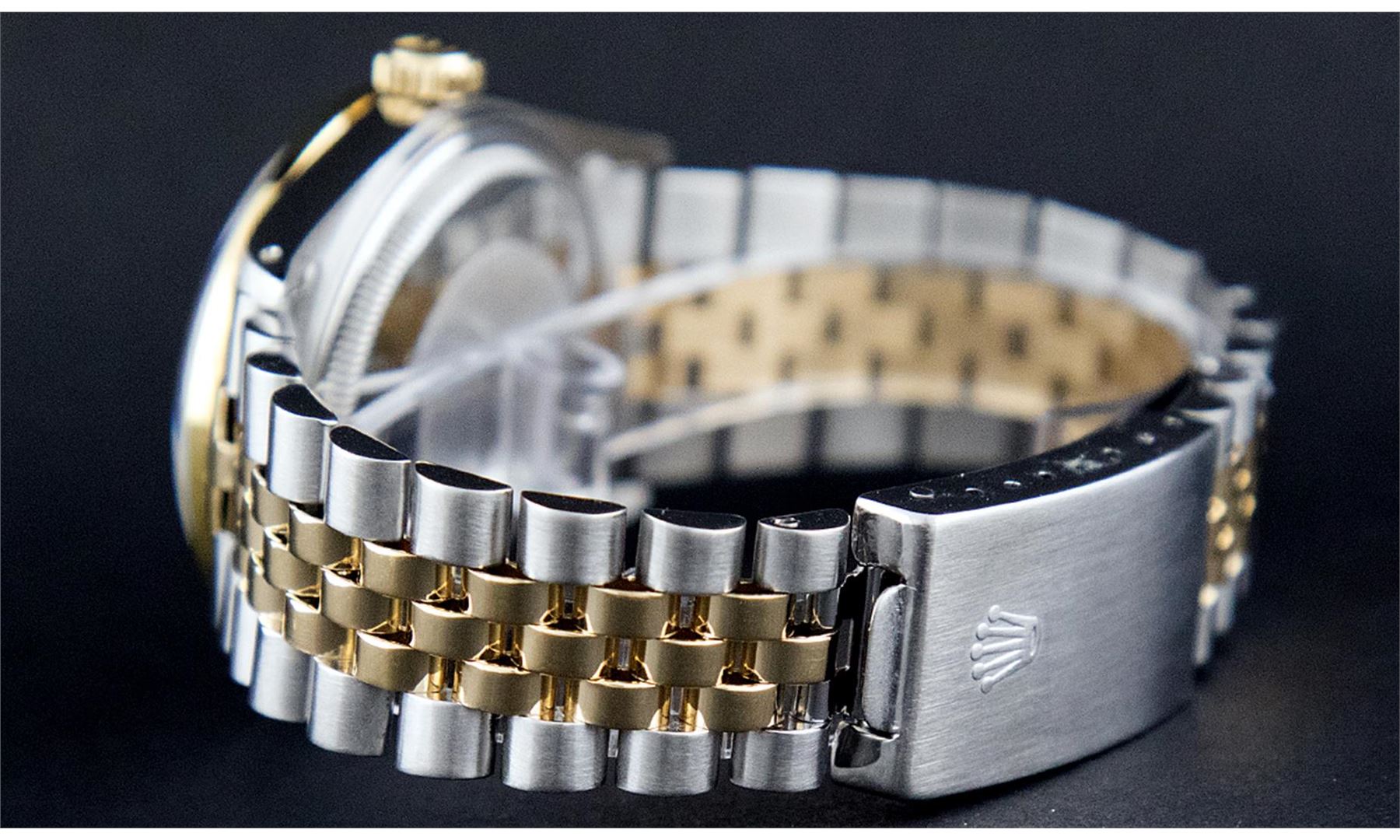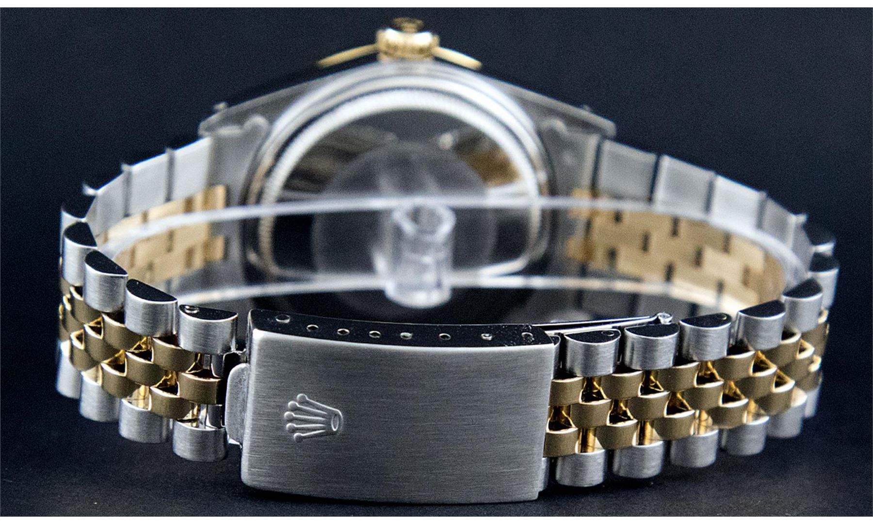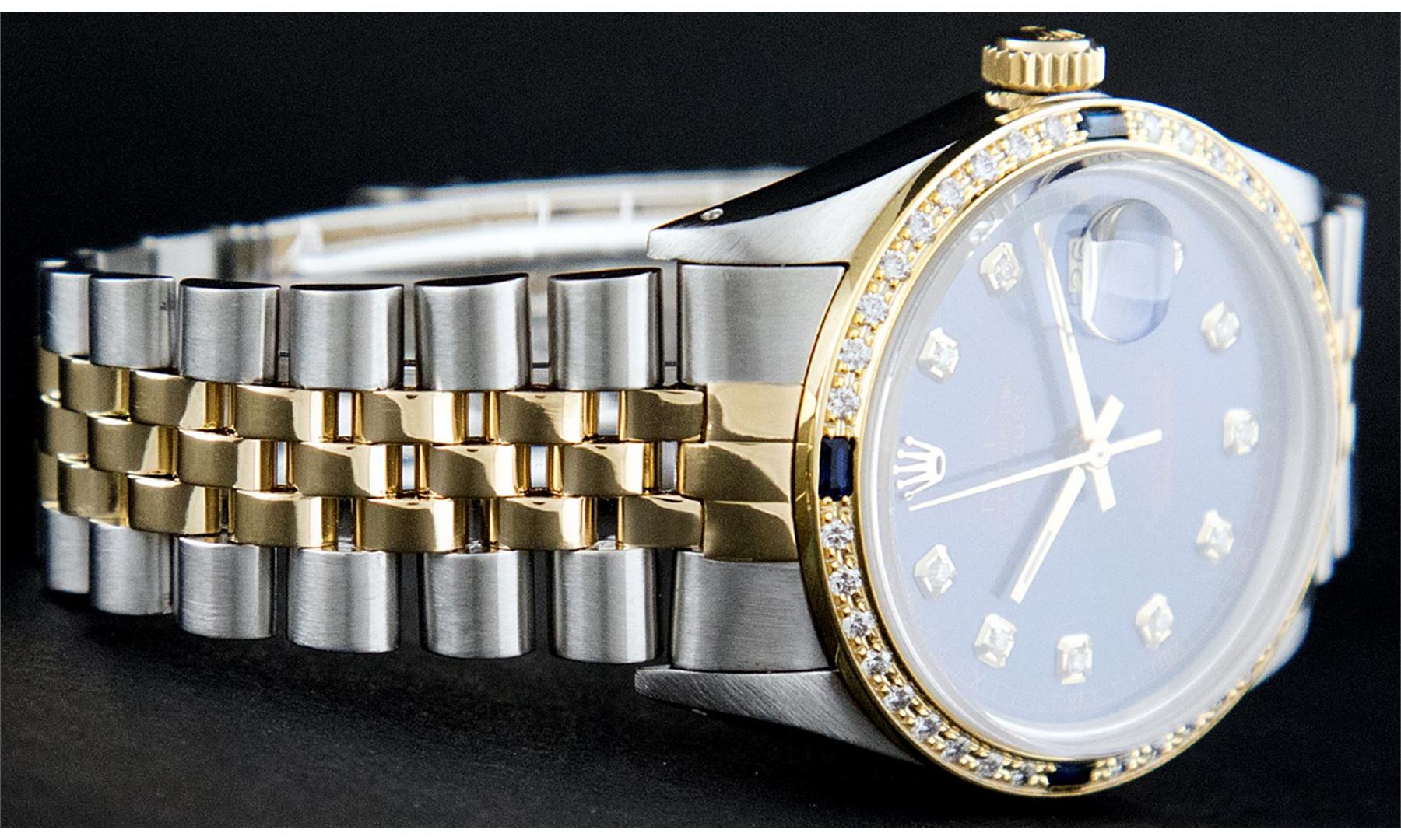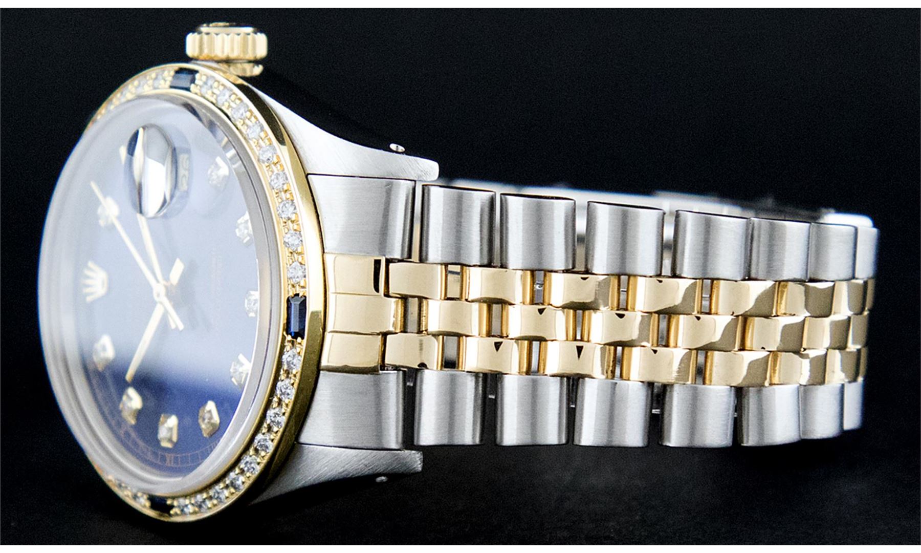 One Mens Pre Owned Yellow Gold Two Tone Rolex Datejust Polished, Serviced & Electronically Tested, Rolex Case: Yellow Gold & Stainless Steel Case: 36mm, Rolex Yellow Gold Crown, Custom Bezel: New 18K Yellow Gold Sapphire Beadset Diamond Bezel, Diamond Count: 36 Diamonds + 4 Sapphires, Total Weight 1.00 Carat, Clarity: SI-VS, Color: G to H. Custom Crystal: New Sapphire Magnified Lens. Custom Hands: New Luminescent Hands. Rolex Movement: Automatic Winding Movement. Custom Dial: Refinished To Blue With Custom Added Diamond Hour Markers. Diamond Count: 10 Diamonds, Clarity: SI-VS, Color: Color G to H Date Window: 3 O'Clock Position Date Display, Quickset, Model: Condition: G-6 Extra Fine. Rolex Bracelet: Two Tone Yellow Gold & Stainless Steel Jubilee. Bright Polish. 7.0 Inch Length, Adjustable. Standard Clasp, With Rolex Logo. This Watch Has Been Serviced Time Tested And Is In Excellent Condition It Is Free Of All Scratches And Dents.