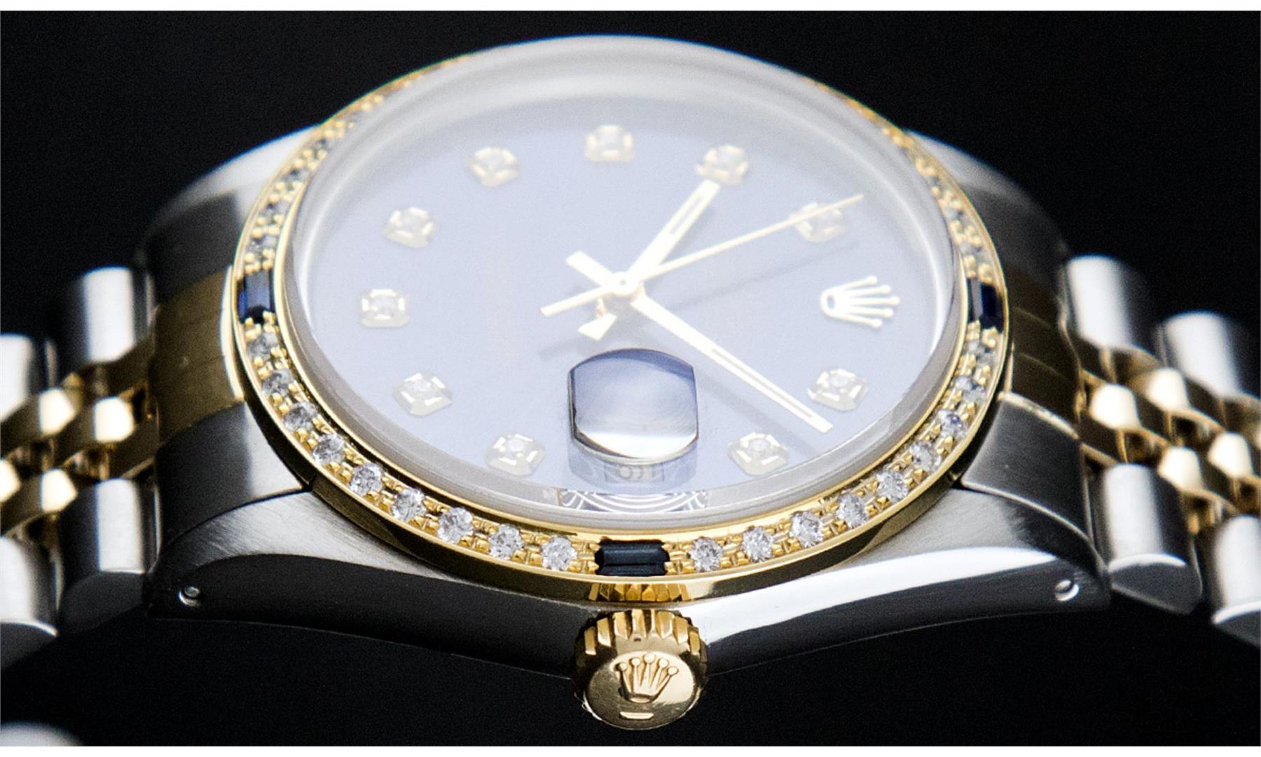 One Mens Pre Owned Rolex Yellow Gold And Stainless Steel Two Tone Rolex Datejust Polished, Serviced & Electronically Tested, Rolex Case: Yellow Gold And Stainless Steel Case: 36mm, Rolex Yellow Gold Crown, Custom Bezel: New 18K Yellow Gold Sapphire Beadset Diamond Bezel, Diamond Count: 36 Diamonds + 4 Sapphires. Custom Crystal: New Sapphire With Magnified Date Window. Custom Hands: New Luminescent Hands. Rolex Movement: Automatic Winding Movement 3035. Custom Dial: Custom Blue Dial With Added Diamond Hour Markers. Diamond Count: 10 Diamonds. Date Window: 3 O'Clock Position Date Display, Quickset, Model: Datejust Condition: G-6 Extra Fine. Rolex Bracelet: Two Tone Yellow Gold And Stainless Steel Jubilee Band. Bright Polish. 7.0 Inch Length, Adjustable. Standard Clasp, With Rolex Logo. This Watch Has Been Serviced Time Tested And Is In Excellent Condition It Is Free Of All Scratches And Dents.