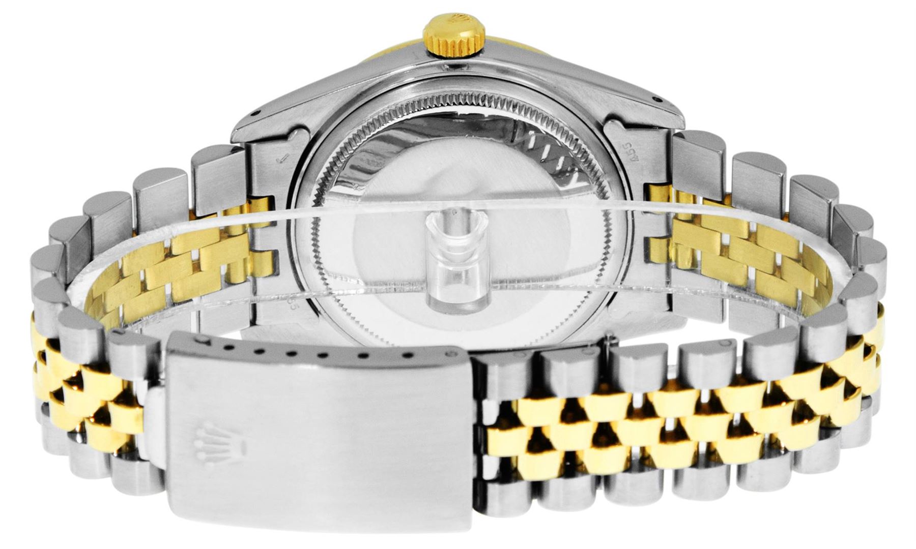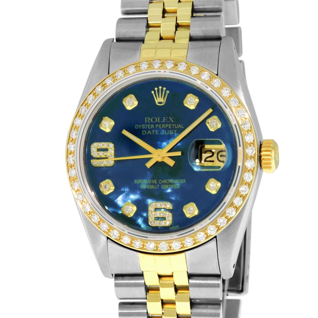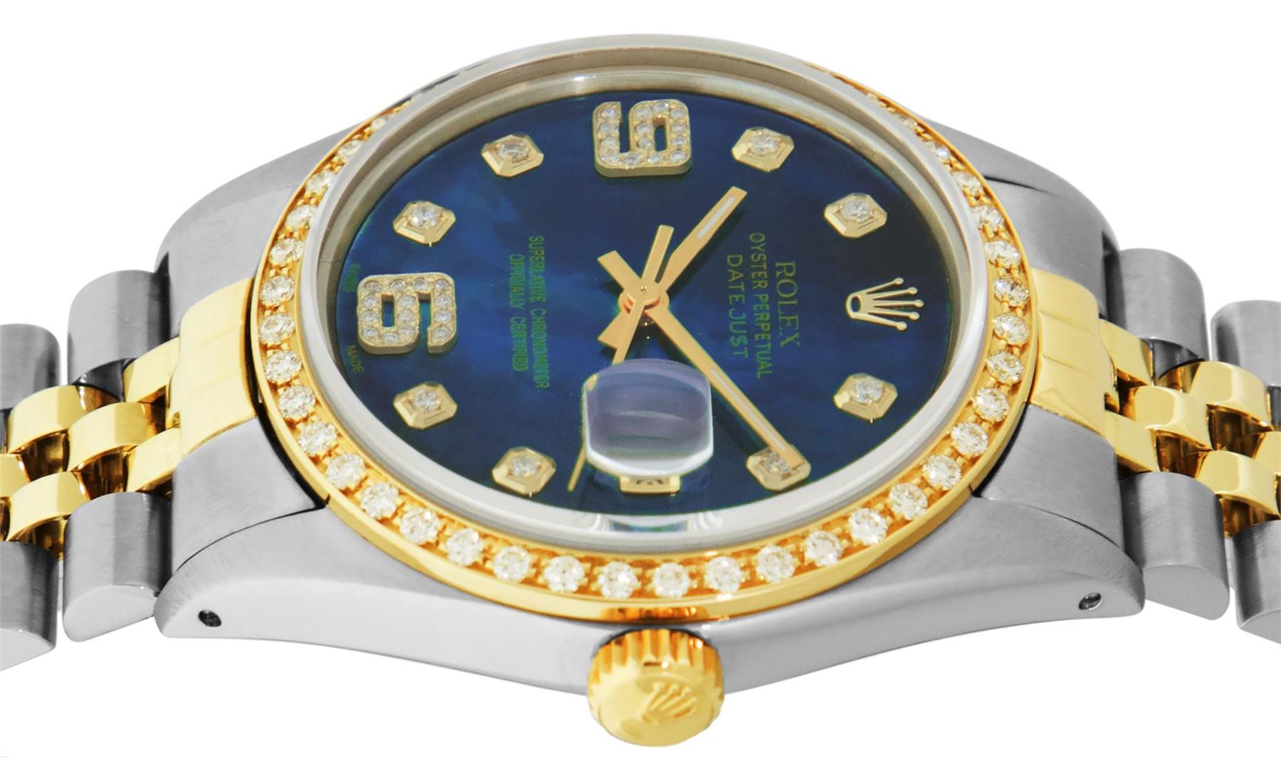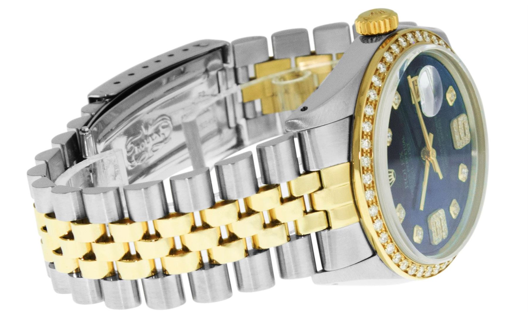 One Mens Pre Owned Yellow Gold Two Tone Rolex Datejust Polished, Serviced & Electronically Tested, Rolex Yellow Gold & Stainless Steel Case: 36mm, Rolex Yellow Gold Crown, Custom Bezel: New 18K Yellow Gold Bead set Diamond Bezel, Diamond Count: 44 Diamonds On Bezel, Clarity: SI-VS, Color: G to H. Custom Crystal: New Sapphire With Date Window. Rolex Movement: Automatic Winding Movement. Custom Dial: Blue MOP Diamond Dial with 9 & 6 Diamond Hour Markers, Diamond Count: 8 Diamonds + 28 Diamonds On 6 & 9 Hour Markers, Color: G To H In Color, Clarity: SI-VS, Date Window: 3 O'clock Position Date Display, Quickset, Model: Datejust. Condition: G-6 Extra Fine. Rolex Bracelet: Two Tone Yellow Gold & Stainless Steel Jubilee. Bright Polish. 7.0 Inch Length, Adjustable. Standard Clasp, With Rolex Logo. This Watch Has Been Serviced Time Tested And Is In Excellent Condition It Is Free Of All Scratches And Dents.