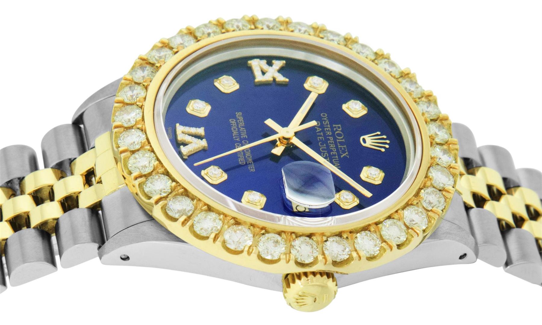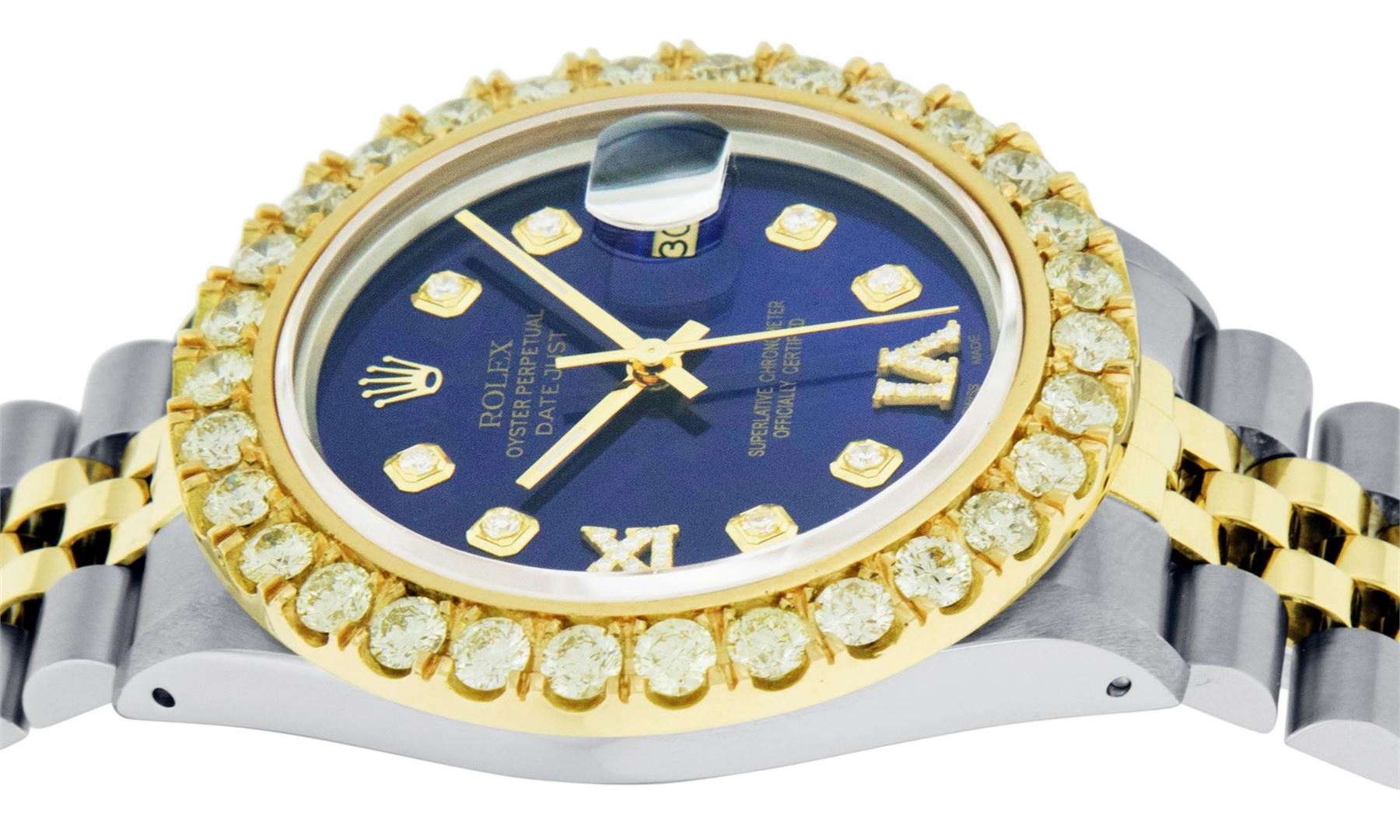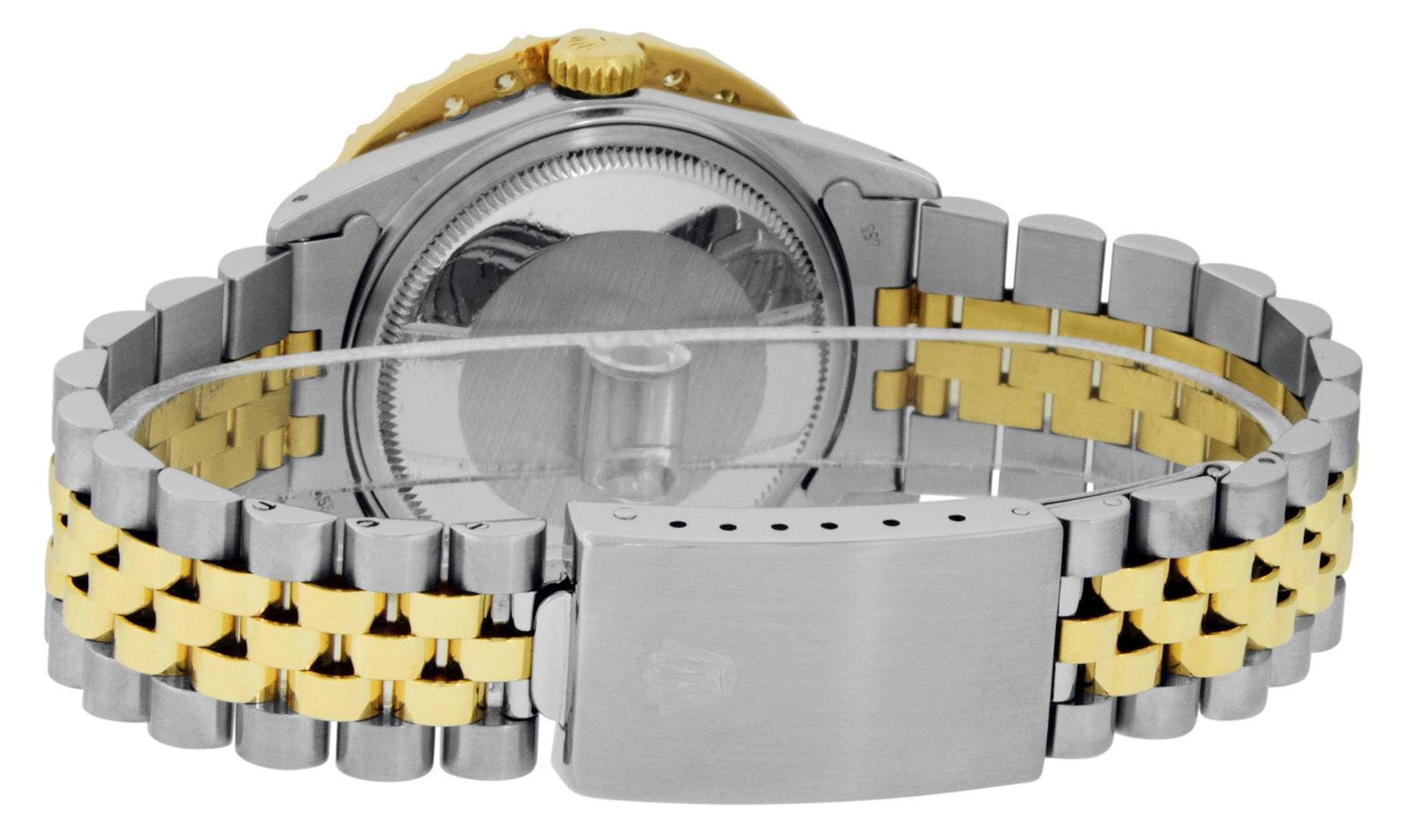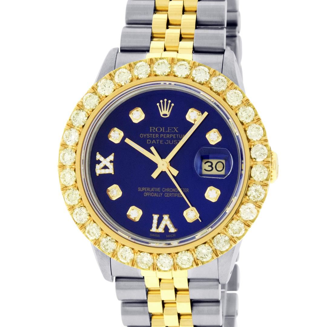 One Mens Pre Owned Yellow Gold Rolex Datejust Polished Bright with Satin Finish, Serviced & Electronically Tested, Stainless Steel Case: 36mm, Yellow Gold Crown, Custom Bezel: New 18K Yellow Gold 4ct Beadset Diamond Bezel, Diamond Count: 30 Diamonds, Tota