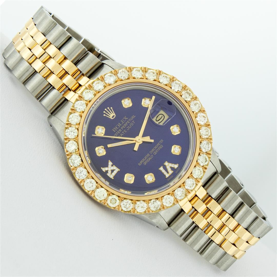 One Mens Pre Owned Yellow Gold Rolex Datejust Polished Bright with Satin Finish, Serviced & Electronically Tested, Stainless Steel Case: 36mm, Yellow Gold Crown, Custom Bezel: New 18K Yellow Gold 4ct Beadset Diamond Bezel, Diamond Count: 30 Diamonds, Total Bezel Weight 4.00 Carat, Clarity: SI-VS, Color: G to H. Custom Crystal: New Sapphire With Date Window. Custom Hands: New Luminescent Hands. Rolex Movement: Automatic Winding Movement. Custom Dial: Refinished To Blue With Custom Added Diamonds, Diamond Count: 8 Diamonds + 2 Roman Diamonds On Dial, Color: G to H, Clarity: VS. Date Window: 3 O'Clock Position Date Display, Quickset, Model: Datejust. Condition: G-6 Extra Fine. Rolex Bracelet: Yellow Gold And Stainless Steel Jubilee Band. Bright Polish & Satin Finish. 7.0 Inch Length, Adjustable. Standard Clasp, With Rolex Logo. This Watch Has Been Serviced And Polished It Is Free Of All Scratches And Dents.