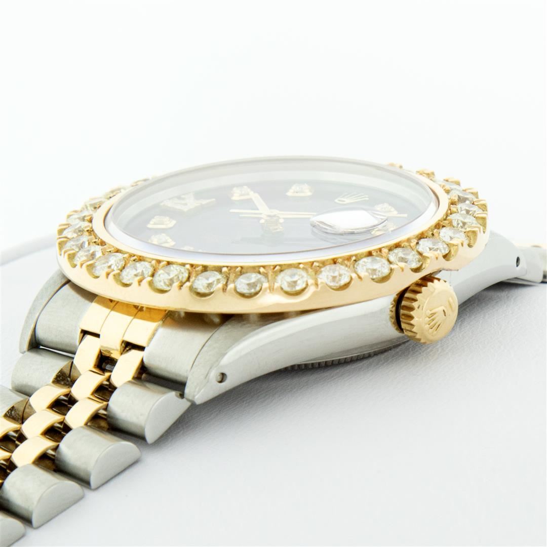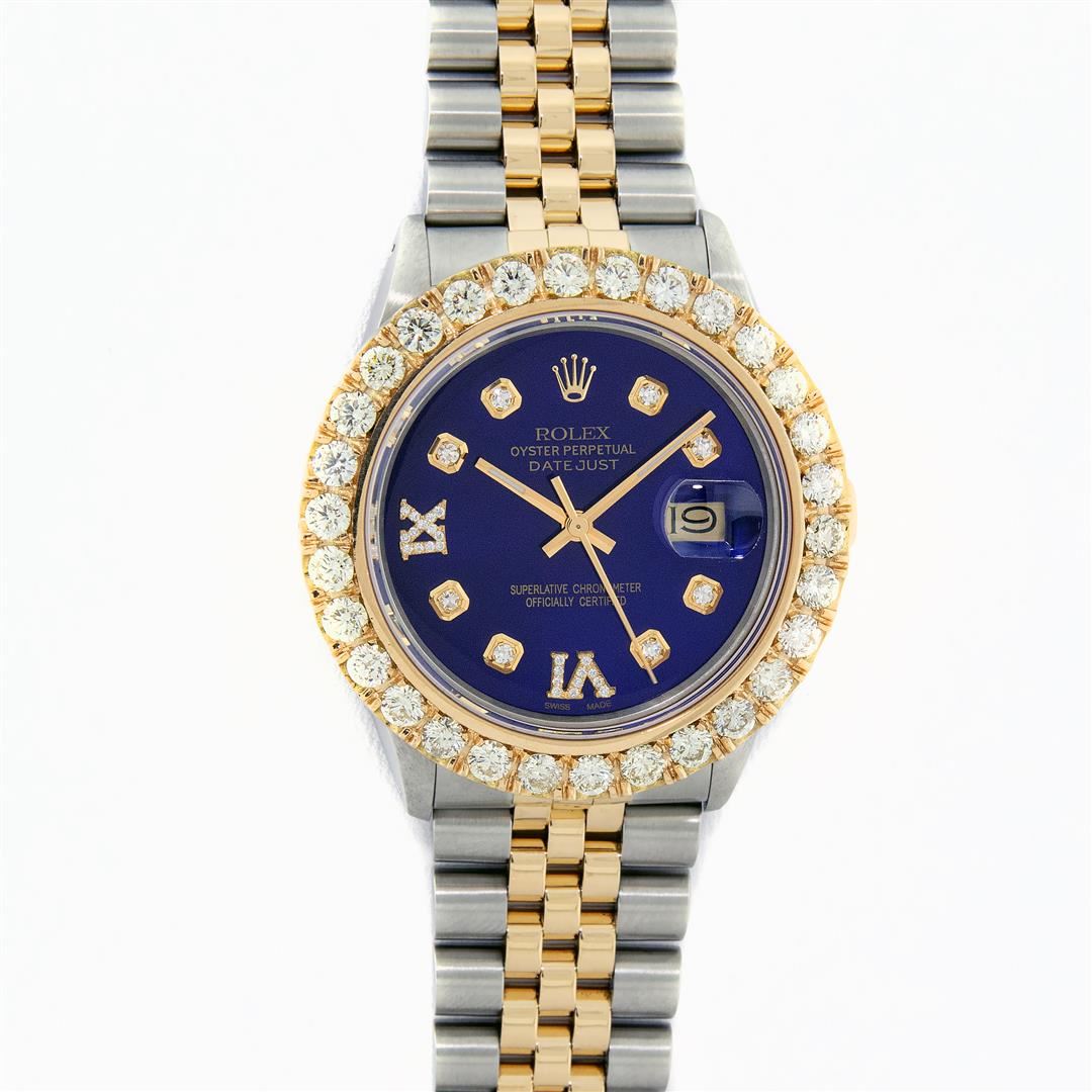 One Mens Pre Owned Yellow Gold Rolex Datejust Polished Bright with Satin Finish, Serviced & Electronically Tested, Stainless Steel Case: 36mm, Yellow Gold Crown, Custom Bezel: New 18K Yellow Gold 4ct Beadset Diamond Bezel, Diamond Count: 30 Diamonds, Total Bezel Weight 4.00 Carat, Clarity: SI-VS, Color: G to H. Custom Crystal: New Sapphire With Date Window. Custom Hands: New Luminescent Hands. Rolex Movement: Automatic Winding Movement. Custom Dial: Refinished To Blue With Custom Added Diamonds, Diamond Count: 8 Diamonds + 2 Roman Diamonds On Dial, Color: G to H, Clarity: VS. Date Window: 3 O'Clock Position Date Display, Quickset, Model: Datejust. Condition: G-6 Extra Fine. Rolex Bracelet: Yellow Gold And Stainless Steel Jubilee Band. Bright Polish & Satin Finish. 7.0 Inch Length, Adjustable. Standard Clasp, With Rolex Logo. This Watch Has Been Serviced And Polished It Is Free Of All Scratches And Dents.