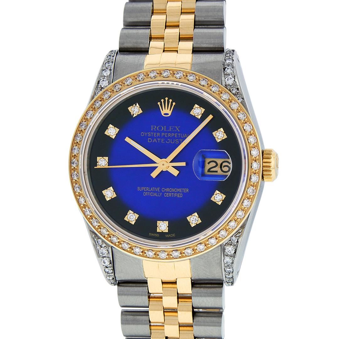 One Mens Pre Owned Yellow Gold Rolex Datejust Polished Bright with Satin Finish, Serviced & Electronically Tested, Rolex Stainless Steel Case: 36mm, Custom Diamond Lugs: 28 Diamonds On Lugs, Color: G to H, Clarity: SI-VS. Rolex Yellow Gold Crown, Custom B