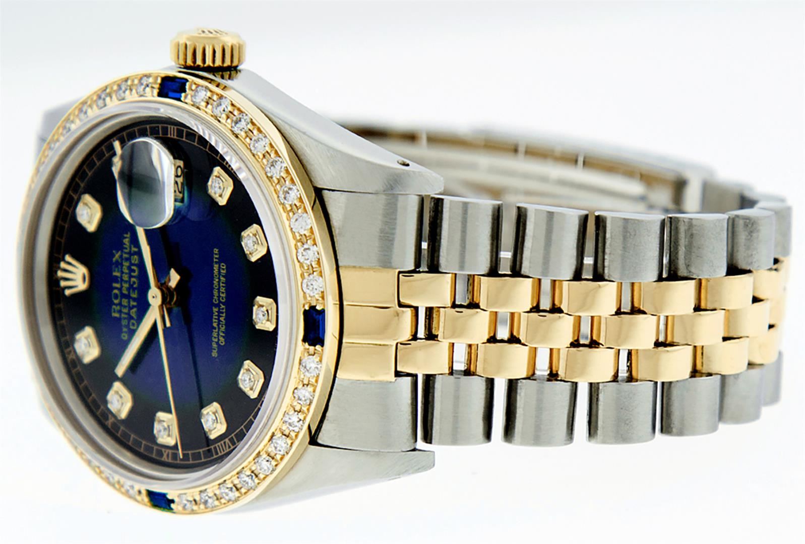 One Mens Pre Owned Yellow Gold Two Tone Rolex Datejust Polished, Serviced & Electronically Tested, Yellow Gold & Stainless Steel Case: 36mm, Yellow Gold Crown, Custom Bezel: New 18K Yellow Gold Sapphire Bead set Diamond Bezel, Diamond Count: 36 Diamonds + 4 Sapphires, Clarity: SI-VS, Color: G to H. Custom Crystal: New Sapphire With Date Window. Custom Hands: New Luminescent Hands. Rolex Movement: Automatic Winding Movement. Custom Dial: Blue Vignette With Diamond Hour Markers And Roman Track. Diamond Count: 10 Diamonds On Dial, Clarity: SI-VS, Color: Color G to H Date Window: 3 O'clock Position Date Display, Quickset, Model: Datejust, Condition: G-6 Extra Fine. Rolex Bracelet: Two Tone Yellow Gold & Stainless Steel Jubilee Band. Bright Polish. 7.0 Inch Length, Adjustable. Standard Clasp, With Rolex Logo. This Watch Has Been Serviced Time Tested And Is In Excellent Condition It Is Free Of All Scratches And Dents.