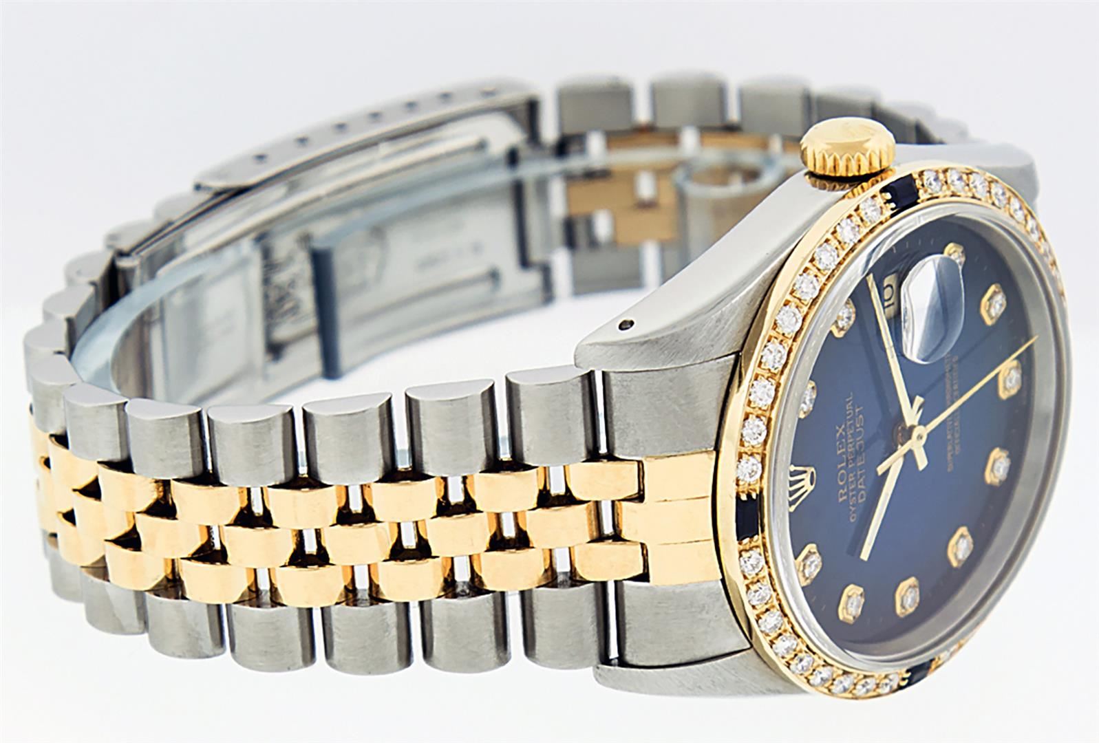One Mens Pre Owned Yellow Gold Two Tone Rolex Datejust Polished, Serviced & Electronically Tested, Rolex Case: Yellow Gold & Stainless Steel Case: 36mm, Rolex Yellow Gold Crown, Custom Bezel: New 18K Yellow Gold Sapphire Beadset Diamond Bezel, Diamond Count: 36 Diamonds + 4 Sapphires, Clarity: SI-VS, Color: G to H. Custom Crystal: New Sapphire Magnified Lens. Custom Hands: New Luminescent Hands. Rolex Movement: Automatic Winding Movement. Custom Dial: Refinished To Blue Vignette With Custom Added Diamond Hour Markers & Dash Track. Diamond Count: 10 Diamonds, Clarity: VS, Color: G to H Date Window: 3 O'Clock Position Date Display, Quickset, Model: Datejust, Condition: G-6 Extra Fine. Rolex Bracelet: Two Tone Yellow Gold & Stainless Steel Jubilee. Bright Polish. 7.0 Inch Length, Adjustable. Standard Clasp, With Rolex Logo. This Watch Has Been Serviced Time Tested And Is In Excellent Condition It Is Free Of All Scratches And Dents.