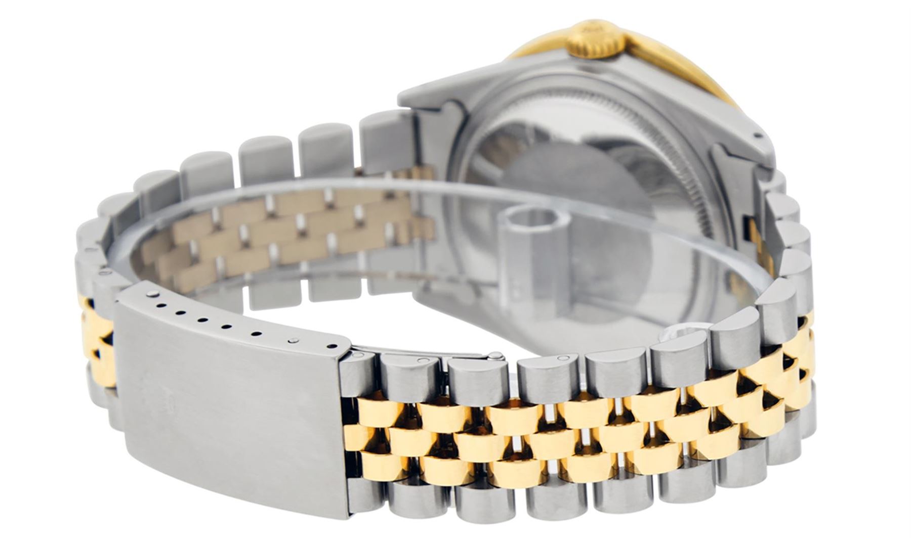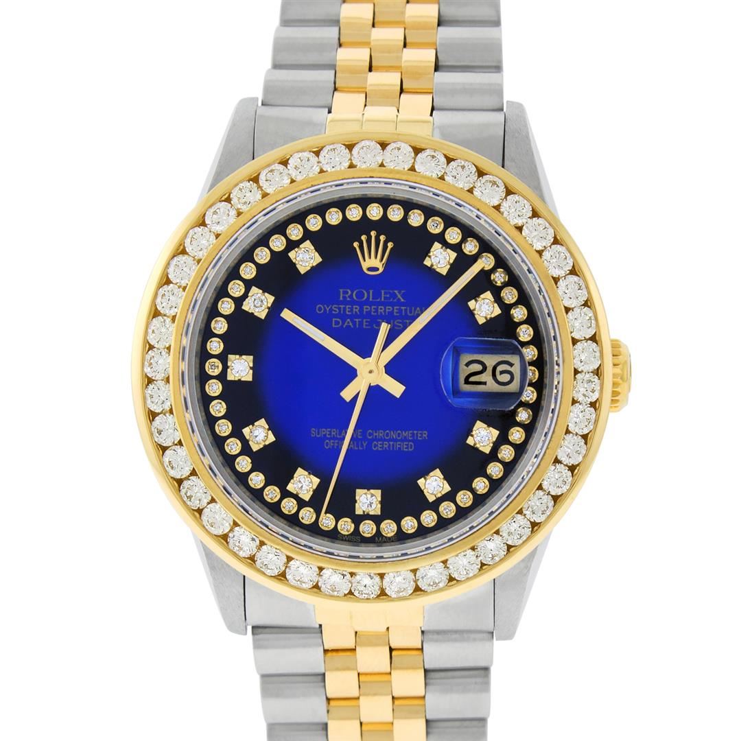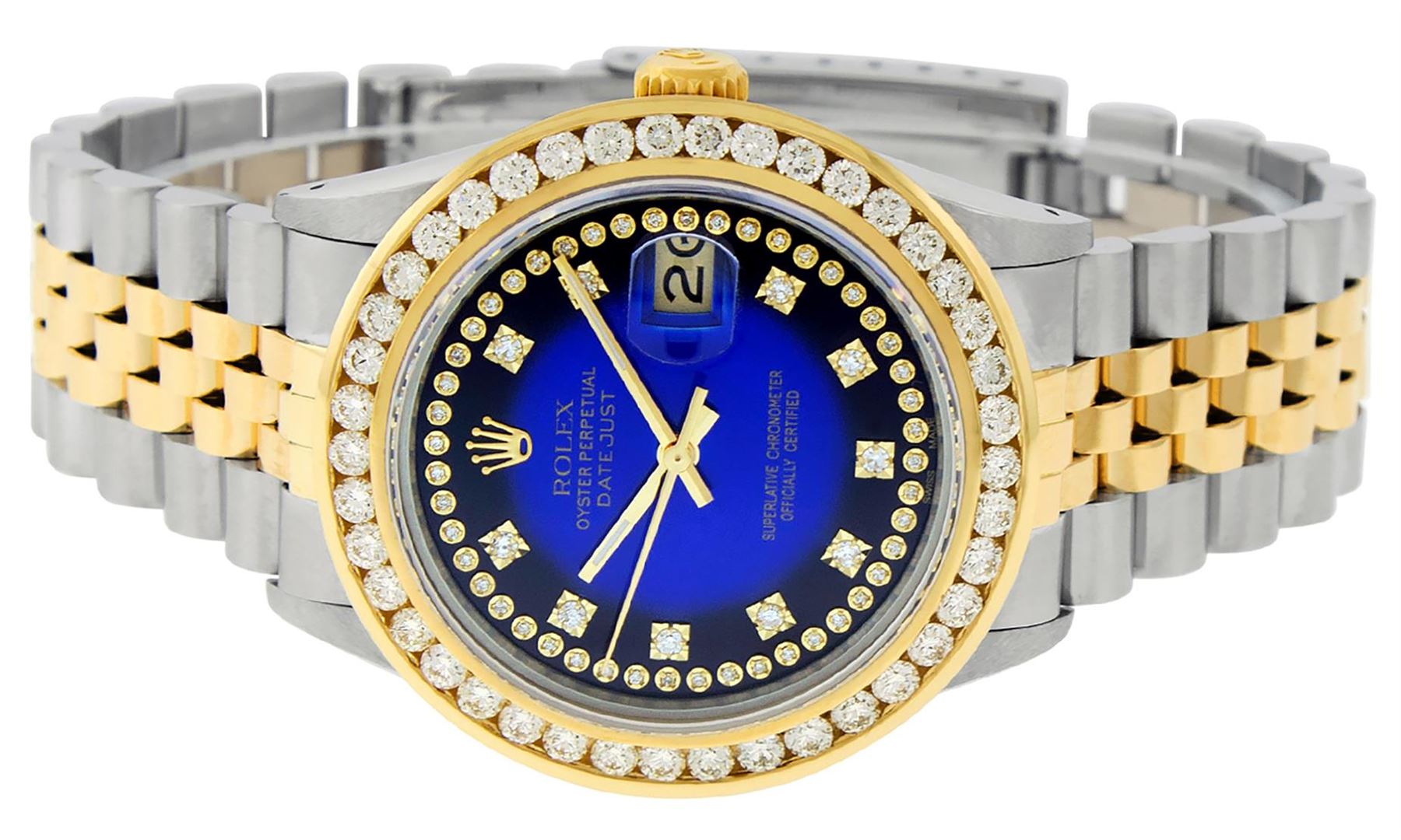 One Mens Pre Owned Yellow Gold Rolex Datejust Polished Bright with Satin Finish, Serviced & Electronically Tested, Rolex Stainless Steel Case: 36mm, Rolex Yellow Gold Crown, Custom Bezel: New 18K Yellow Gold 3ct Channel Set Diamond Bezel, Diamond Count: 4