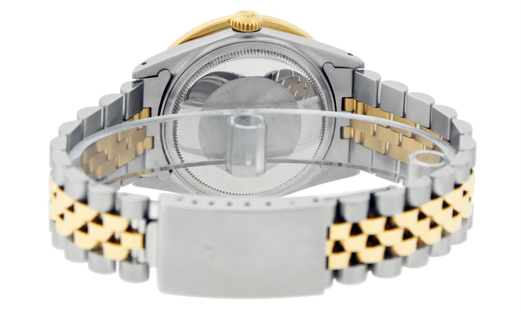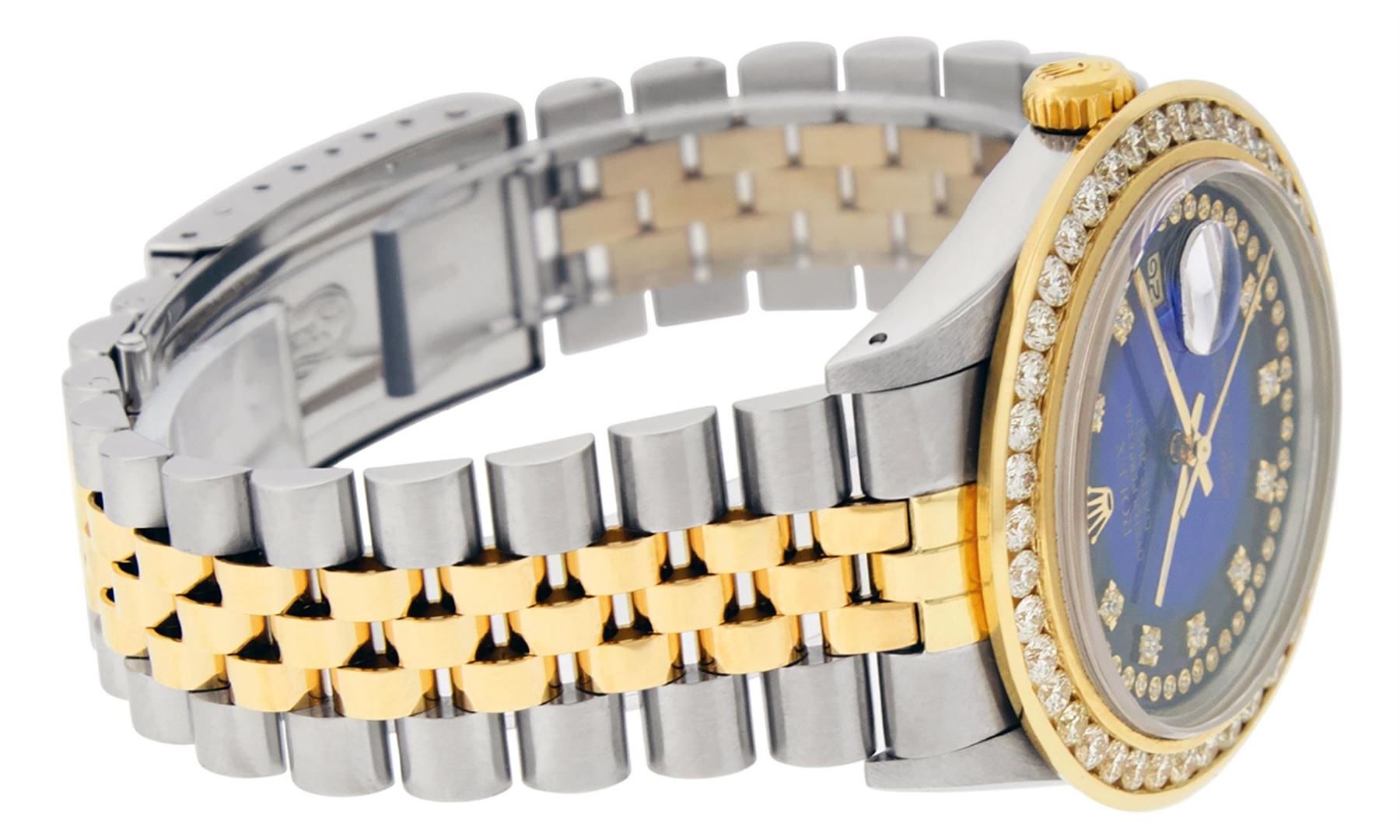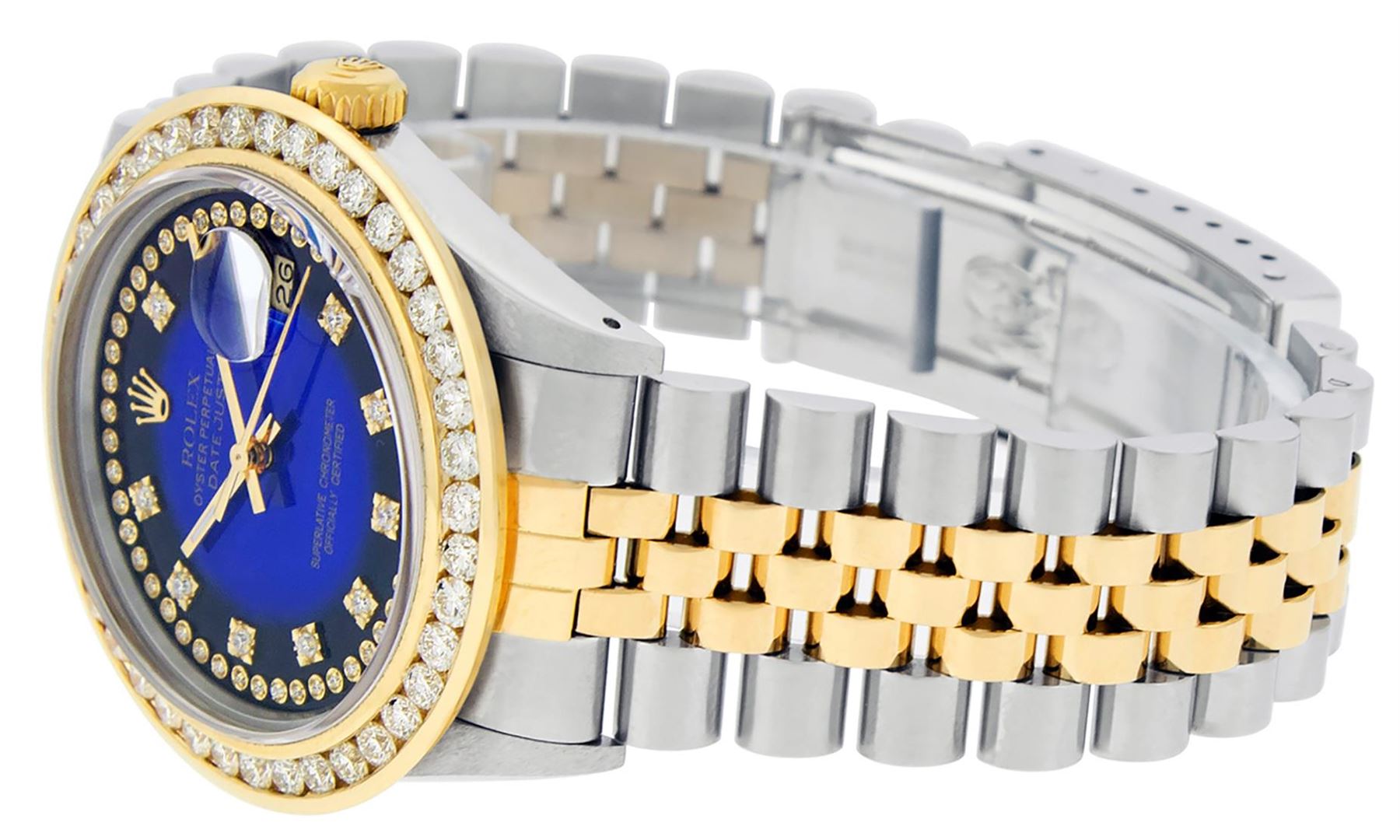 One Mens Pre Owned Yellow Gold Rolex Datejust Polished Bright with Satin Finish, Serviced & Electronically Tested, Rolex Stainless Steel Case: 36mm, Rolex Yellow Gold Crown, Custom Bezel: New 18K Yellow Gold 3ct Channel Set Diamond Bezel, Diamond Count: 4