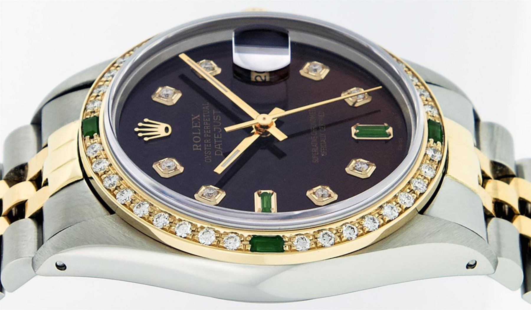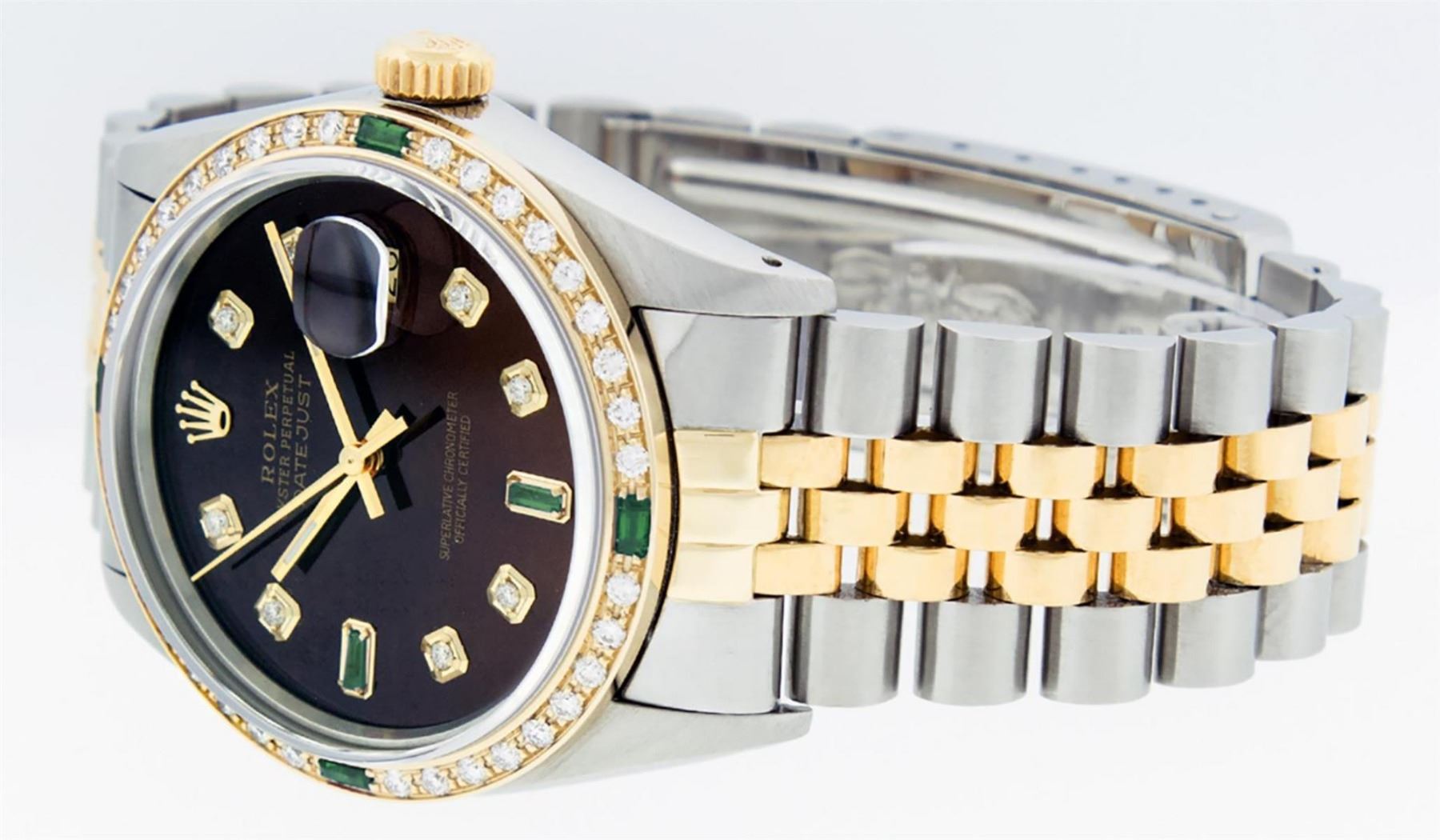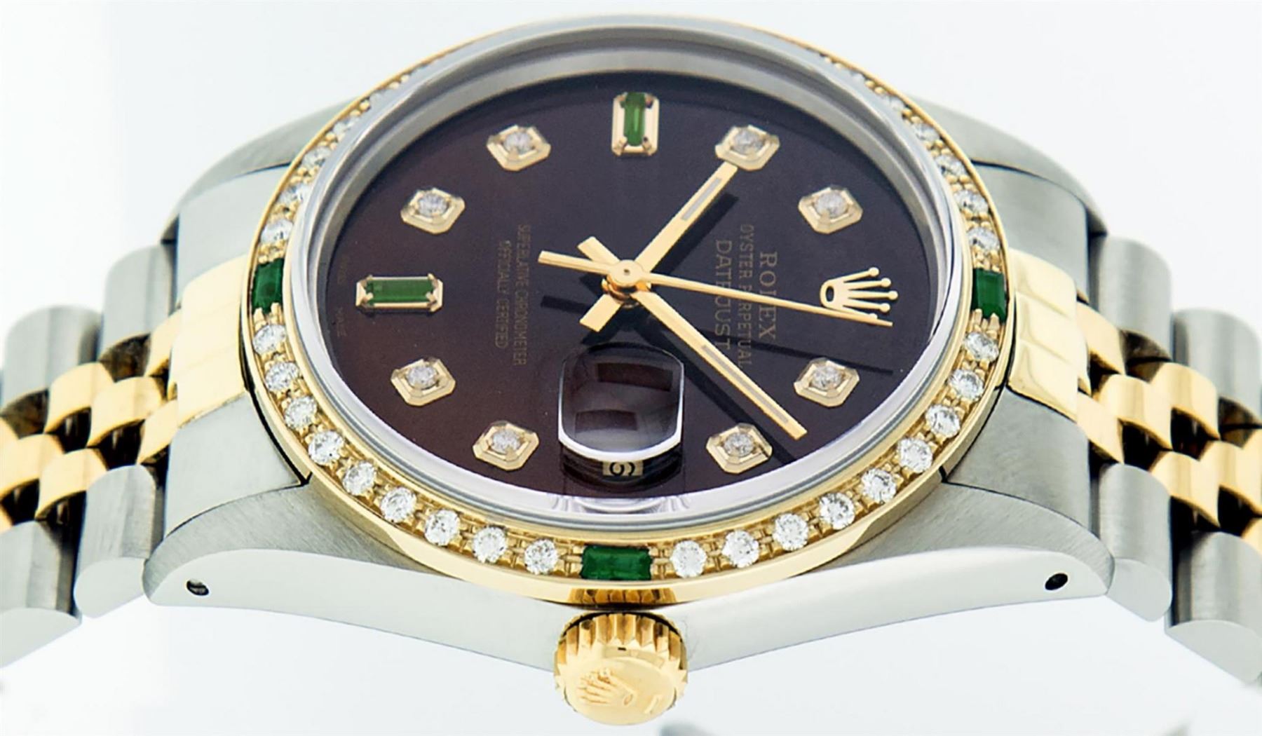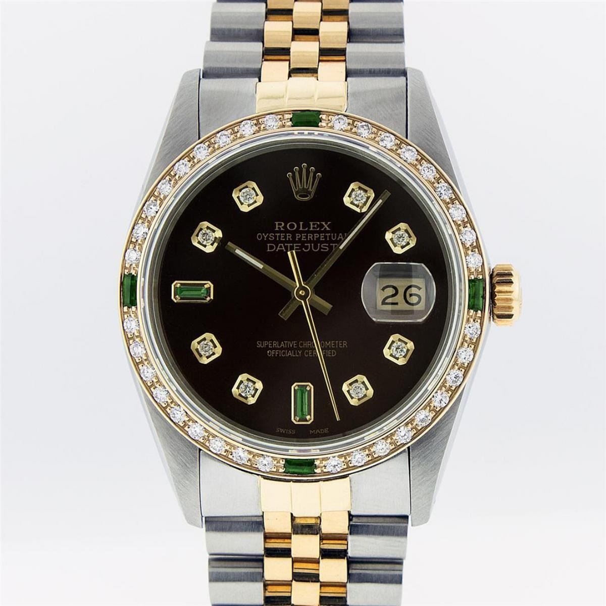 One Mens Yellow Gold Two Tone Rolex Datejust Polished, Serviced & Electronically Tested, Yellow Gold & Stainless Steel Case: 36mm, Yellow Gold Crown, Custom Bezel: New 18K Yellow Gold Emerald Beadset Diamond Bezel, Diamond Count: 36 Diamonds + 4 Emeralds, Total Weight 1.00 Carat, Clarity: SI-VS, Color: G to H. Custom Crystal: New Scratch Resistant Synthetic Sapphire Cyclops Lens. Movement: Automatic Winding Movement. Custom Dial: Brown Dial With Diamond Hour Markers and Synthetic Emerald Baguette Markers On 6 and 9, Stone Count: 8 Diamonds + 2 Synthetic Bagguette Emeralds In Dial. Date Window: 3 O'Clock Position Date Display, Quickset, Model: Datejust. Condition: G-6 Extra Fine. Bracelet: Two Tone Yellow Gold & Stainless Steel Jubilee Band. Bright Polish. 7.0 Inch Length, Adjustable. Standard Clasp, With Rolex Logo. This Watch Has Been Serviced Time Tested And Is In Excellent Condition It Is Free Of All Scratches And Dents.