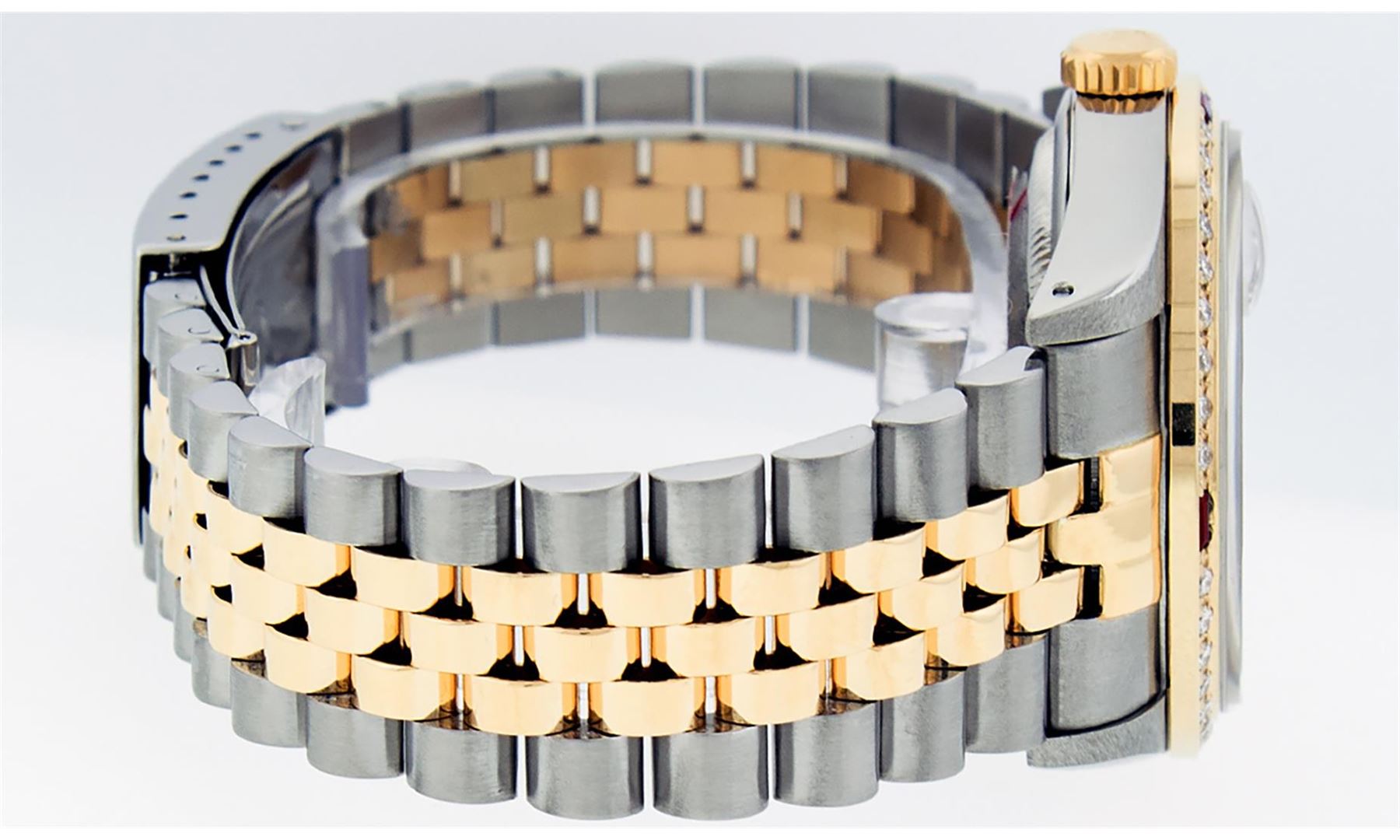One Mens Pre Owned Yellow Gold Two Tone Rolex Datejust Polished, Serviced & Electronically Tested, Rolex Yellow Gold & Stainless Steel Case: 36mm, Rolex Yellow Gold Crown, Custom Bezel: New 18K Yellow Gold Ruby Bead set Diamond Bezel, Diamond Count: 36 Diamonds + 4 Rubies, Clarity: SI-VS, Color: G to H. Custom Crystal: New Sapphire With Date Window. Custom Hands: New Luminescent Hands. Rolex Movement: Automatic Winding Movement. Custom Dial: Refinished Brown Dial With Custom Added Diamonds. Diamond Count: 10 Diamonds In Dial, Clarity: SI-VS, Color: Color G to H Date Window: 3 O'clock Position Date Display, Quickset, Model: Datejust. Condition: G-6 Extra Fine. Rolex Bracelet: Two Tone Yellow Gold & Stainless Steel Jubilee. Bright Polish. 7.0 Inch Length, Adjustable. Standard Clasp, With Rolex Logo. This Watch Has Been Serviced Time Tested And Is In Excellent Condition It Is Free Of All Scratches And Dents.