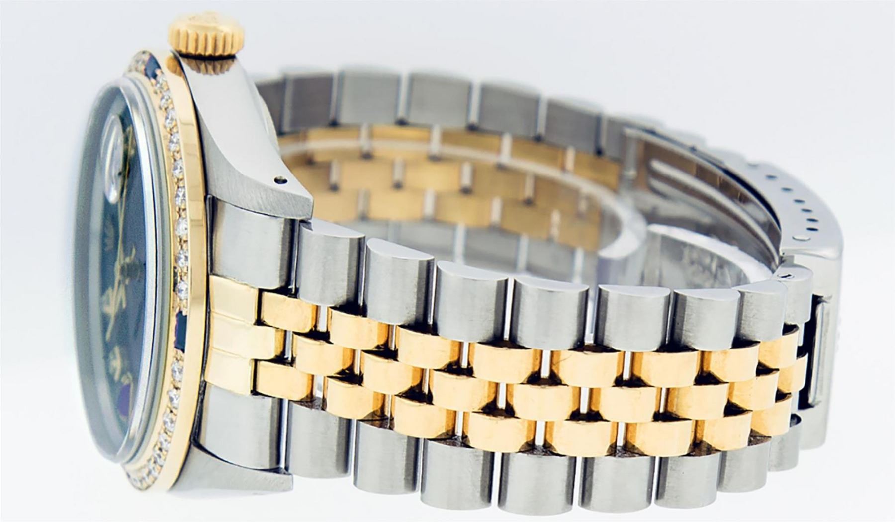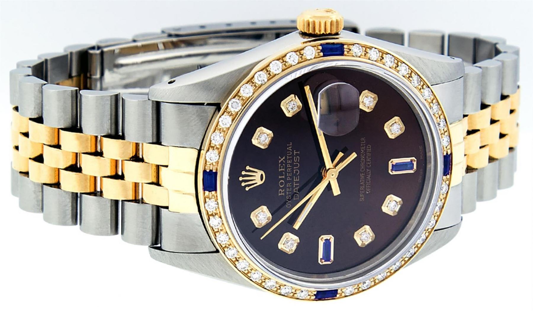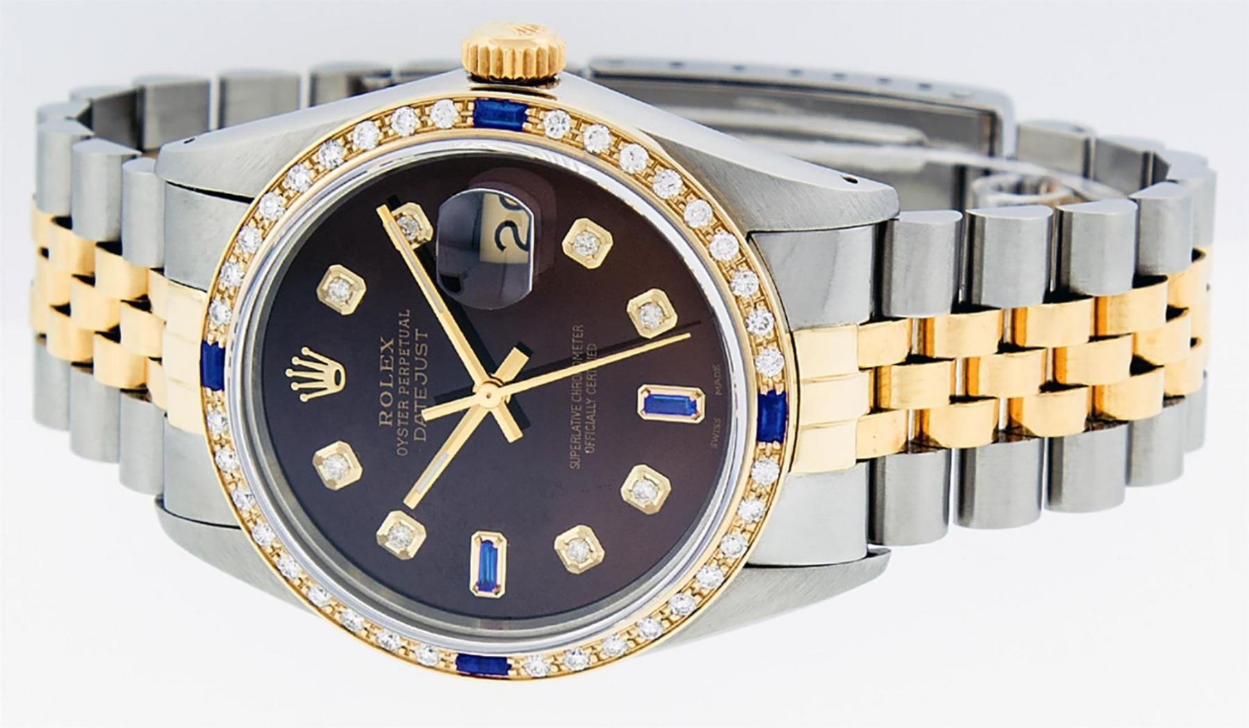 One Mens Yellow Gold Two Tone Rolex Datejust Polished, Serviced & Electronically Tested, Yellow Gold & Stainless Steel Case: 36mm, Yellow Gold Crown, Custom Bezel: New 18K Yellow Gold Sapphire Beadset Diamond Bezel, Diamond Count: 36 Diamonds + 4 Sapphires, Total Weight 1.00 Carat, Clarity: SI-VS, Color: G to H. Custom Crystal: New Scratch Resistant Synthetic Sapphire Cyclops Lens. Movement: Automatic Winding Movement. Custom Dial: Brown Dial With Diamond Hour Markers and Synthetic Sapphire Baguette Markers On 6 and 9, Stone Count: 8 Diamonds + 2 Synthetic Bagguette Sapphires In Dial. Date Window: 3 O'Clock Position Date Display, Quickset, Model: Datejust. Condition: G-6 Extra Fine. Bracelet: Two Tone Yellow Gold & Stainless Steel Jubilee Band. Bright Polish. 7.0 Inch Length, Adjustable. Standard Clasp, With Rolex Logo. This Watch Has Been Serviced Time Tested And Is In Excellent Condition It Is Free Of All Scratches And Dents.