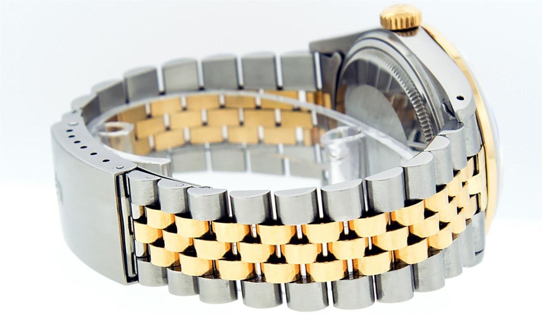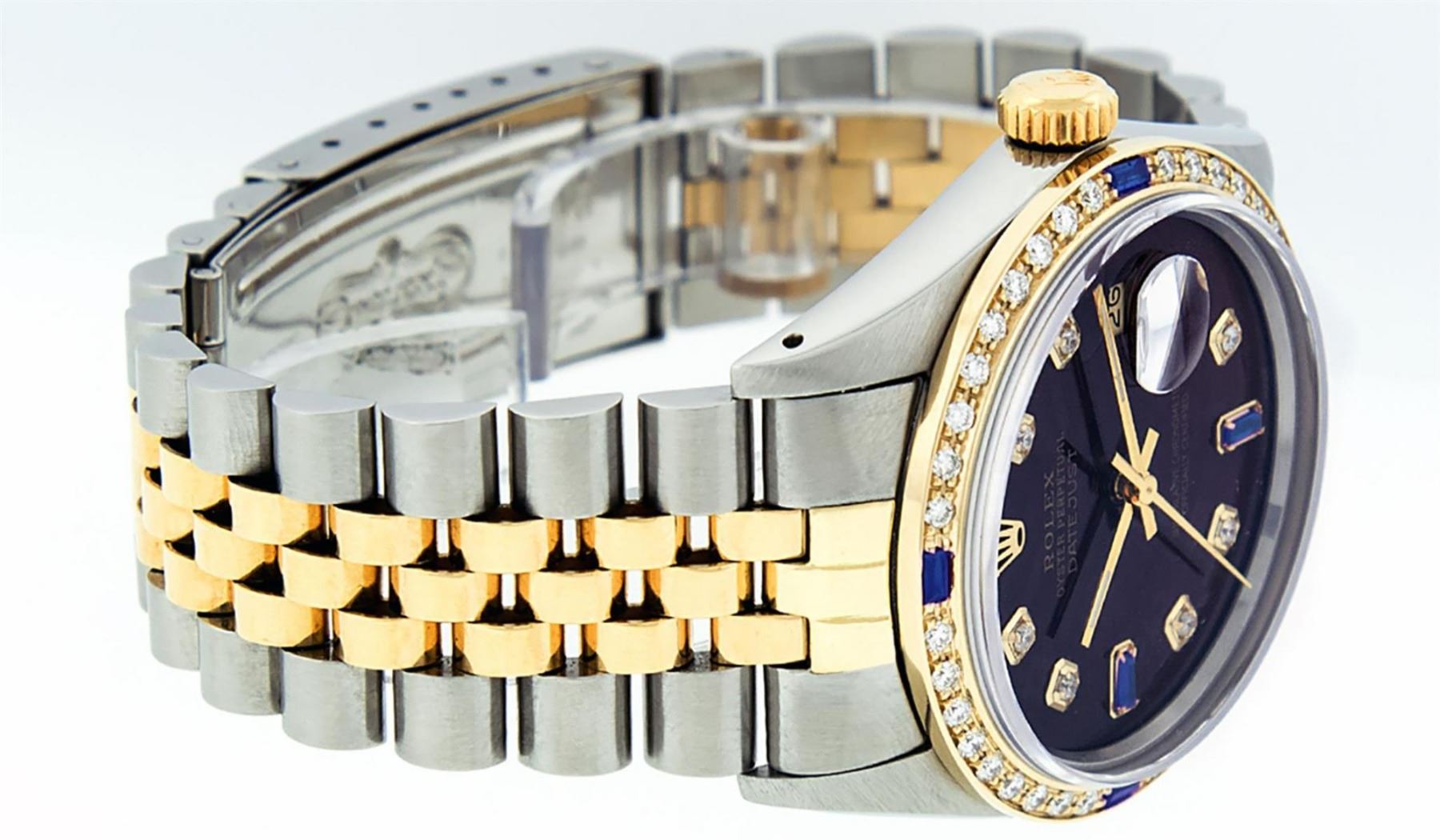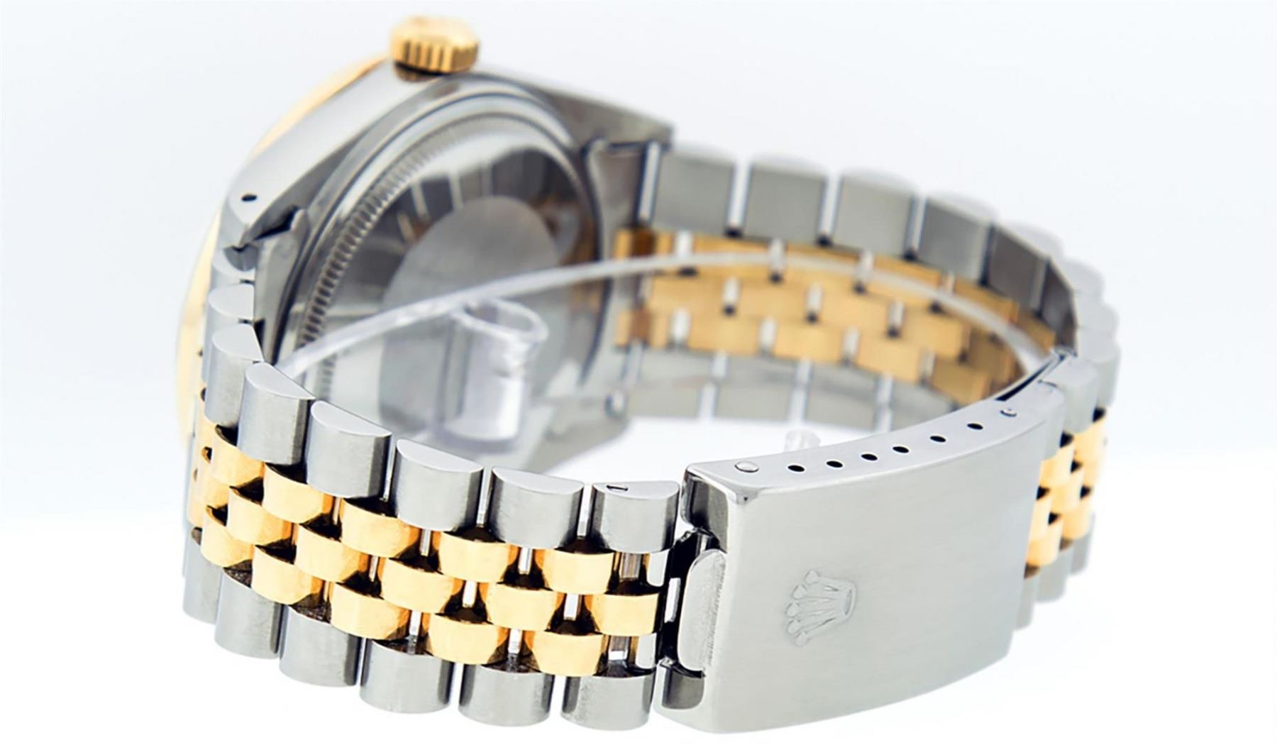 One Mens Yellow Gold Two Tone Rolex Datejust Polished, Serviced & Electronically Tested, Yellow Gold & Stainless Steel Case: 36mm, Yellow Gold Crown, Custom Bezel: New 18K Yellow Gold Sapphire Beadset Diamond Bezel, Diamond Count: 36 Diamonds + 4 Sapphires, Total Weight 1.00 Carat, Clarity: SI-VS, Color: G to H. Custom Crystal: New Scratch Resistant Synthetic Sapphire Cyclops Lens. Movement: Automatic Winding Movement. Custom Dial: Brown Dial With Diamond Hour Markers and Synthetic Sapphire Baguette Markers On 6 and 9, Stone Count: 8 Diamonds + 2 Synthetic Bagguette Sapphires In Dial. Date Window: 3 O'Clock Position Date Display, Quickset, Model: Datejust. Condition: G-6 Extra Fine. Bracelet: Two Tone Yellow Gold & Stainless Steel Jubilee Band. Bright Polish. 7.0 Inch Length, Adjustable. Standard Clasp, With Rolex Logo. This Watch Has Been Serviced Time Tested And Is In Excellent Condition It Is Free Of All Scratches And Dents.