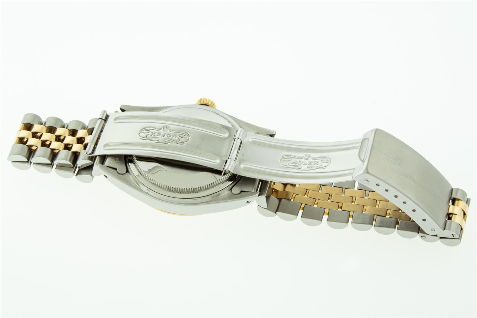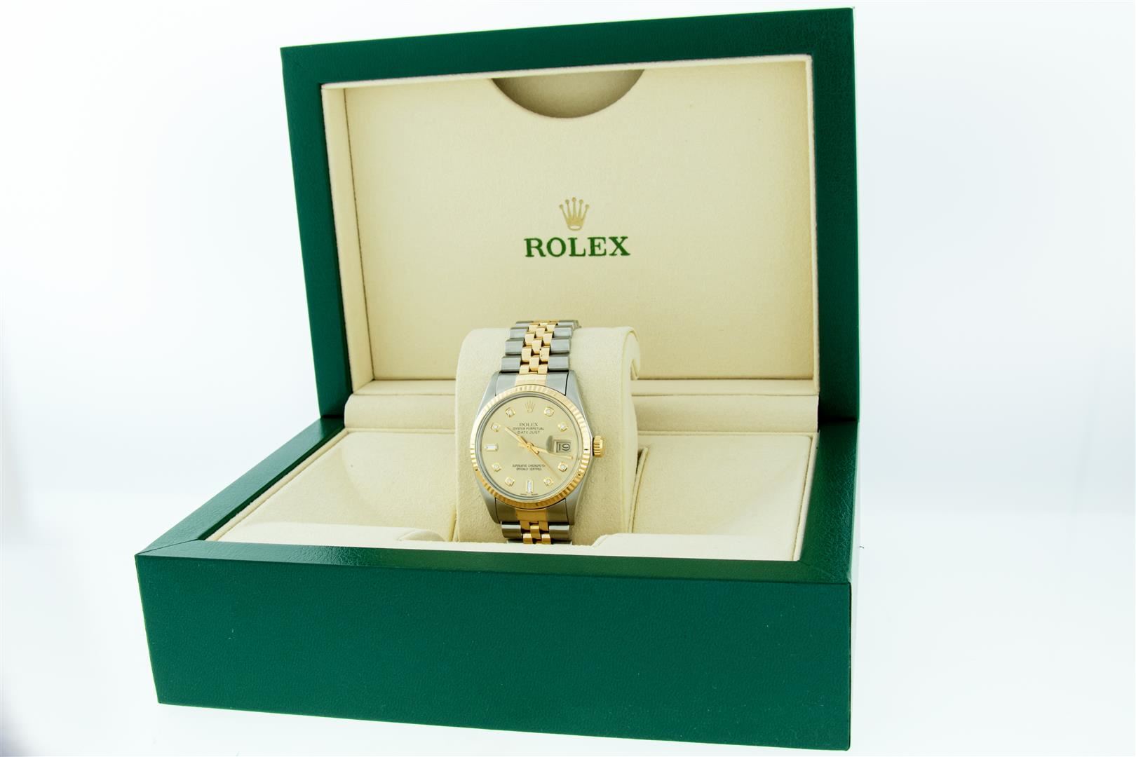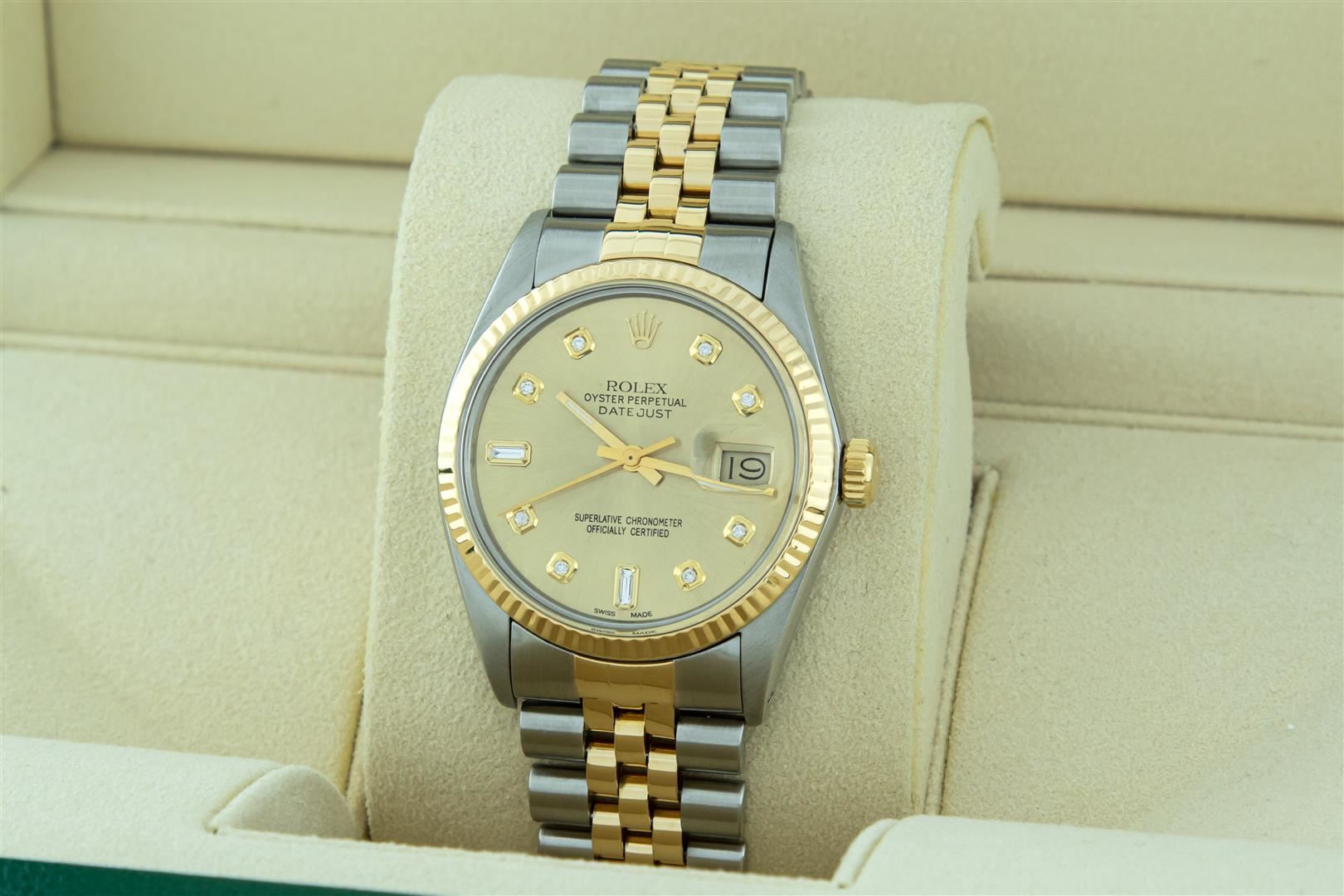 One Mens Pre Owned Yellow Gold Two Tone Rolex Datejust Polished, Serviced & Electronically Tested, Rolex Yellow Gold & Stainless Steel Case: 36mm, Rolex Yellow Gold Crown, Rolex Bezel: Yellow Gold Fluted Bezel. Custom Crystal: New Acrylic Cyclops Lens. Custom Hands: New Luminescent Hands. Rolex Movement: Automatic Winding Movement. Custom Dial: Refinish To Champagne With Added Diamonds, Diamond Count: 8 Diamonds + 2 Baguette Diamonds in Dial, G To H In Color, SI-VS Clarity. Date Window: 3 O'Clock Position Date Display, Quickset, Model: Datejust, Condition: G-6 Extra Fine. Rolex Bracelet: Two Tone Yellow Gold & Stainless Steel Jubilee Band. Bright Polish. 7.0 Inch Length, Adjustable. Standard Clasp, With Rolex Logo. This Watch Has Been Serviced And Polished It Is Free Of All Scratches And Dents. This Watch Comes With A Rolex Box.