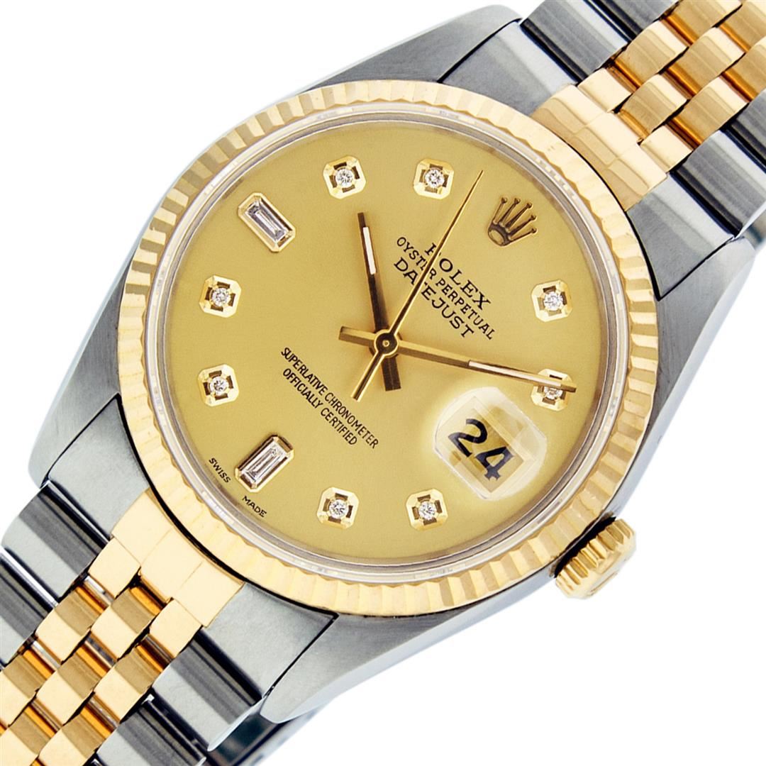 One Mens Pre Owned Yellow Gold Two Tone Rolex Datejust Polished, Serviced & Electronically Tested, Rolex Yellow Gold & Stainless Steel Case: 36mm, Rolex Yellow Gold Crown, Rolex Bezel: Yellow Gold Fluted Bezel. Custom Crystal: New Acrylic Cyclops Lens. Custom Hands: New Luminescent Hands. Rolex Movement: Automatic Winding Movement. Custom Dial: Refinish To Champagne With Added Diamonds, Diamond Count: 8 Diamonds + 2 Baguette Diamonds in Dial, G To H In Color, SI-VS Clarity. Date Window: 3 O'Clock Position Date Display, Quickset, Model: Datejust, Condition: G-6 Extra Fine. Rolex Bracelet: Two Tone Yellow Gold & Stainless Steel Jubilee Band. Bright Polish. 7.0 Inch Length, Adjustable. Standard Clasp, With Rolex Logo. This Watch Has Been Serviced And Polished It Is Free Of All Scratches And Dents.