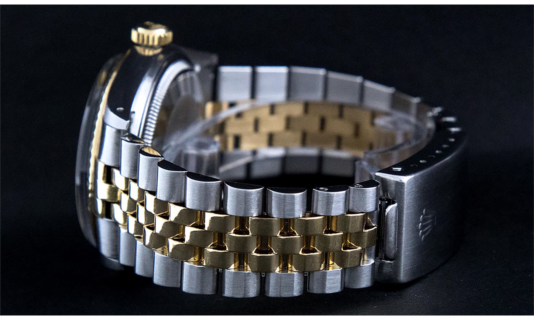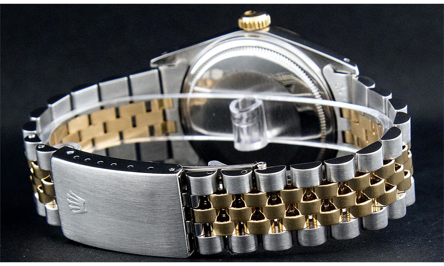 One Mens Pre Owned Yellow Gold Two Tone Rolex Datejust Polished, Serviced & Electronically Tested, Rolex Yellow Gold & Stainless Steel Case: 36mm, Rolex Yellow Gold Crown, Rolex Bezel: Yellow Gold Fluted Bezel. Custom Crystal: New Acrylic Cyclops Lens. Custom Hands: New Luminescent Hands. Rolex Movement: Automatic Winding Movement. Custom Dial: Refinished To Champagne With Added Diamonds, Diamond Count: 8 Diamonds + 2 Baguette Diamonds in Dial, G To H In Color, SI-VS Clarity. Date Window: 3 O'Clock Position Date Display, Quickset, Model: Datejust, Condition: G-6 Extra Fine. Rolex Bracelet: Two Tone Yellow Gold & Stainless Steel Jubilee Band. Bright Polish. 7.0 Inch Length, Adjustable. Standard Clasp, With Rolex Logo. This Watch Has Been Serviced And Polished It Is Free Of All Scratches And Dents.