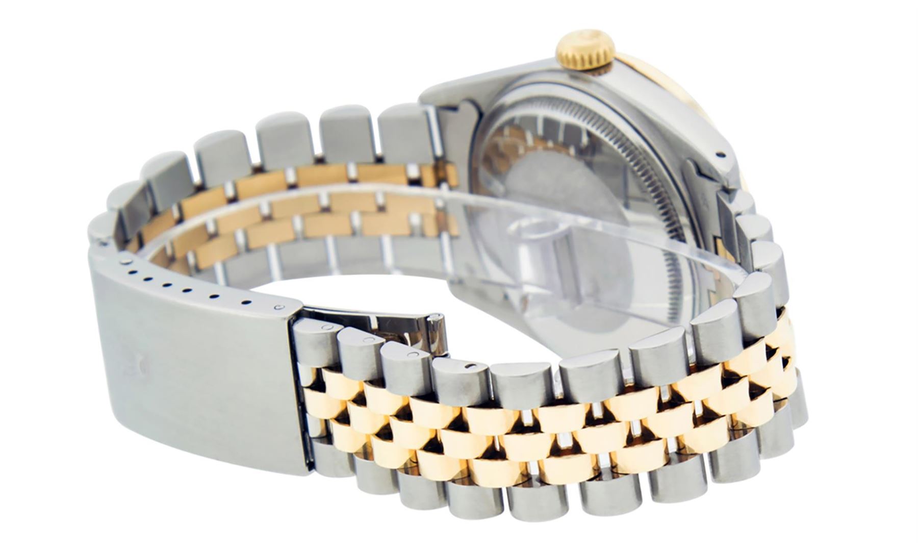 One Mens Pre Owned Yellow Gold Two Tone Rolex Datejust Polished, Serviced & Electronically Tested, Rolex Yellow Gold & Stainless Steel Case: 36mm, Rolex Yellow Gold Crown, Custom Bezel: New 18K Yellow Gold Bead set Diamond Bezel, Diamond Count: 44 Diamond