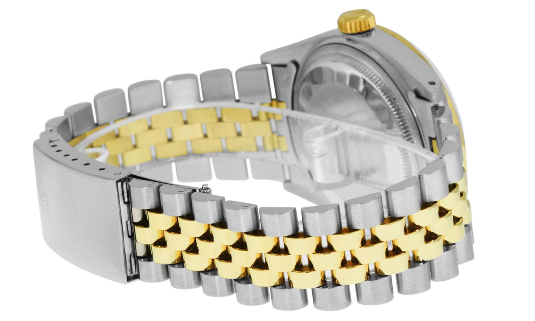 One Mens Pre Owned Yellow Gold Two Tone Rolex Datejust Polished, Serviced & Electronically Tested, Rolex Yellow Gold & Stainless Steel Case: 36mm, Rolex Yellow Gold Crown, Custom Bezel: New 18K Yellow Gold Bead set Diamond Bezel, Diamond Count: 44 Diamonds In Bezel, Total Weight 1.00 Carat, Clarity: SI-VS, Color: G to H. Custom Crystal: New Sapphire With Date Window. Custom Hands: New Luminescent Hands. Rolex Movement: Automatic Winding Movement. Custom Dial: Refinished To Champagne With Custom Added Diamond Hour Markers. Diamond Count: 10 Diamonds In Dial, Clarity: SI-VS, Color: Color G to H Date Window: 3 O'clock Position Date Display, Quickset, Model: Datejust. Condition: G-6 Extra Fine. Rolex Bracelet: Two Tone Yellow Gold & Stainless Steel Jubilee. Bright Polish. 7.0 Inch Length, Adjustable. Standard Clasp, With Rolex Logo. This Watch Has Been Serviced Time Tested And Is In Excellent Condition It Is Free Of All Scratches And Dents.