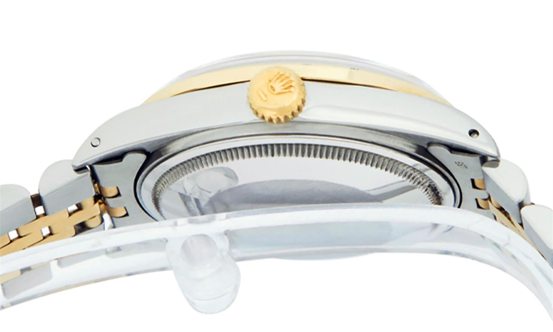 One Mens Pre Owned Yellow Gold Two Tone Rolex Datejust Polished, Serviced & Electronically Tested, Rolex 18K Yellow Gold & Stainless Steel Case: 36mm, Rolex 18K Yellow Gold Crown, Custom Bezel: New 18K Yellow Gold Beadset Diamond Bezel, Diamond Count: 44 Diamonds, Clarity: SI-VS, Color: G to H. Crystal: New Sapphire Magnified Lens. Custom Hands: New Luminescent Hands. Rolex Movement: Automatic Winding Movement. Custom Dial: Refinished To Champagne Custom Added Diamonds Baguette Diamond Hour Markers On 6 and 9, Diamond Count: 8 + 2 Baguette Diamonds in Dial G To H In Color, Clarity: VS2-SI1, Date Window: 3 O'Clock Position Date Display, Quickset, Model: Condition: G-6 Extra Fine. Rolex Bracelet: Two Tone Yellow Gold & Stainless Steel Jubilee. Bright Polish. 7.0 Inch Length, Adjustable. Standard Clasp, With Rolex Logo. This Watch Has Been Serviced Time Tested And Is In Excellent Condition It Is Free Of All Scratches And Dents.