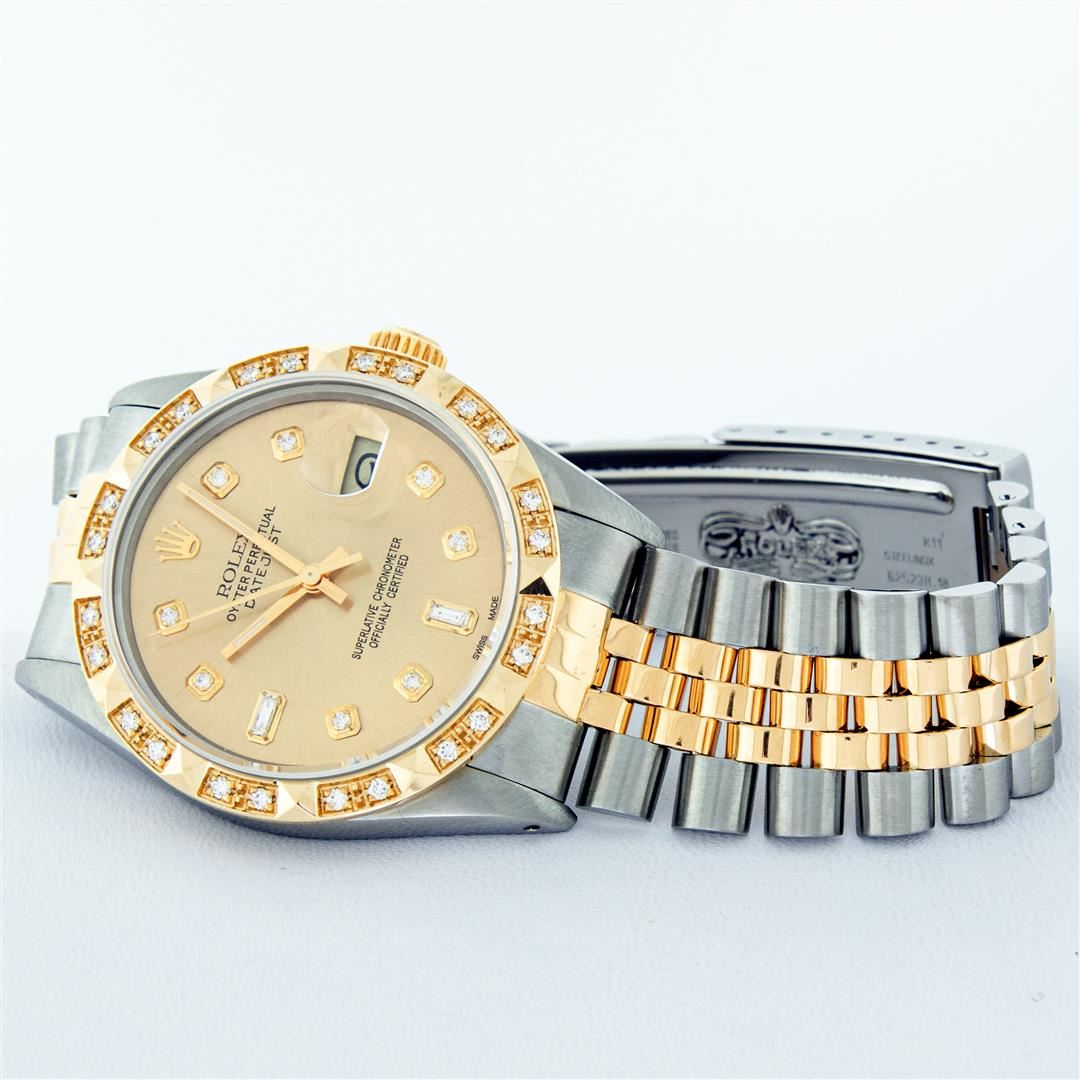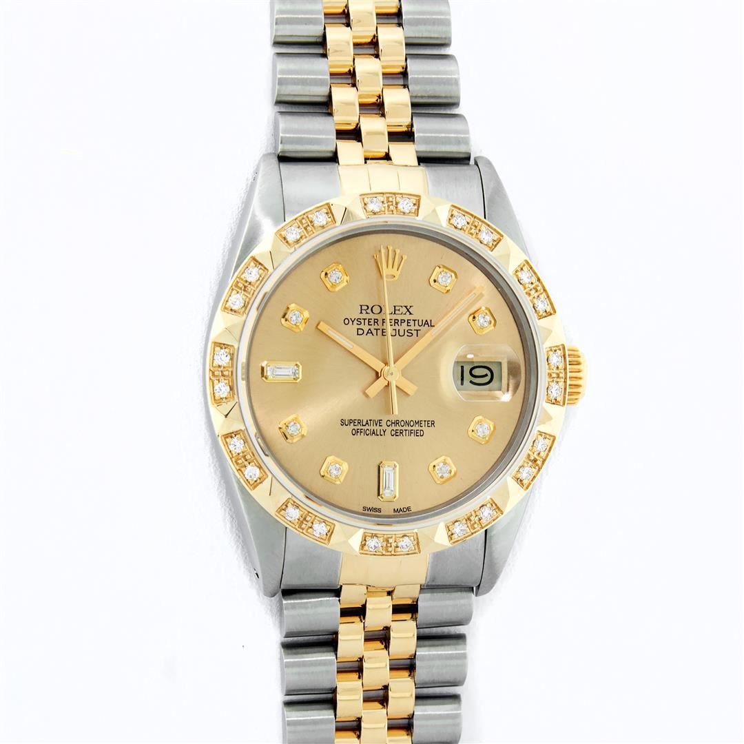 One Mens Pre Owned Yellow Gold Rolex Datejust Polished Bright with Satin Finish, Serviced & Electronically Tested, Rolex Stainless Steel Case: 36mm, Yellow Gold Crown, Custom Bezel: New 18K Yellow Gold Pyramid Diamond Bezel, Diamond Count: 24 Diamonds, Clarity: SI-VS, Color: G to H. Custom Crystal: New Sapphire Magnified Date. Custom Hands: New Luminescent Hands. Rolex Movement: Automatic Winding Movement. Custom Dial: Refinished Champagne Custom Diamonds, Diamond Count: 8 Diamonds + 2 Baguette Diamonds In Dial, Color: G to H, Clarity: VS. Date Window: 3 O'Clock Position Date Display, Quickset, Model: Datejust. Condition: G-6 Extra Fine. Rolex Bracelet: Yellow Gold And Stainless Steel Jubilee Band. Bright Polish & Satin Finish. 7.0 Inch Length, Adjustable. Standard Clasp, With Rolex Logo. This Watch Has Been Serviced And Polished It Is Free Of All Scratches And Dents.