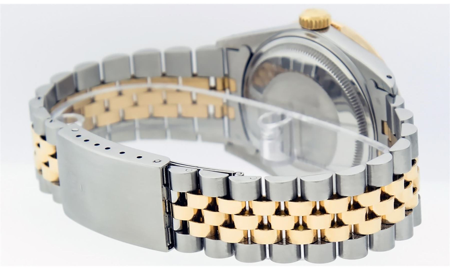 One Mens Pre Owned Yellow Gold Rolex Datejust Polished Bright with Satin Finish, Serviced & Electronically Tested, Rolex Stainless Steel Case: 36mm, Yellow Gold Crown, Custom Bezel: New 18K Yellow Gold Pyramid Diamond Bezel, Diamond Count: 24 Diamonds, Clarity: SI-VS, Color: G to H. Custom Crystal: New Sapphire Magnified Date. Custom Hands: New Luminescent Hands. Rolex Movement: Automatic Winding Movement. Custom Dial: Refinished Champagne Custom Diamonds, Diamond Count: 8 Diamonds + 2 Baguette Diamonds In Dial, Color: G to H, Clarity: VS. Date Window: 3 O'Clock Position Date Display, Quickset, Model: Datejust. Condition: G-6 Extra Fine. Rolex Bracelet: Yellow Gold And Stainless Steel Jubilee Band. Bright Polish & Satin Finish. 7.0 Inch Length, Adjustable. Standard Clasp, With Rolex Logo. This Watch Has Been Serviced And Polished It Is Free Of All Scratches And Dents.