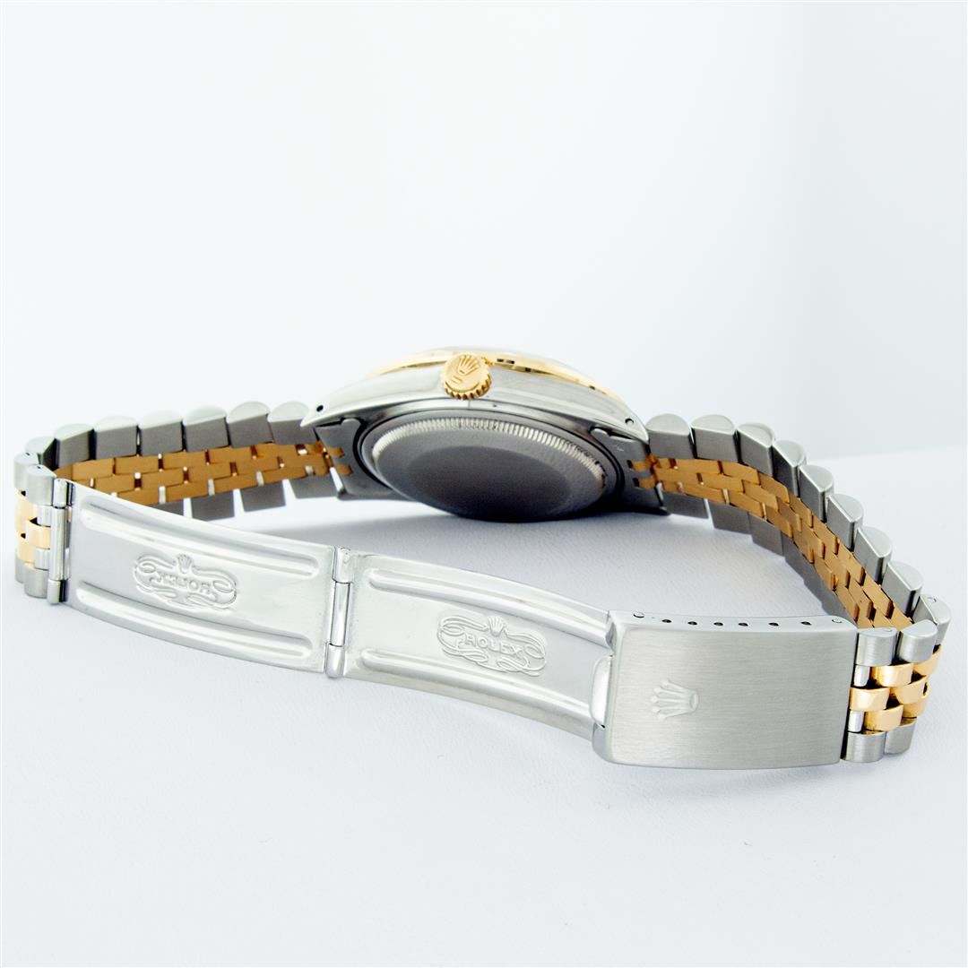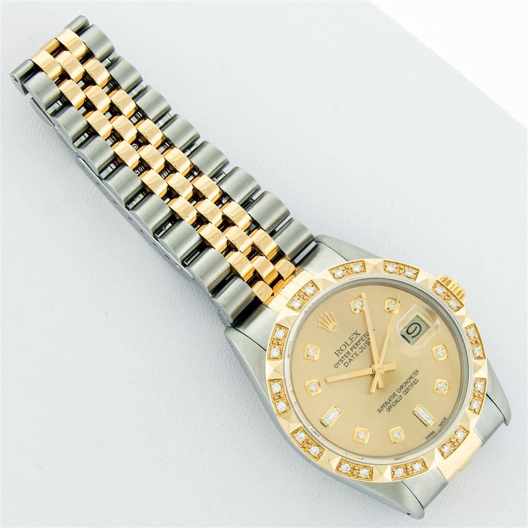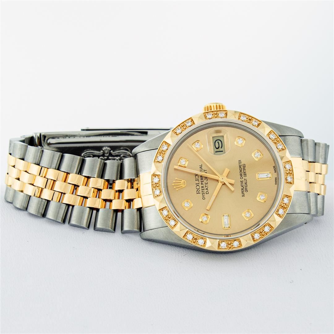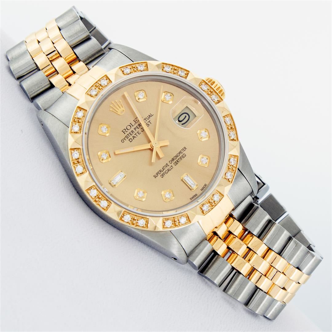 One Mens Pre Owned Yellow Gold Rolex Datejust Polished Bright with Satin Finish, Serviced & Electronically Tested, Rolex Stainless Steel Case: 36mm, Yellow Gold Crown, Custom Bezel: New 18K Yellow Gold Pyramid Diamond Bezel, Diamond Count: 24 Diamonds, Clarity: SI-VS, Color: G to H. Custom Crystal: New Sapphire Magnified Date. Custom Hands: New Luminescent Hands. Rolex Movement: Automatic Winding Movement. Custom Dial: Refinished Champagne Custom Diamonds, Diamond Count: 8 Diamonds + 2 Baguette Diamonds In Dial, Color: G to H, Clarity: VS. Date Window: 3 O'Clock Position Date Display, Quickset, Model: Datejust. Condition: G-6 Extra Fine. Rolex Bracelet: Yellow Gold And Stainless Steel Jubilee Band. Bright Polish & Satin Finish. 7.0 Inch Length, Adjustable. Standard Clasp, With Rolex Logo. This Watch Has Been Serviced And Polished It Is Free Of All Scratches And Dents.