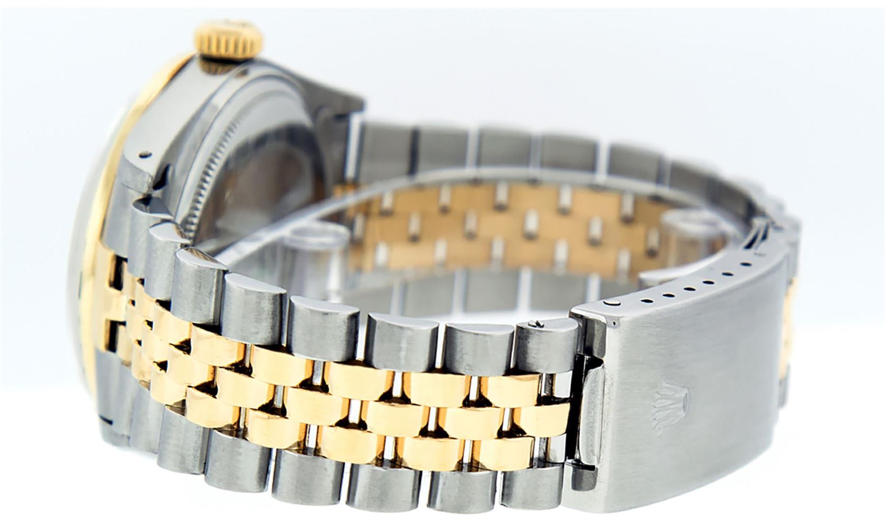 One Mens Pre Owned Yellow Gold Two Tone Rolex Datejust Polished, Serviced & Electronically Tested, Yellow Gold & Stainless Steel Case: 36mm, Yellow Gold Crown, Custom Bezel: New 18K Yellow Gold Ruby Bead set Diamond Bezel, Diamond Count: 36 Diamonds + 4 Rubies, Clarity: SI-VS, Color: G to H. Custom Crystal: New Sapphire With Date Window. Custom Hands: New Luminescent Hands. Rolex Movement: Automatic Winding Movement. Custom Dial: Champagne Dial With Custom Added Diamond Hour Markers. Diamond Count: 10 Diamonds In Dial, Clarity: SI-VS, Color: Color G to H Date Window: 3 O'clock Position Date Display, Quickset, Model: Datejust. Condition: G-6 Extra Fine. Rolex Bracelet: Two Tone Yellow Gold & Stainless Steel Jubilee. Bright Polish. 7.0 Inch Length, Adjustable. Standard Clasp, With Rolex Logo. This Watch Has Been Serviced Time Tested And Is In Excellent Condition It Is Free Of All Scratches And Dents.