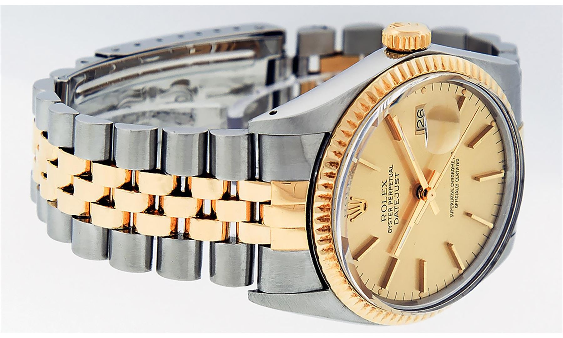 One Rolex Mens Pre Owned Yellow Gold And Stainless Steel Rolex Datejust Polished, Serviced & Electronically Tested, Yellow Gold & Stainless Steel Case: 36mm,14K Yellow Gold Crown, Bezel: 14K Yellow Gold Fluted Bezel. Custom Crystal: New Acrylic Cyclops Lens. Hands: Luminescent Hands. Rolex Movement: Automatic Winding Movement 3035. Rolex Dial: Champagne Dial With Index Hour Markers With Dash Track & Lumi Dots. Date Window: 3 O'Clock Position Date Display, Quickset, Model: Quickset Datejust. Condition: G-6 Extra Fine. Rolex Bracelet: 14K Two Tone Yellow Gold & Stainless Steel Jubilee Band. Bright Polish. 7.0 Inch Length, Adjustable. Standard Clasp, With Rolex Logo. This Watch Has Been Serviced Time Tested And Is In Excellent Condition It Is Free Of All Scratches And Dents.