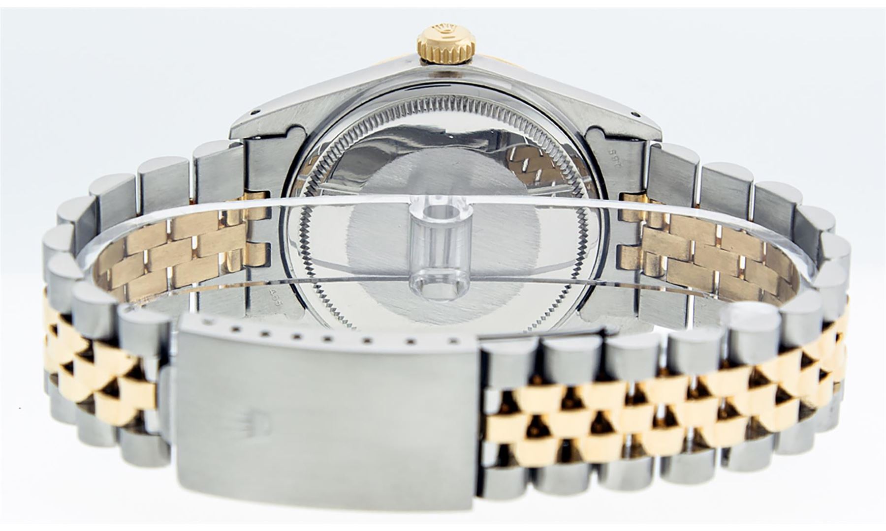 One Mens Yellow Gold Two Tone Rolex Datejust Polished, Serviced & Electronically Tested, Yellow Gold & Stainless Steel Case: 36mm, Yellow Gold Crown, Bezel: Yellow Gold Fluted Bezel. Custom Crystal: New Acrylic Cyclops Lens. Hands: Luminescent Hands. Movement: Automatic Winding Movement. Dial: Champagne Index Dial With Dash Track & Lumi Dots. Date Window: 3 O'Clock Position Date Display, Quickset, Model: Datejust. Condition: G-6 Extra Fine. Bracelet: Two Tone Yellow Gold & Stainless Steel Jubilee Band. Bright Polish. 7.0 Inch Length, Adjustable. Standard Clasp, With Rolex Logo. This Watch Has Been Serviced Time Tested And Is In Excellent Condition It Is Free Of All Scratches And Dents.
