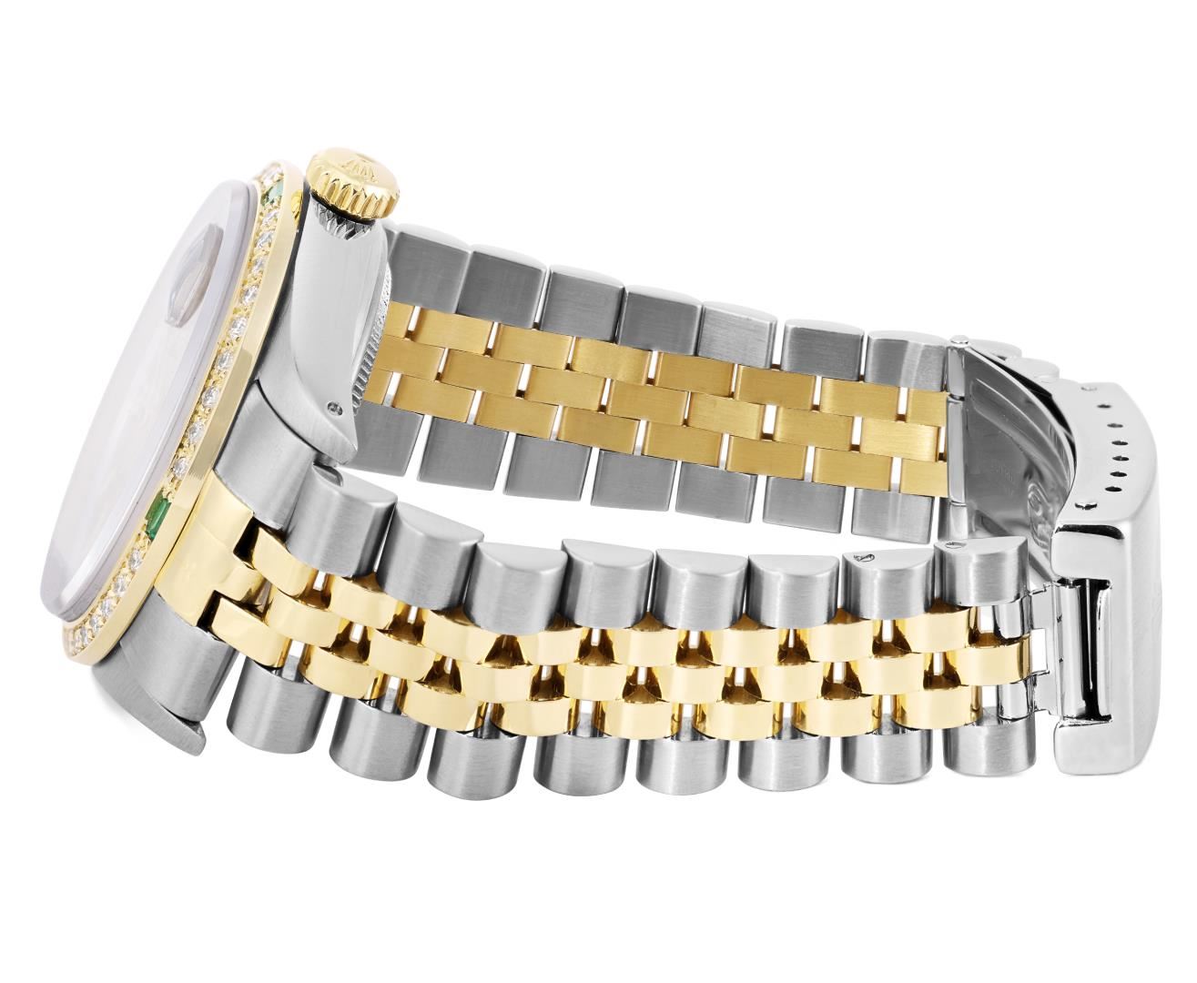 One Mens Pre Owned Two Tone Yellow Gold And Stainless Steel Rolex Datejust Polished, Serviced & Electronically Tested, Yellow Gold And Stainless Steel Case: 36mm, Rolex Yellow Gold Crown, Custom Bezel: New 18K Yellow Gold Emerald Beadset Diamond Bezel, Diamond Count: 36 Diamonds + 4 Sapphires, Clarity: SI-VS, Color: G to H. Custom Crystal: New Sapphire With Magnified Date Window. Custom Hands: New Hands. Rolex Movement: Automatic Winding Movement 3035. Rolex Factory Dial: Champagne Index With Dash Track And Lumi Dots. Date Window: 3 O'Clock Position Date Display, Quickset, Model: Quickset Datejust. Condition: G-6 Extra Fine. Rolex Bracelet: Two Tone Yellow Gold And Stainless Steel Jubilee Band. Bright Polish. 7.0 Inch Length, Adjustable. Standard Clasp, With Rolex Logo. This Watch Has Been Serviced Time Tested And Is In Excellent Condition It Is Free Of All Scratches And Dents.