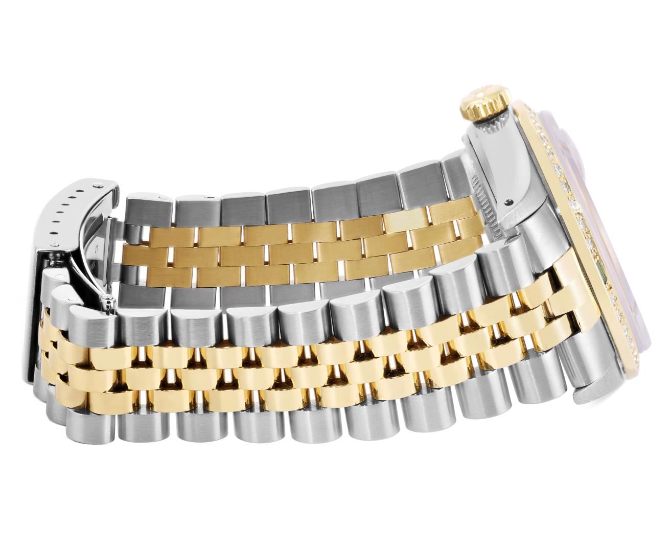 One Mens Pre Owned Two Tone Yellow Gold And Stainless Steel Rolex Datejust Polished, Serviced & Electronically Tested, Yellow Gold And Stainless Steel Case: 36mm, Rolex Yellow Gold Crown, Custom Bezel: New 18K Yellow Gold Emerald Beadset Diamond Bezel, Diamond Count: 36 Diamonds + 4 Sapphires, Clarity: SI-VS, Color: G to H. Custom Crystal: New Sapphire With Magnified Date Window. Custom Hands: New Hands. Rolex Movement: Automatic Winding Movement 3035. Rolex Factory Dial: Champagne Index With Dash Track And Lumi Dots. Date Window: 3 O'Clock Position Date Display, Quickset, Model: Quickset Datejust. Condition: G-6 Extra Fine. Rolex Bracelet: Two Tone Yellow Gold And Stainless Steel Jubilee Band. Bright Polish. 7.0 Inch Length, Adjustable. Standard Clasp, With Rolex Logo. This Watch Has Been Serviced Time Tested And Is In Excellent Condition It Is Free Of All Scratches And Dents.