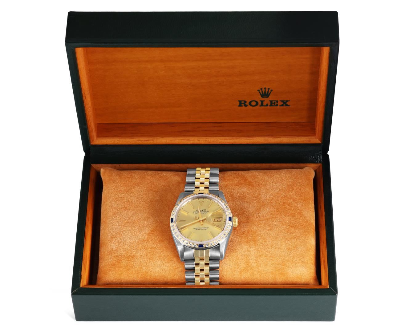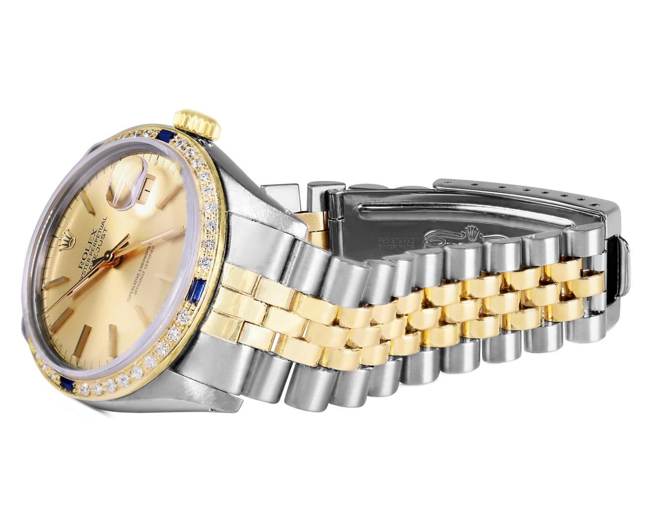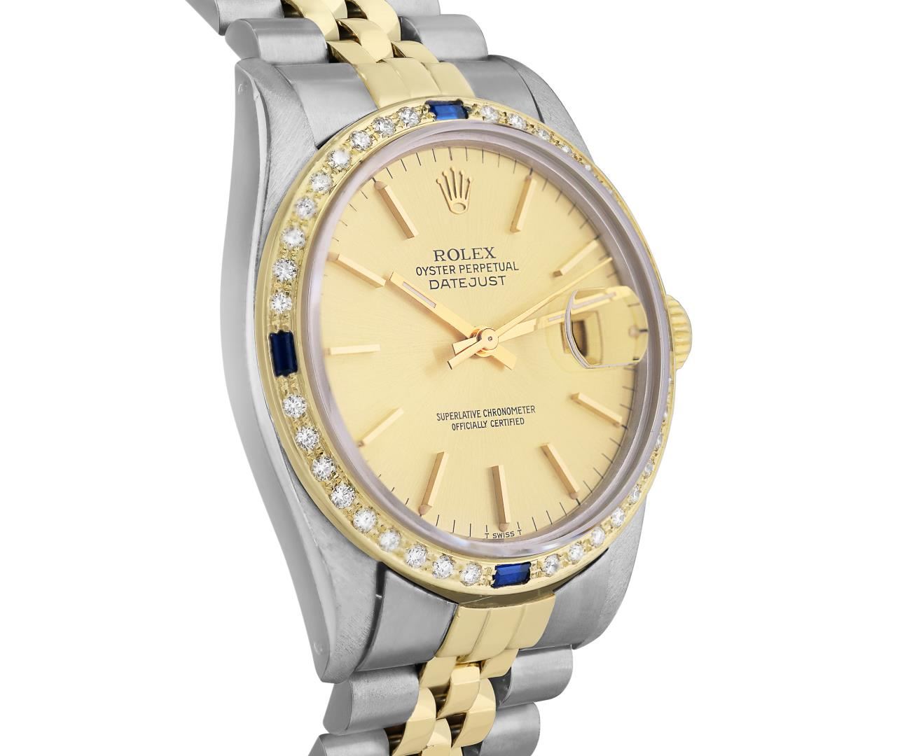 One Mens Pre Owned Two Tone Yellow Gold And Stainless Steel Rolex Datejust Polished, Serviced And Electronically Tested, Yellow Gold And Stainless Steel Case: 36mm, Rolex Yellow Gold Crown, Custom Bezel: New 18K Yellow Gold Sapphire Beadset Diamond Bezel, Diamond Count: 36 Diamonds + 4 Sapphires. Custom Crystal: New Sapphire With Magnified Date Window. Custom Hands: New Hands. Rolex Movement: Automatic Winding Movement 3035. Rolex Factory Dial: Champagne Index With Dash Track And Lumi Dots. Date Window: 3 O'Clock Position Date Display, Quickset, Model: Quickset Datejust. Condition: G-6 Extra Fine. Rolex Bracelet: Two Tone Yellow Gold And Stainless Steel Jubilee Band. Bright Polish. 7.0 Inch Length, Adjustable. Standard Clasp, With Rolex Logo. This Watch Has Been Serviced Time Tested And Is In Excellent Condition It Is Free Of All Scratches And Dents.