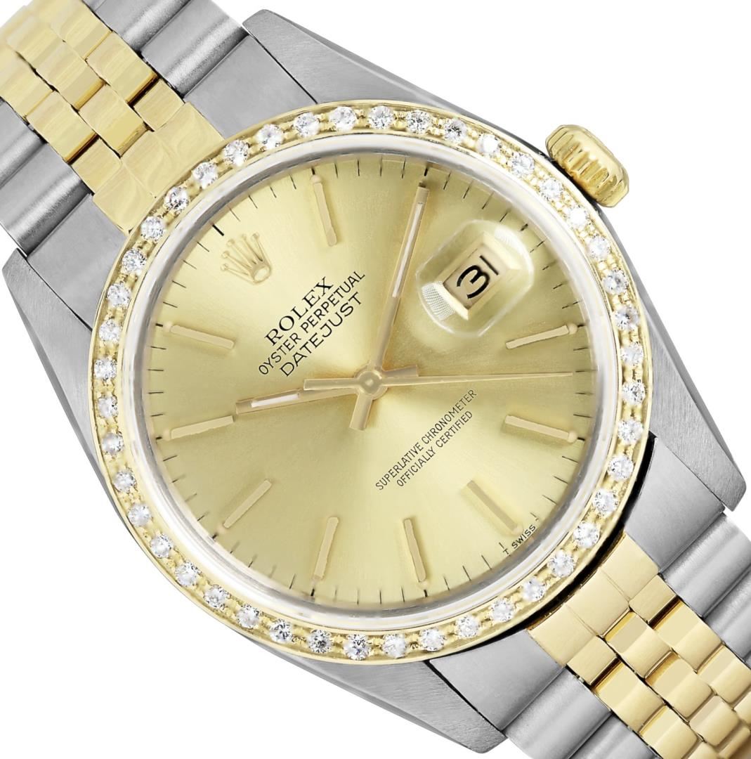 One Mens Pre Owned Yellow Gold Two Tone Rolex Datejust Polished, Serviced & Electronically Tested, Rolex Yellow Gold And Stainless Steel Case: 36mm, Rolex Yellow Gold Crown, Custom Bezel: New 18K Yellow Gold Beadset Diamond Bezel, Diamond Count: 44 Diamonds. Custom Crystal: New Sapphire With Magnified Date Window. Custom Hands: New Luminecent Hands. Rolex Movement: Automatic Winding Movement 3035. Rolex Dial: Champagne Dial With Index Hour Markers and Dash Track With Lumi Dots. Date Window: 3 O'Clock Position Date Display, Quickset, Model: Quickset Datejust. Condition: G-6 Extra Fine. Rolex Bracelet: Two Tone Yellow Gold & Stainless Steel Jubilee Band. Bright Polish. 7.0 Inch Length, Adjustable. Standard Clasp, With Rolex Logo. This Watch Has Been Serviced Time Tested And Is In Excellent Condition It Is Free Of All Scratches And Dents.