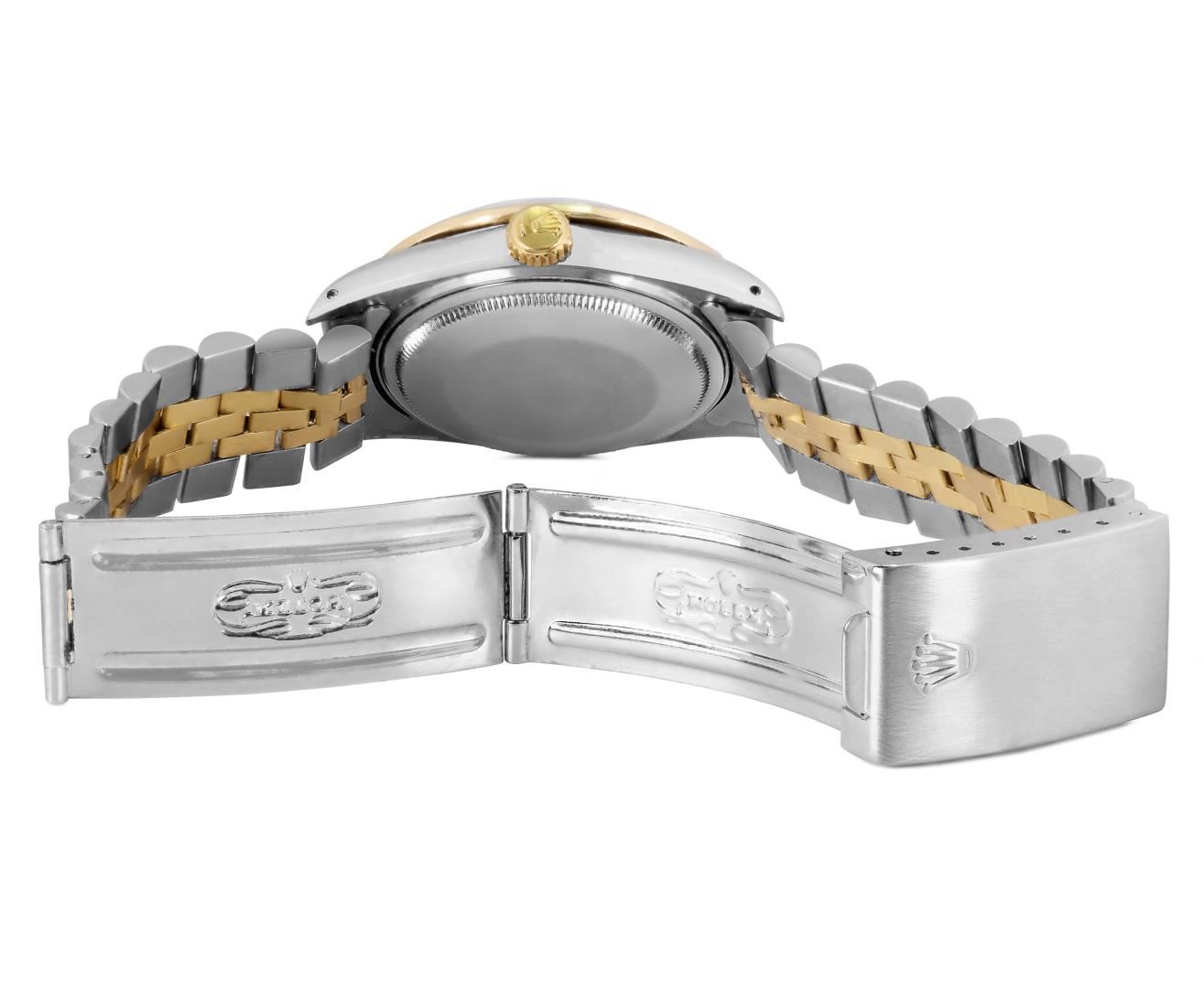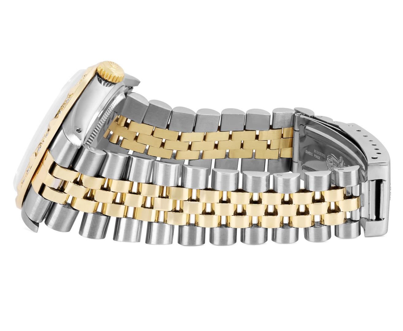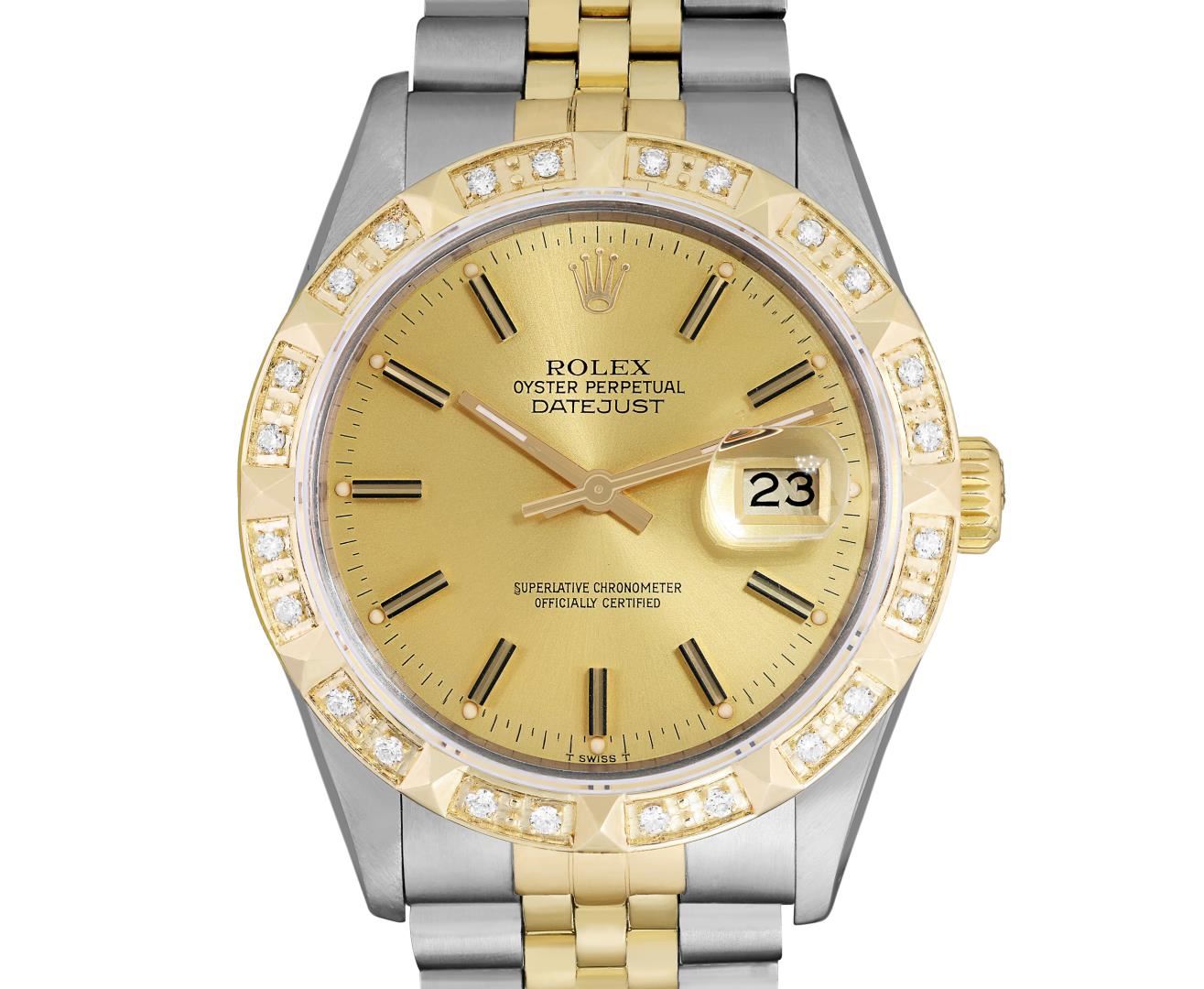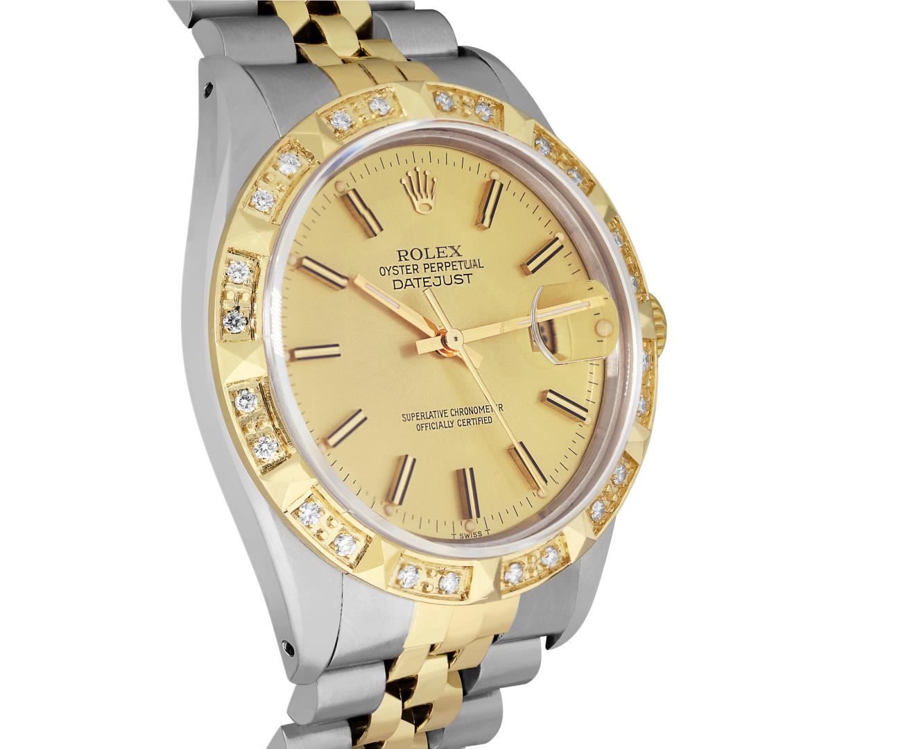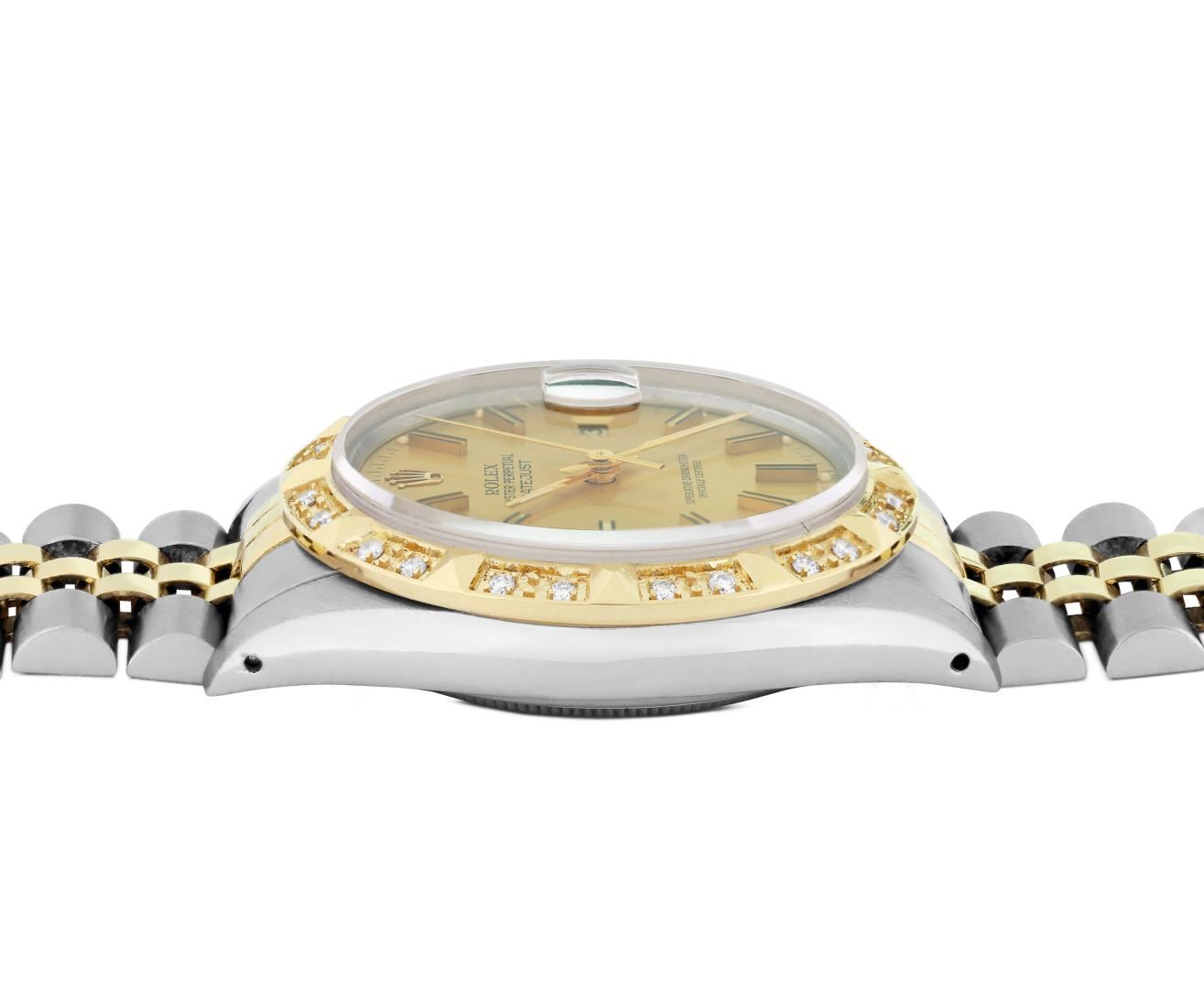 One Mens Pre Owned Yellow Gold Two Tone Rolex Datejust Polished, Serviced & Electronically Tested, Rolex Yellow Gold & Stainless Steel Case: 36mm, Rolex Yellow Gold Crown, Custom Bezel: New 18K Yellow Gold Pyramid Diamond Bezel, Diamond Count: 24 Diamonds. Custom Crystal: New Sapphire With Magnified Date Window. Custom Hands: New Luminecent Hands. Rolex Movement: Automatic Winding Movement 3035. Rolex Dial: Champagne Dial With Index Hour Markers and Small Track With Lumi Dots. Date Window: 3 O'Clock Position Date Display, Quickset, Model: Quickset Datejust. Condition: G-6 Extra Fine. Rolex Bracelet: Two Tone Yellow Gold And Stainless Steel Jubilee Band. Bright Polish. 7.0 Inch Length, Adjustable. Standard Clasp, With Rolex Logo. This Watch Has Been Serviced Time Tested And Is In Excellent Condition It Is Free Of All Scratches And Dents. This Watch Comes With A Rolex Box.
