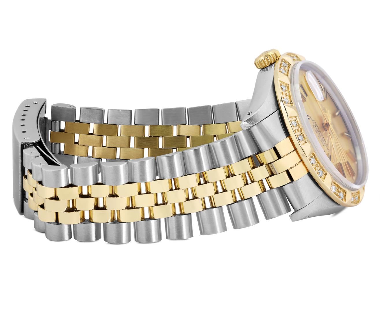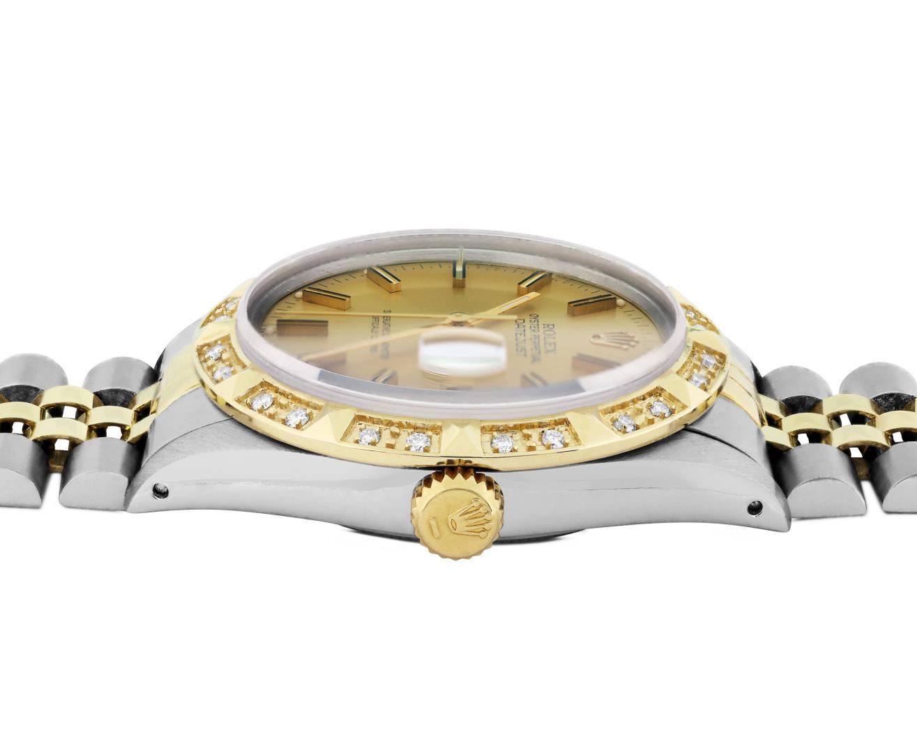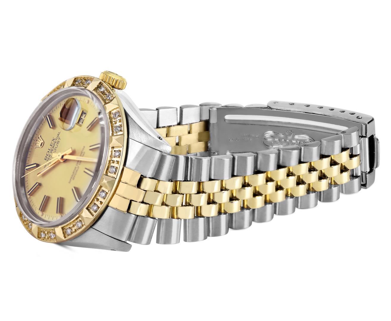 One Mens Pre Owned Yellow Gold Two Tone Rolex Datejust Polished, Serviced & Electronically Tested, Rolex Yellow Gold & Stainless Steel Case: 36mm, Rolex Yellow Gold Crown, Custom Bezel: New 18K Yellow Gold Pyramid Diamond Bezel, Diamond Count: 24 Diamonds. Custom Crystal: New Sapphire With Magnified Date Window. Custom Hands: New Luminecent Hands. Rolex Movement: Automatic Winding Movement 3035. Rolex Dial: Champagne Dial With Index Hour Markers and Small Track With Lumi Dots. Date Window: 3 O'Clock Position Date Display, Quickset, Model: Quickset Datejust. Condition: G-6 Extra Fine. Rolex Bracelet: Two Tone Yellow Gold And Stainless Steel Jubilee Band. Bright Polish. 7.0 Inch Length, Adjustable. Standard Clasp, With Rolex Logo. This Watch Has Been Serviced Time Tested And Is In Excellent Condition It Is Free Of All Scratches And Dents. This Watch Comes With A Rolex Box.