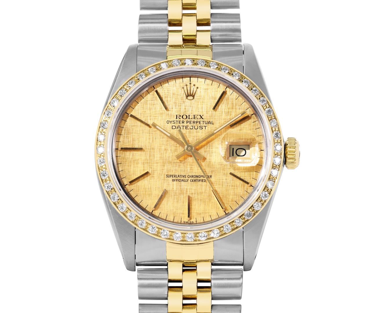 One Mens Pre Owned Yellow Gold Two Tone Rolex Datejust Polished, Serviced And Electronically Tested, Rolex Yellow Gold And Stainless Steel Case: 36mm, Rolex Yellow Gold Crown, Custom Bezel: New 18K Yellow Gold Beadset Diamond Bezel, Diamond Count: 44 Diamonds. Custom Crystal: New Sapphire With Magnified Date Window. Custom Hands: New Luminecent Hands. Rolex Movement: Automatic Winding Movement 3035. Rolex Dial: Champagne Linen Dial With Index Hour Markers and Dash Track With Lumi Dots. Date Window: 3 O'Clock Position Date Display, Quickset, Model: Quickset Datejust. Condition: G-6 Extra Fine. Rolex Bracelet: Two Tone Yellow Gold And Stainless Steel Jubilee Band. Bright Polish. 7.0 Inch Length, Adjustable. Standard Clasp, With Rolex Logo. This Watch Has Been Serviced Time Tested And Is In Excellent Condition It Is Free Of All Scratches And Dents.