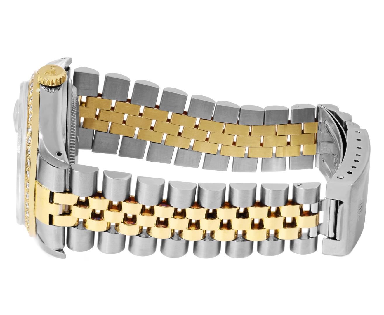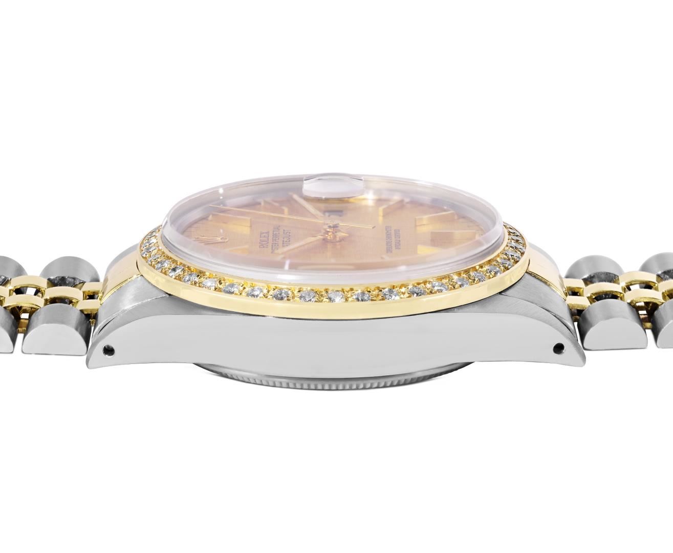One Mens Pre Owned Yellow Gold Two Tone Rolex Datejust Polished, Serviced And Electronically Tested, Rolex Yellow Gold And Stainless Steel Case: 36mm, Rolex Yellow Gold Crown, Custom Bezel: New 18K Yellow Gold Beadset Diamond Bezel, Diamond Count: 44 Diamonds. Custom Crystal: New Sapphire With Magnified Date Window. Custom Hands: New Luminecent Hands. Rolex Movement: Automatic Winding Movement 3035. Rolex Dial: Champagne Linen Dial With Index Hour Markers and Dash Track With Lumi Dots. Date Window: 3 O'Clock Position Date Display, Quickset, Model: Quickset Datejust. Condition: G-6 Extra Fine. Rolex Bracelet: Two Tone Yellow Gold And Stainless Steel Jubilee Band. Bright Polish. 7.0 Inch Length, Adjustable. Standard Clasp, With Rolex Logo. This Watch Has Been Serviced Time Tested And Is In Excellent Condition It Is Free Of All Scratches And Dents.